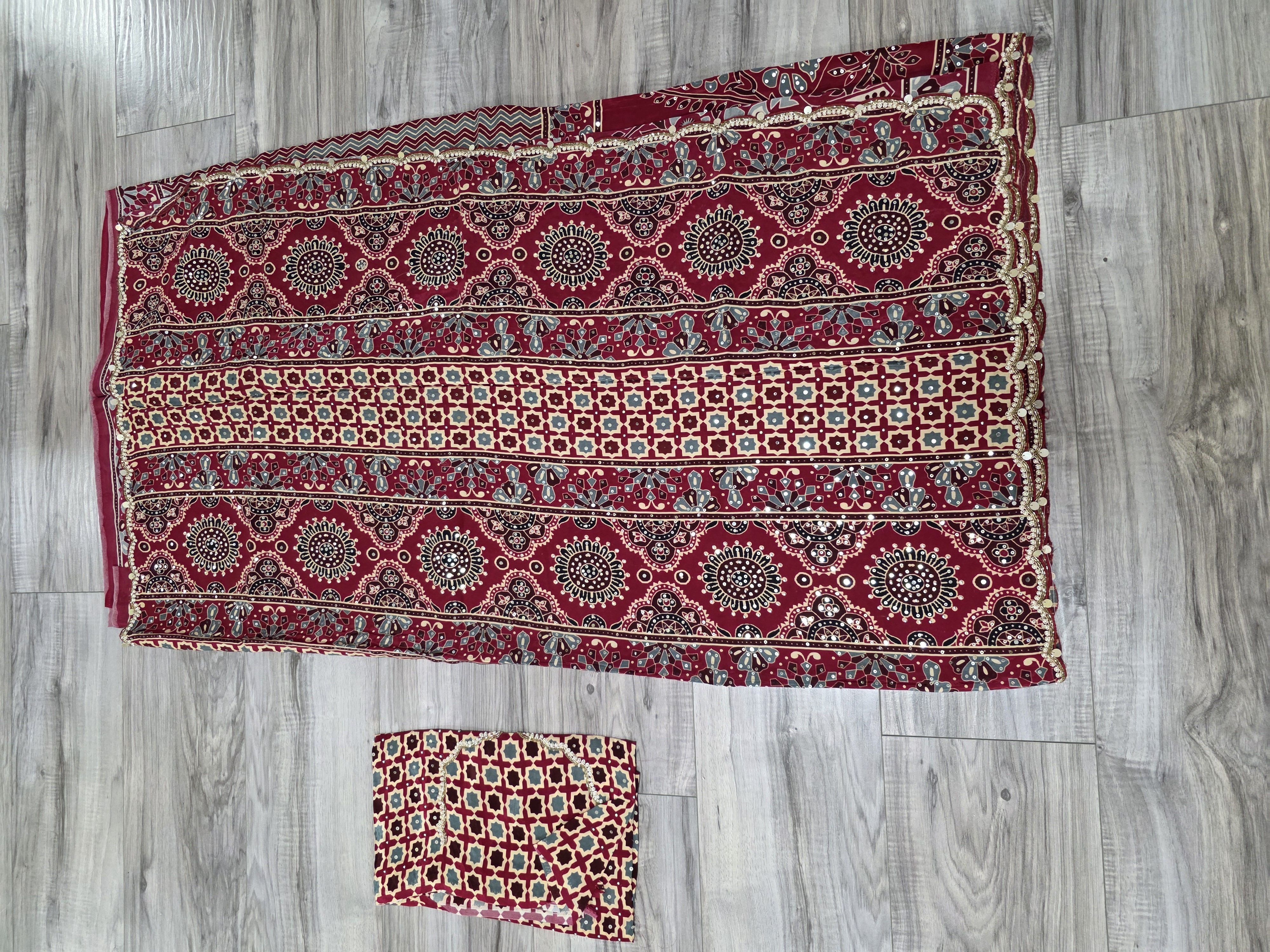 Maroon azrak print satin silk sari