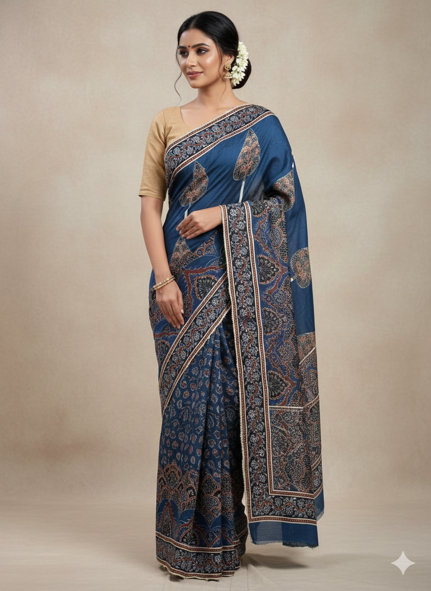 Dusty blue azrak print satin silk sari