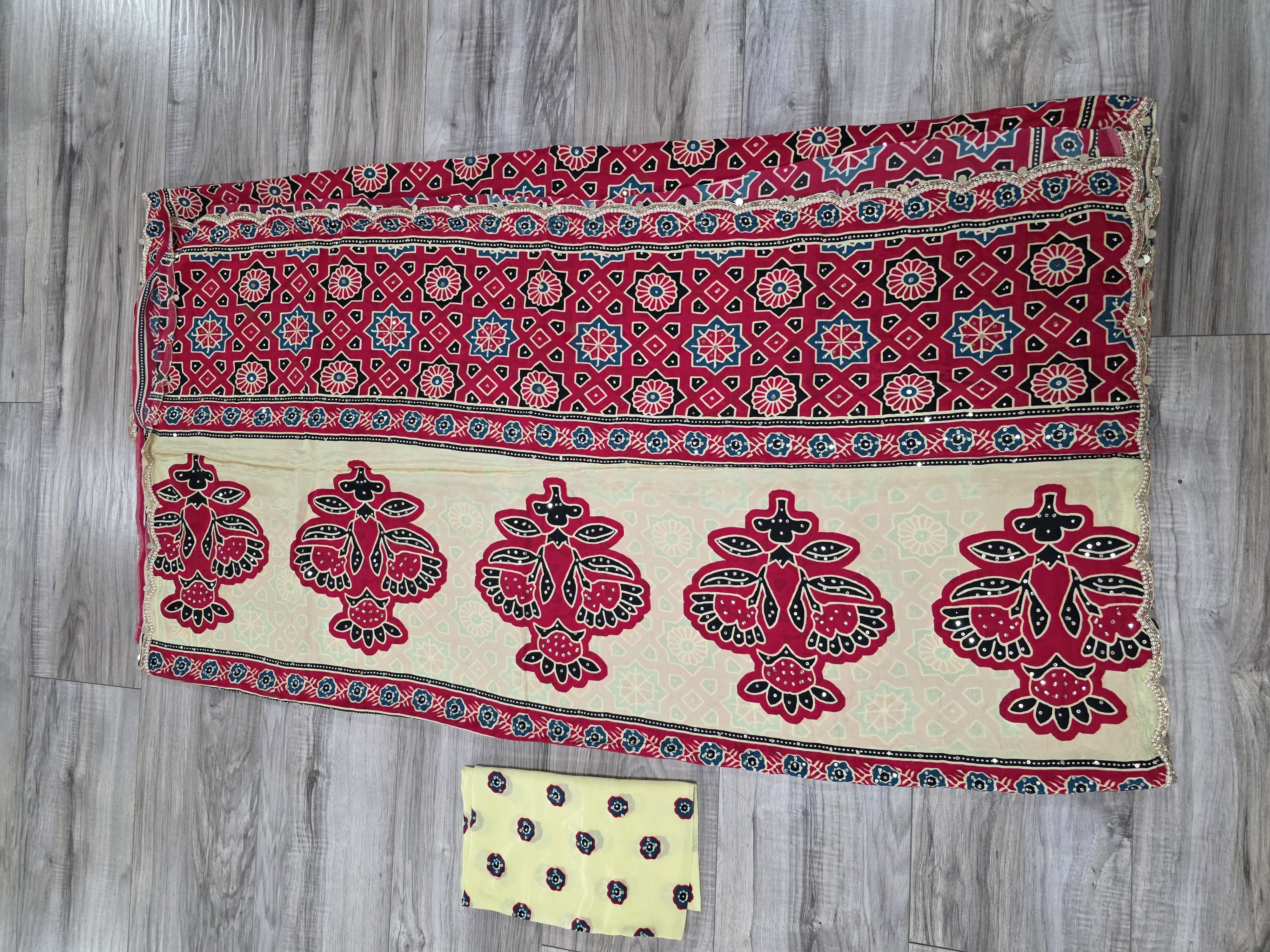 Red and cream azrak print satin silk sari