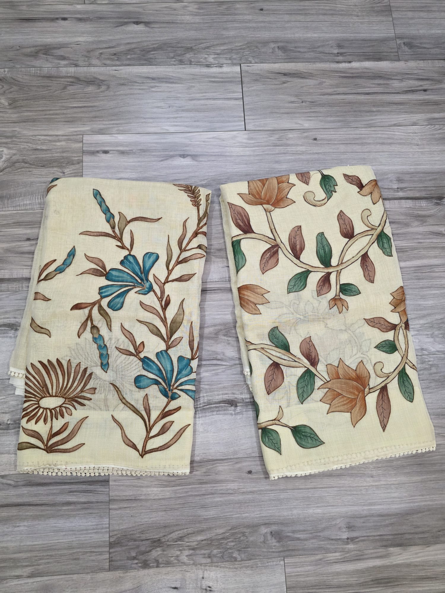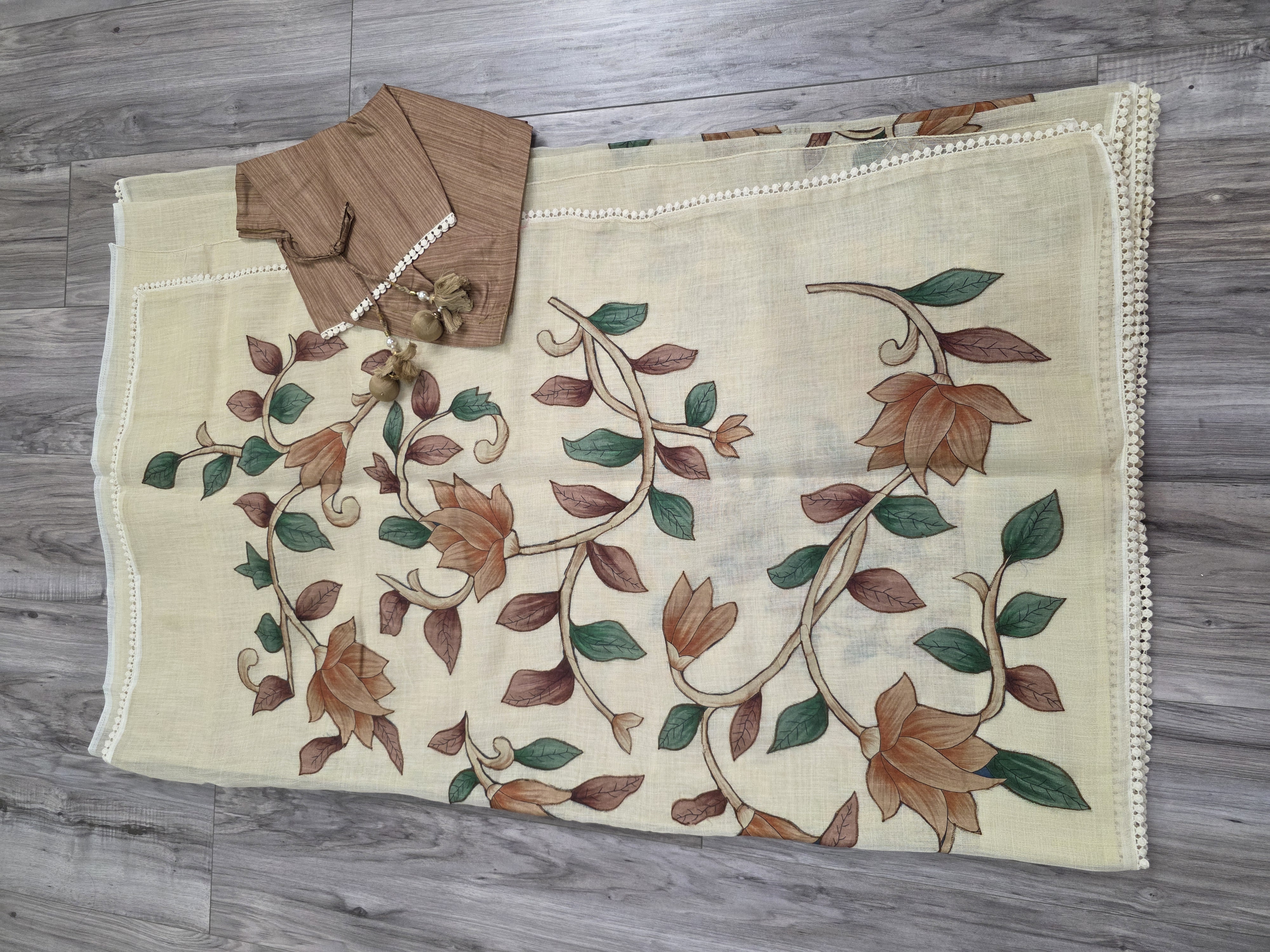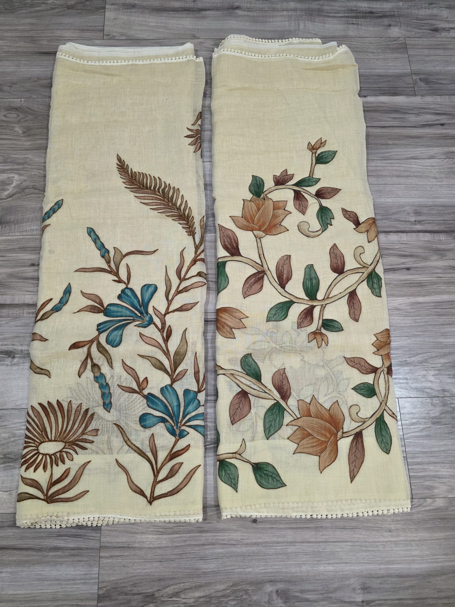 This cream color pure Kota zari sari has hand painted floral pattern with thread embroidery outline .
