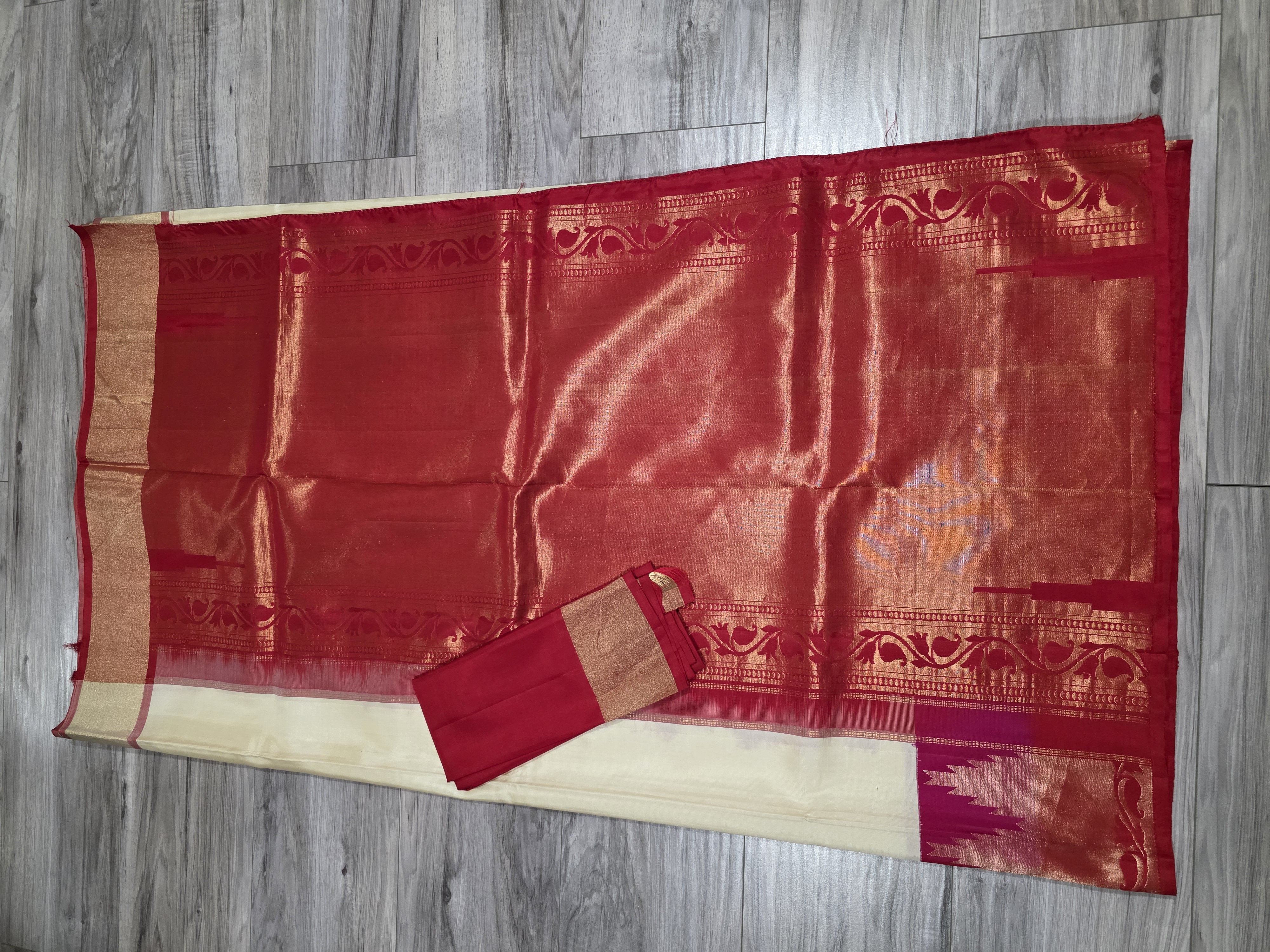 This cream color 100%pure kanjivaram silk sari has hot pink color wide border at the bottom with red color anchal, blouse and border on top.