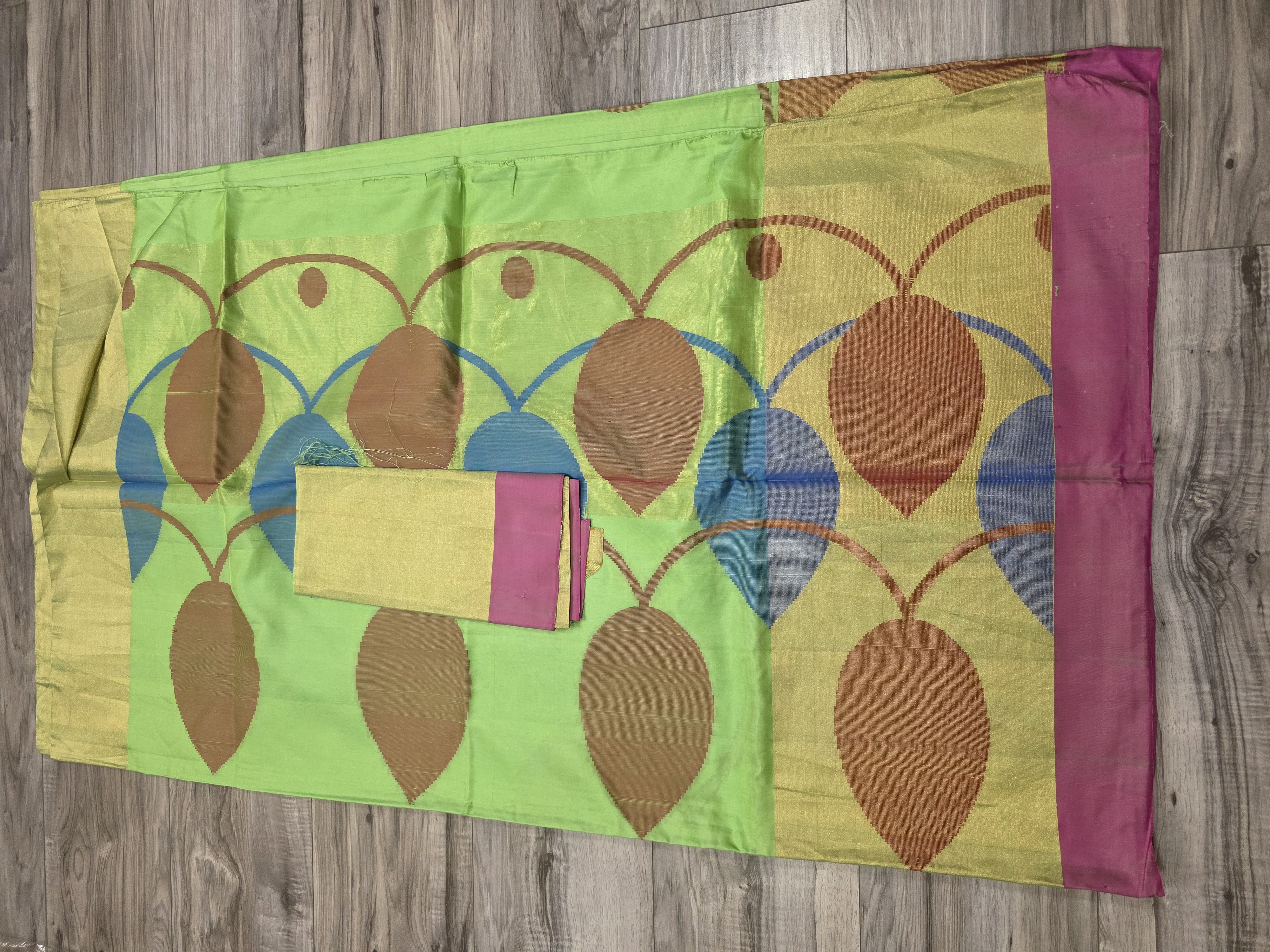 This mint green and pink combination sari is made in soft pure kanjivaram silk fabric