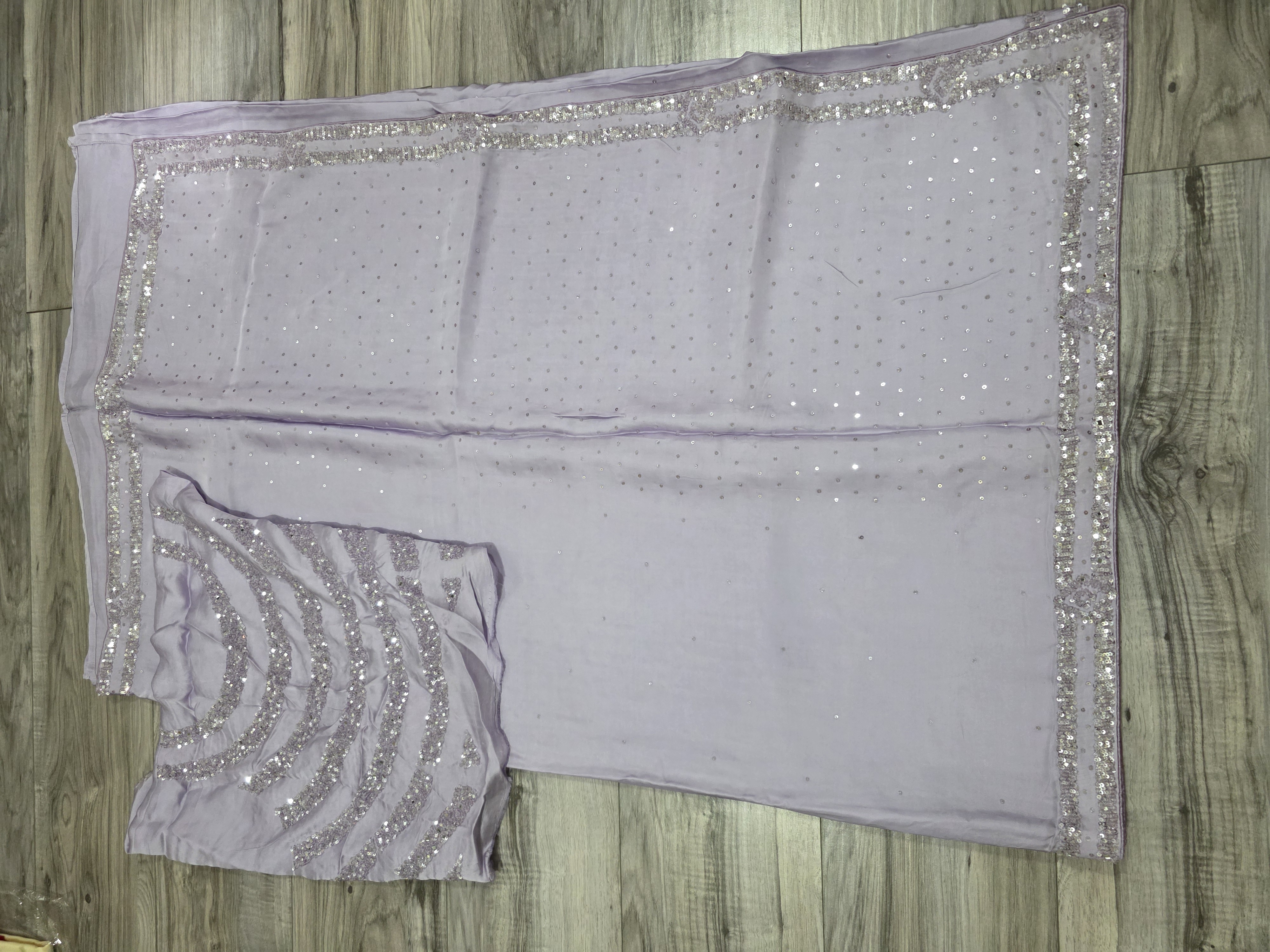 This light pastel mauve color sari is made in pure satin silk fabric with sequin hand work done all over the blouse and sari