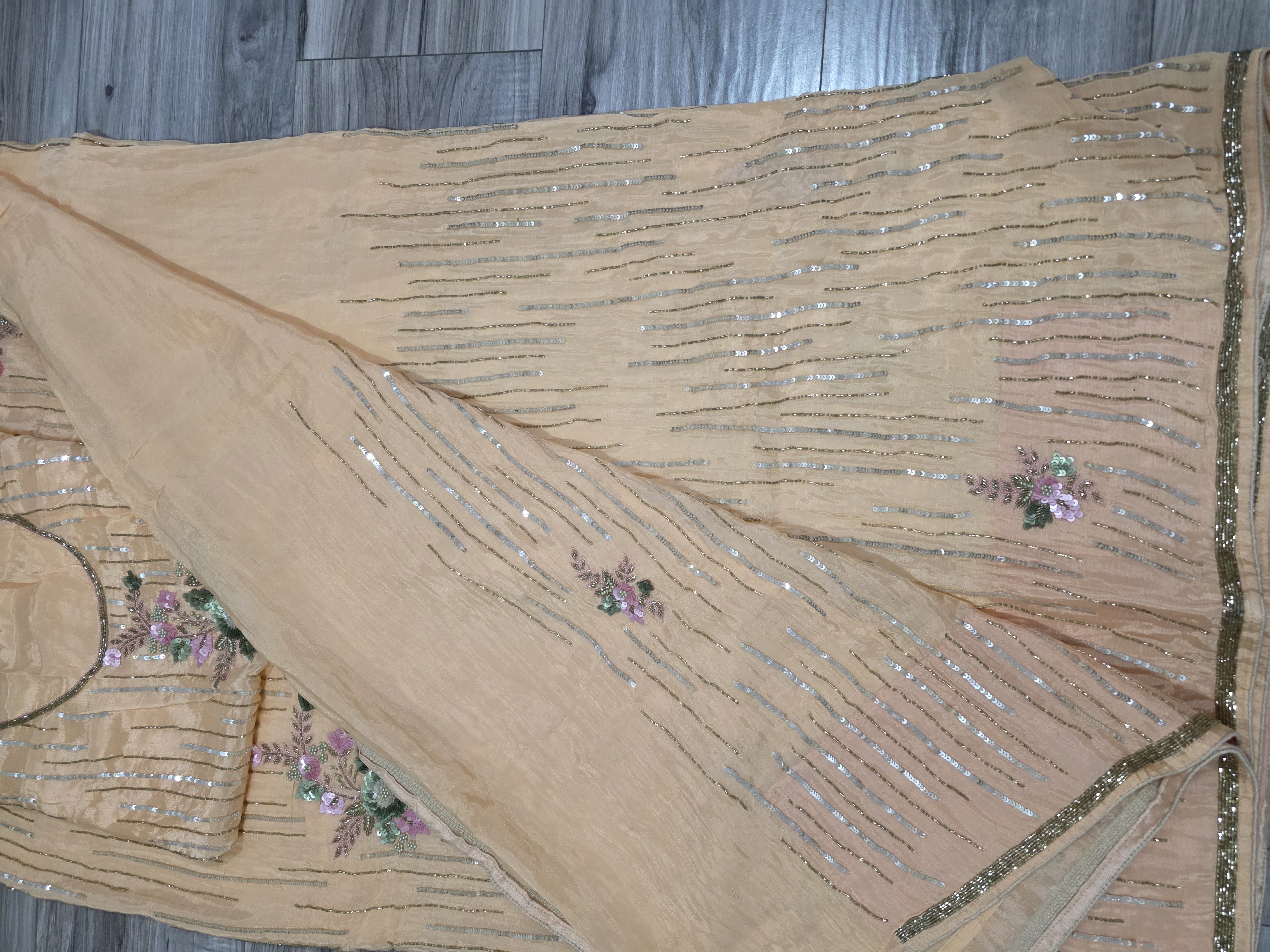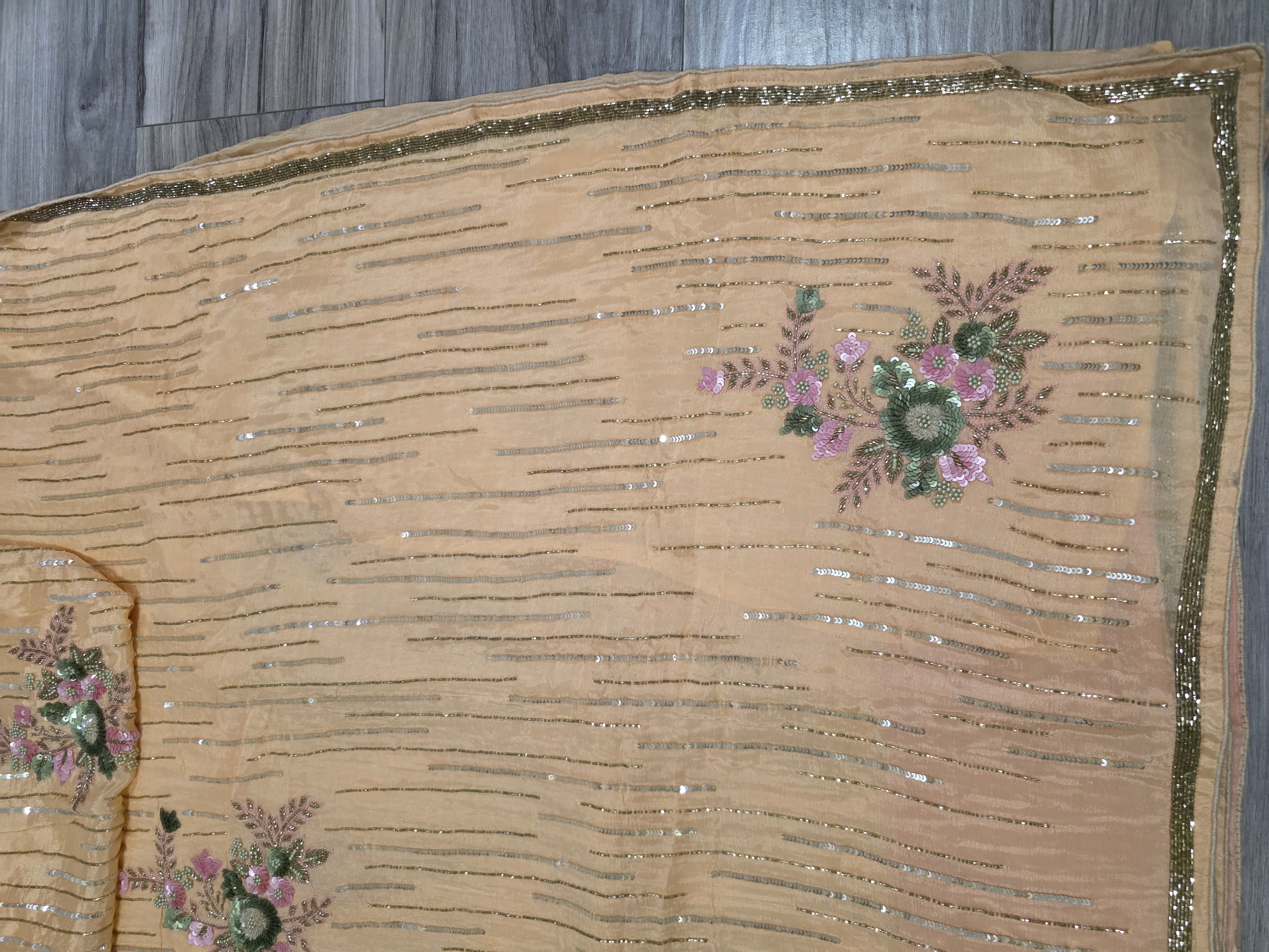 This peach color sari is made in pure crape silk fabric with fine kutdane , 3D sequin hand work done all over
