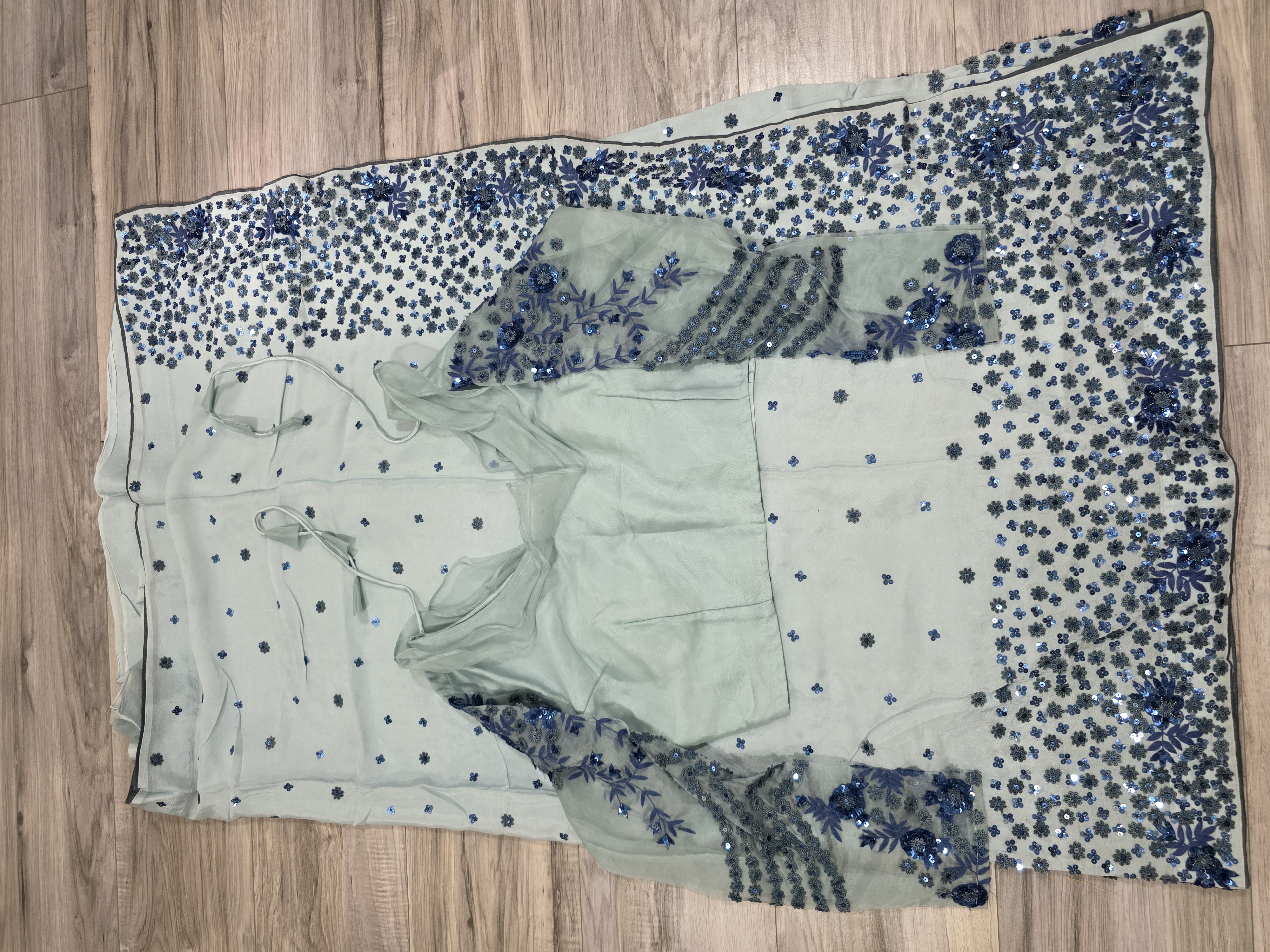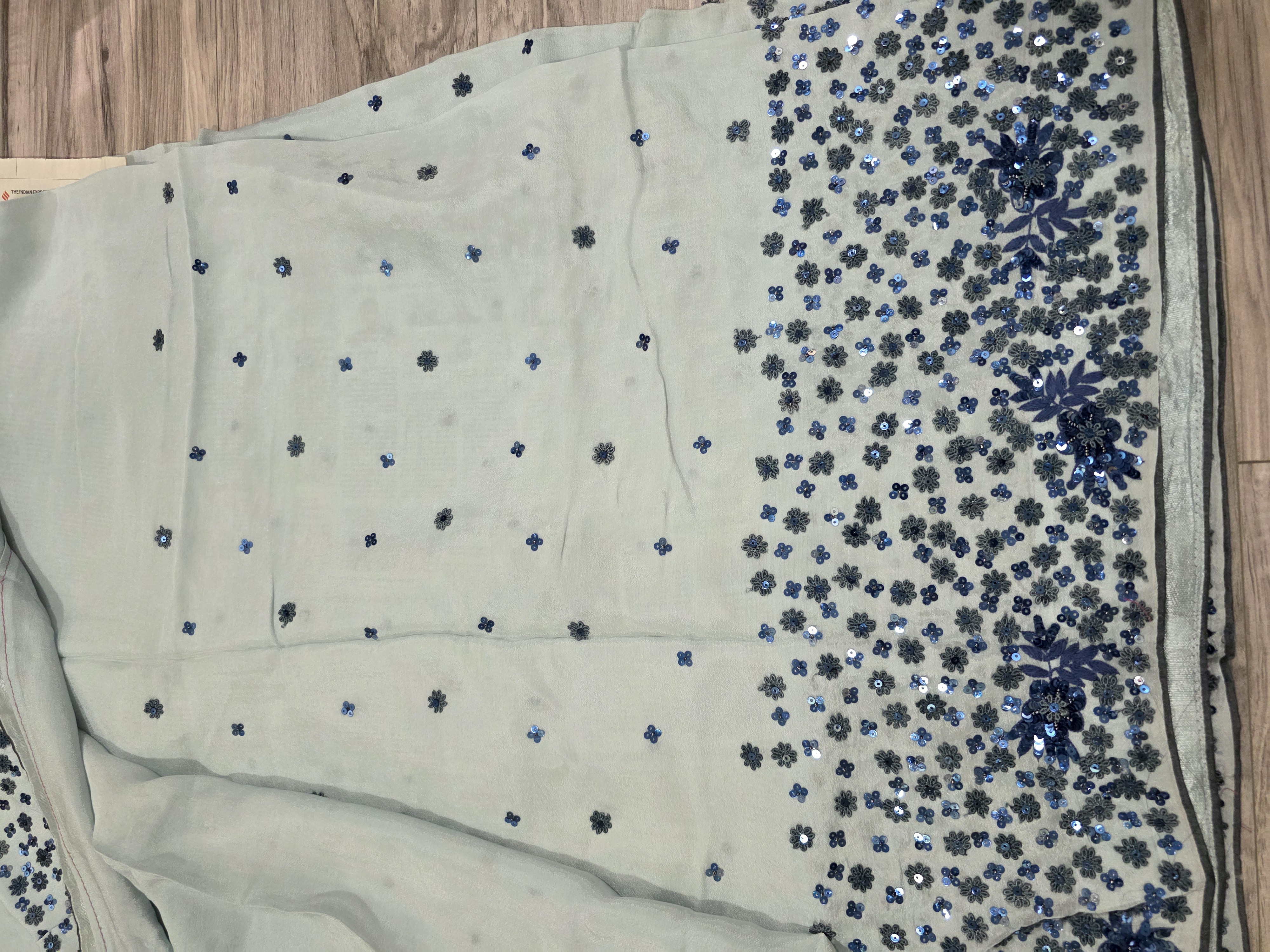 This ice blue pure crape silk fabric sari has fine sequin hand work done . Comes with fancy long sleeve work blouse