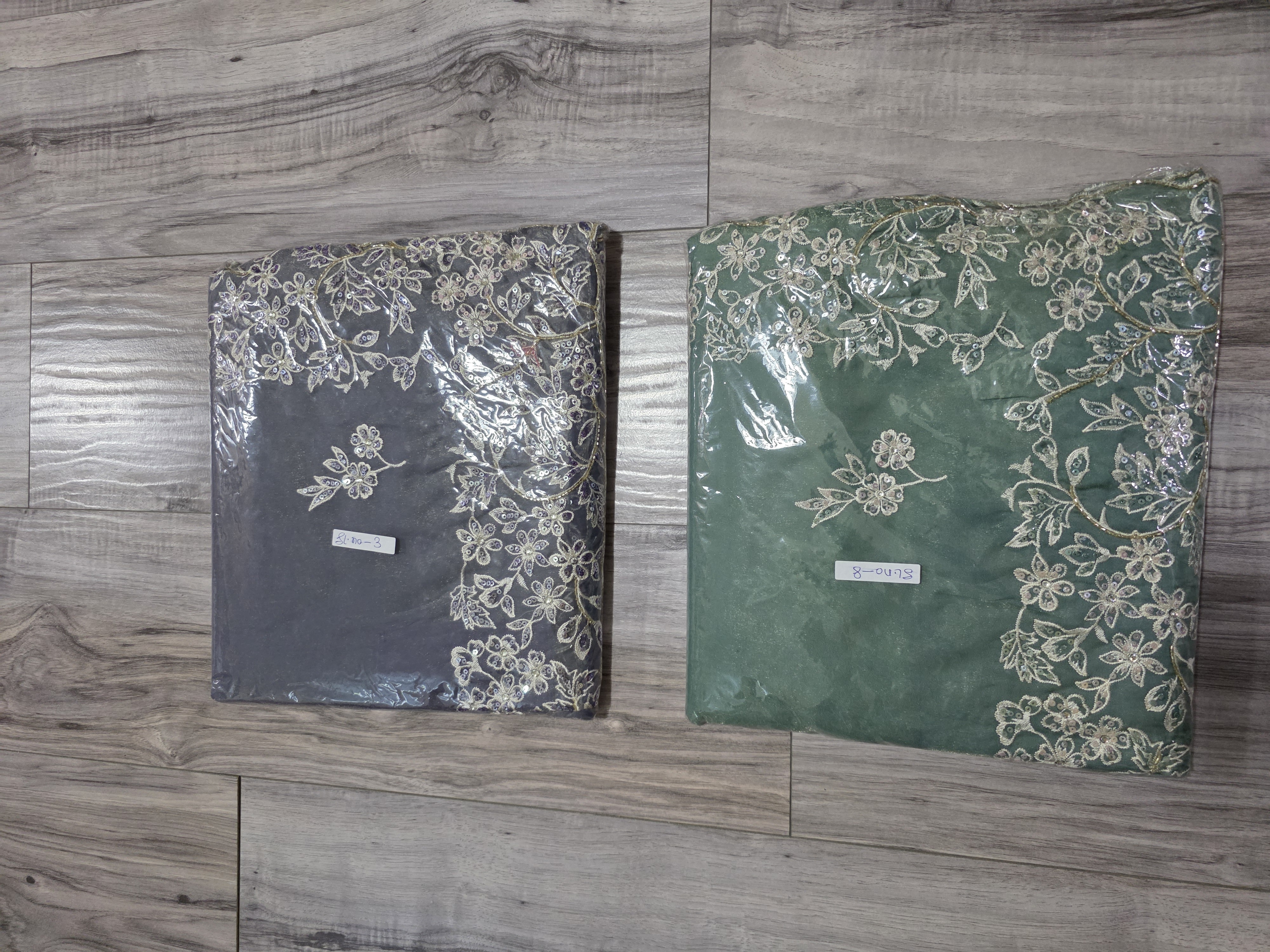 This pastel color sari are made in soft organza shimmer tissue fabric. Fine thread machine embroidery, sequin and kutdana work done all around the borders.