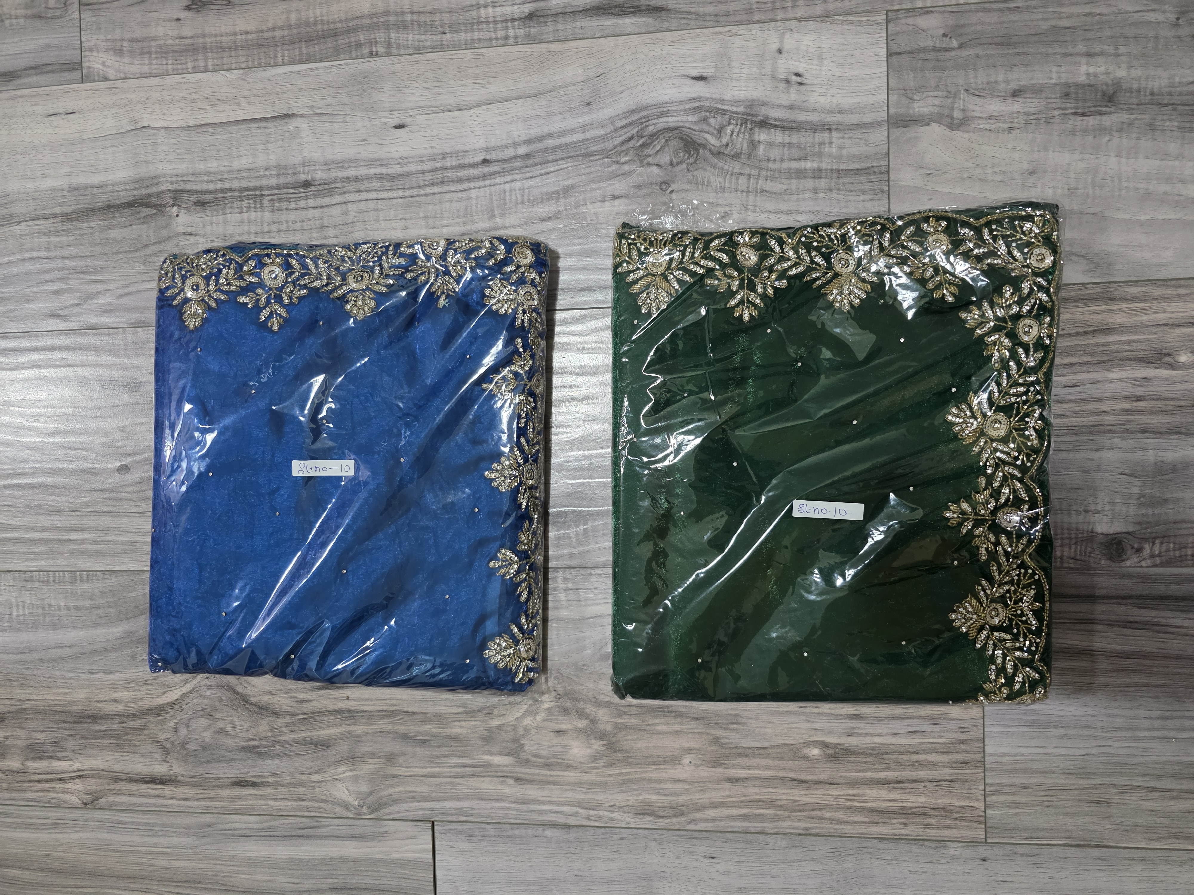 This jewel to e fancy party wear sari are made in soft gorgett tissue fabric. Has handwork stone, sequin and kutdana cutwork border all around the sari.