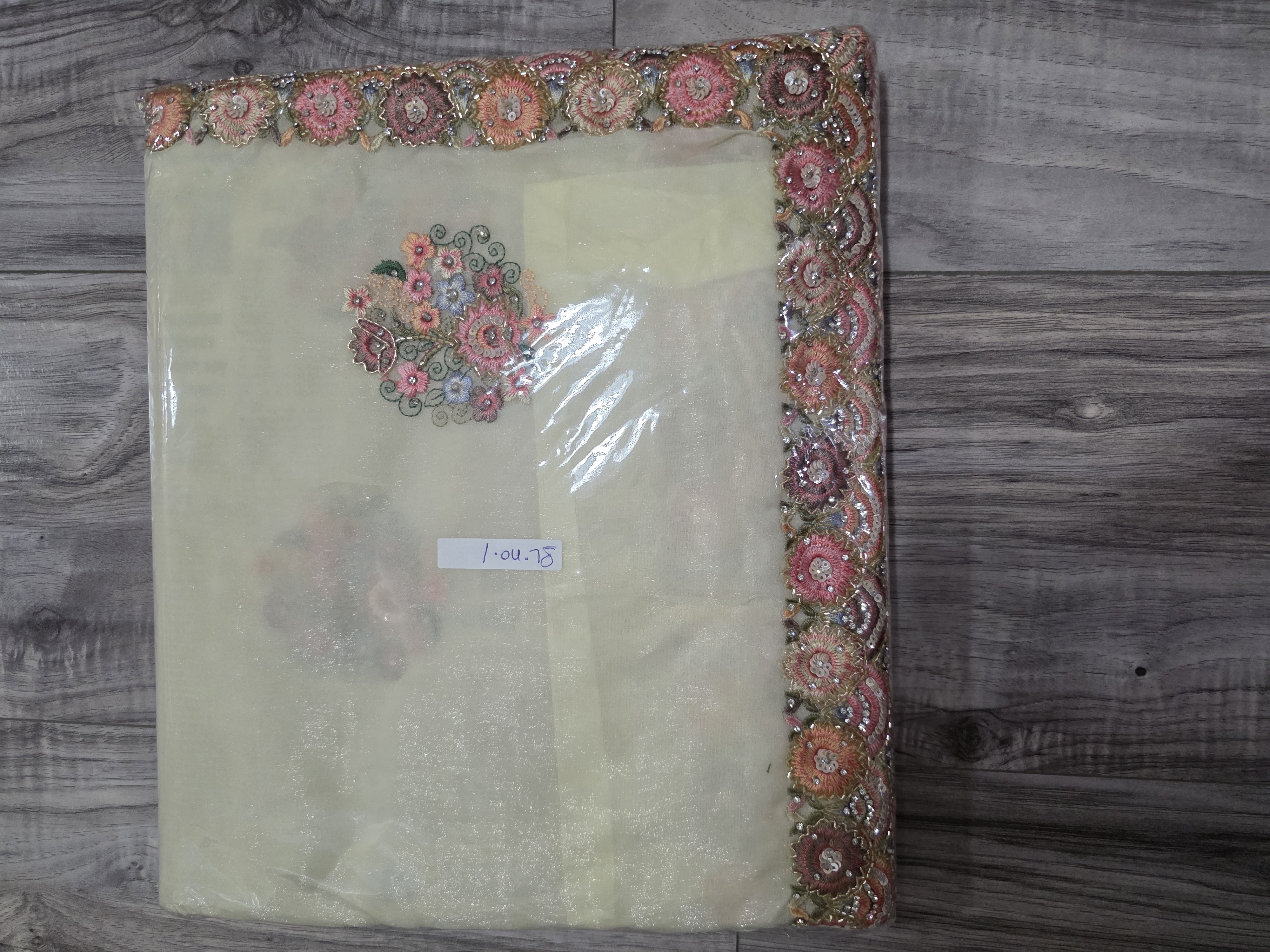 This fancy party wear sari is made in gorgett tissue fabric. Has fine thread embroidery and sequin, stone highlights all over .