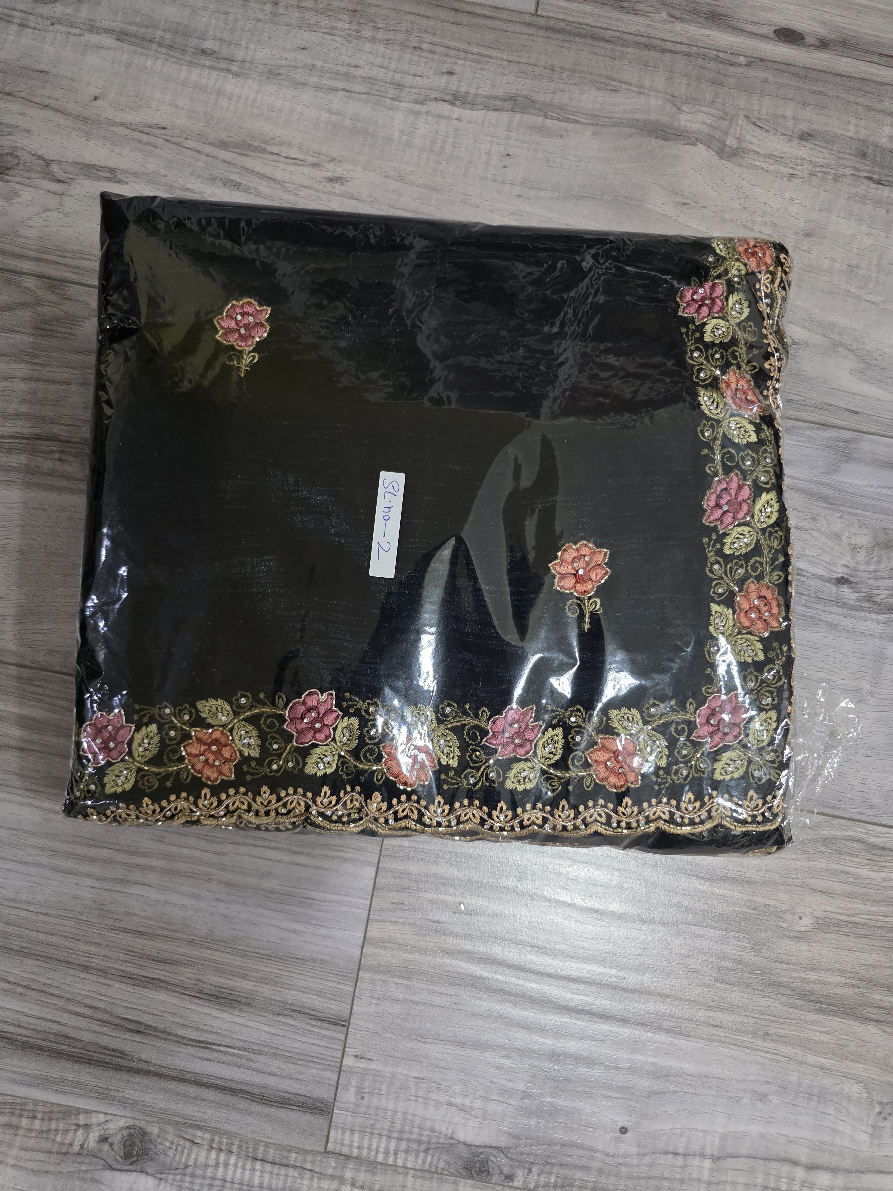 This black gorgett tissue sari is perfect for small cocktail party and other events. Has fine thread embroidery and sequin, stone highlights all over