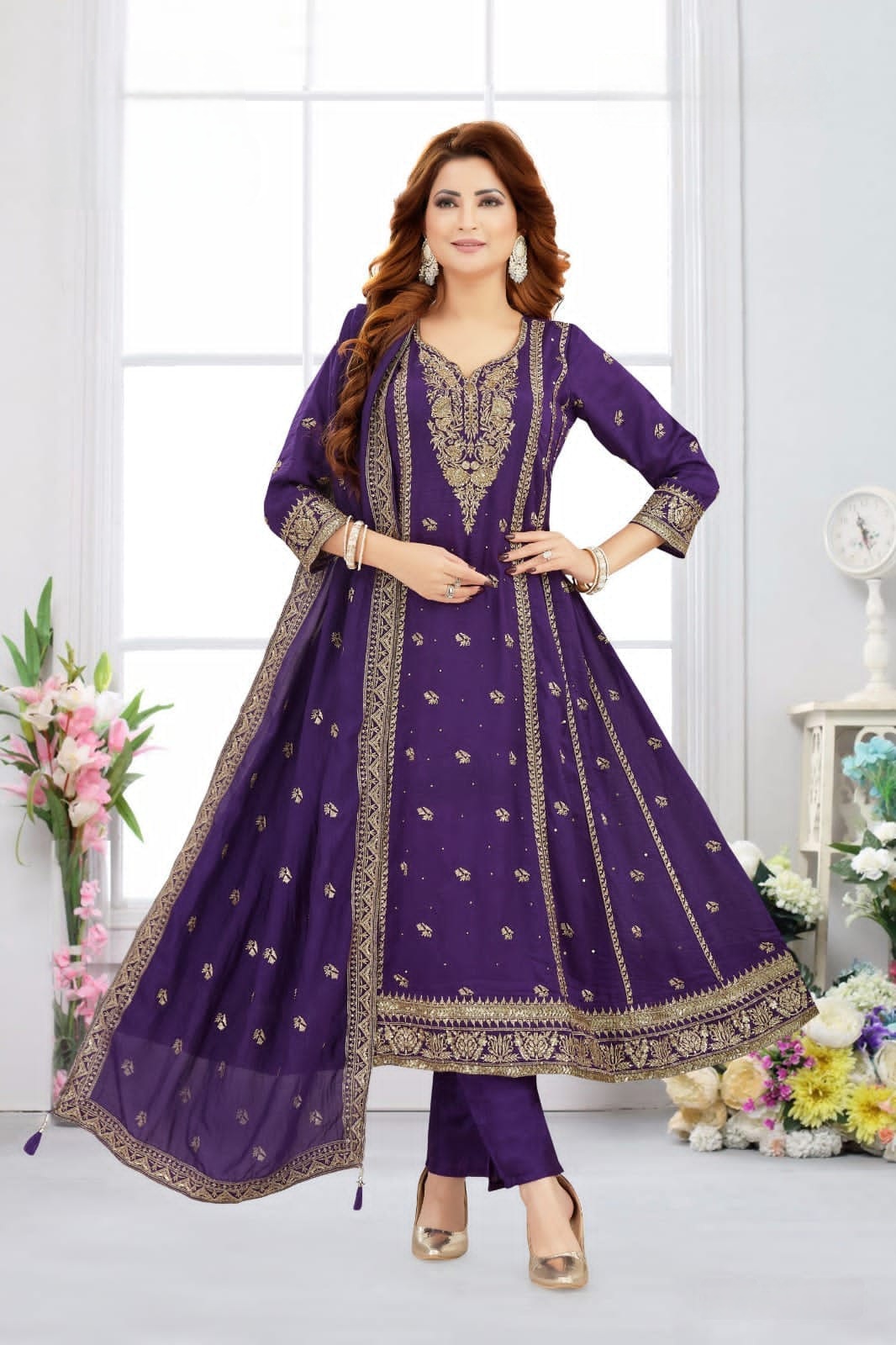 This vibrant peacock blue color sari is made in gorgett tissue fabric. Has gold and silver color Swarovski type stone all over