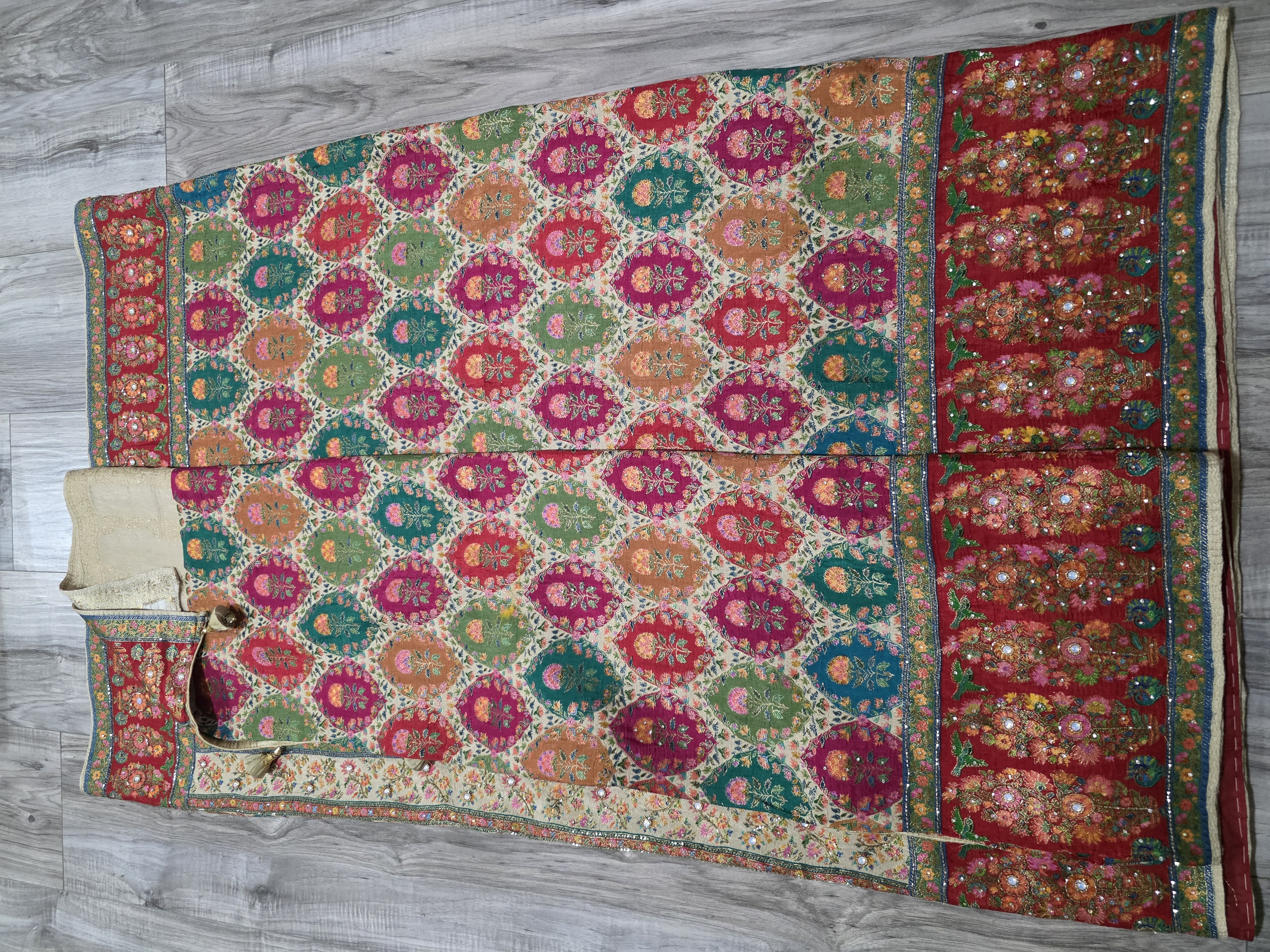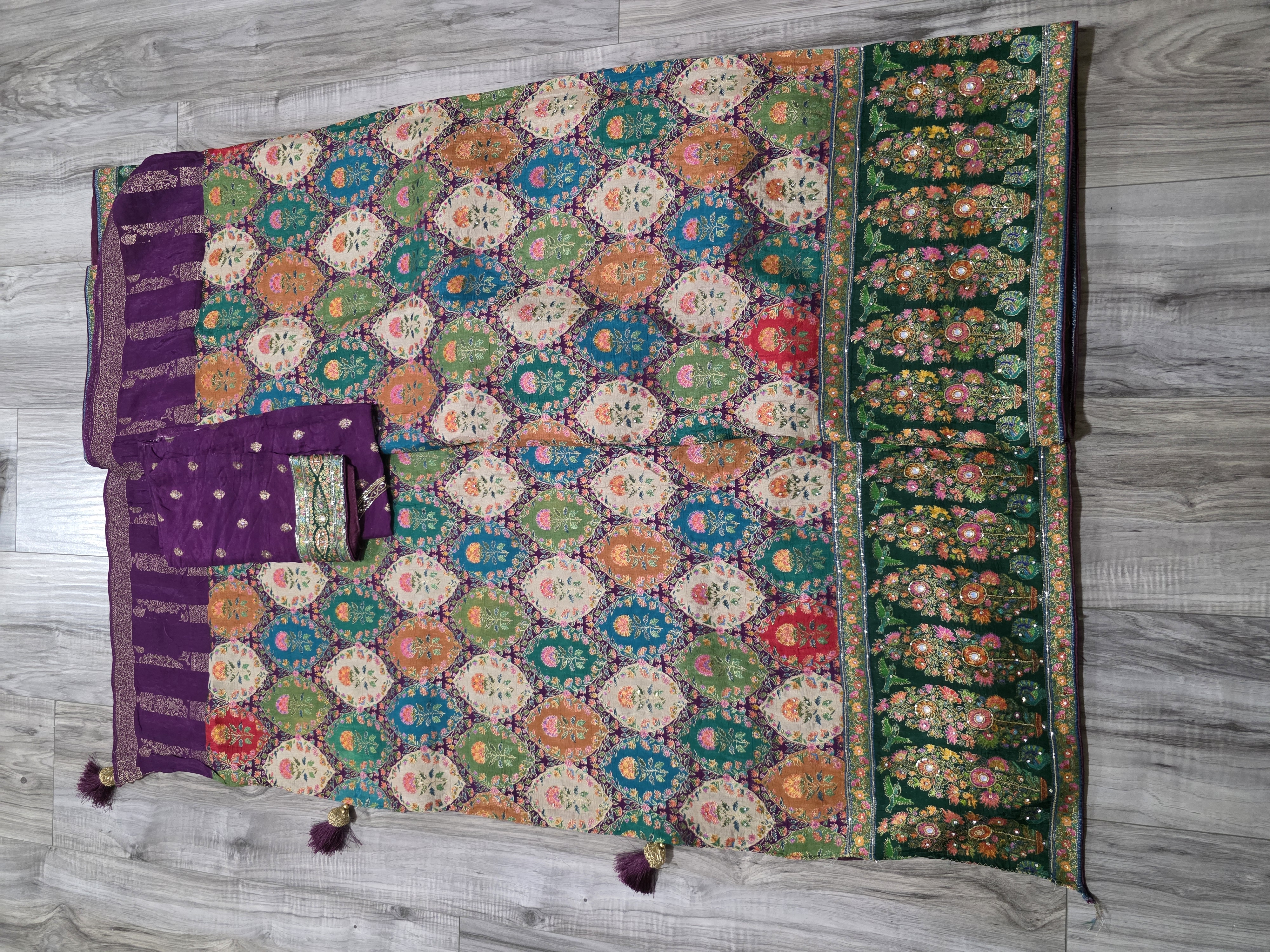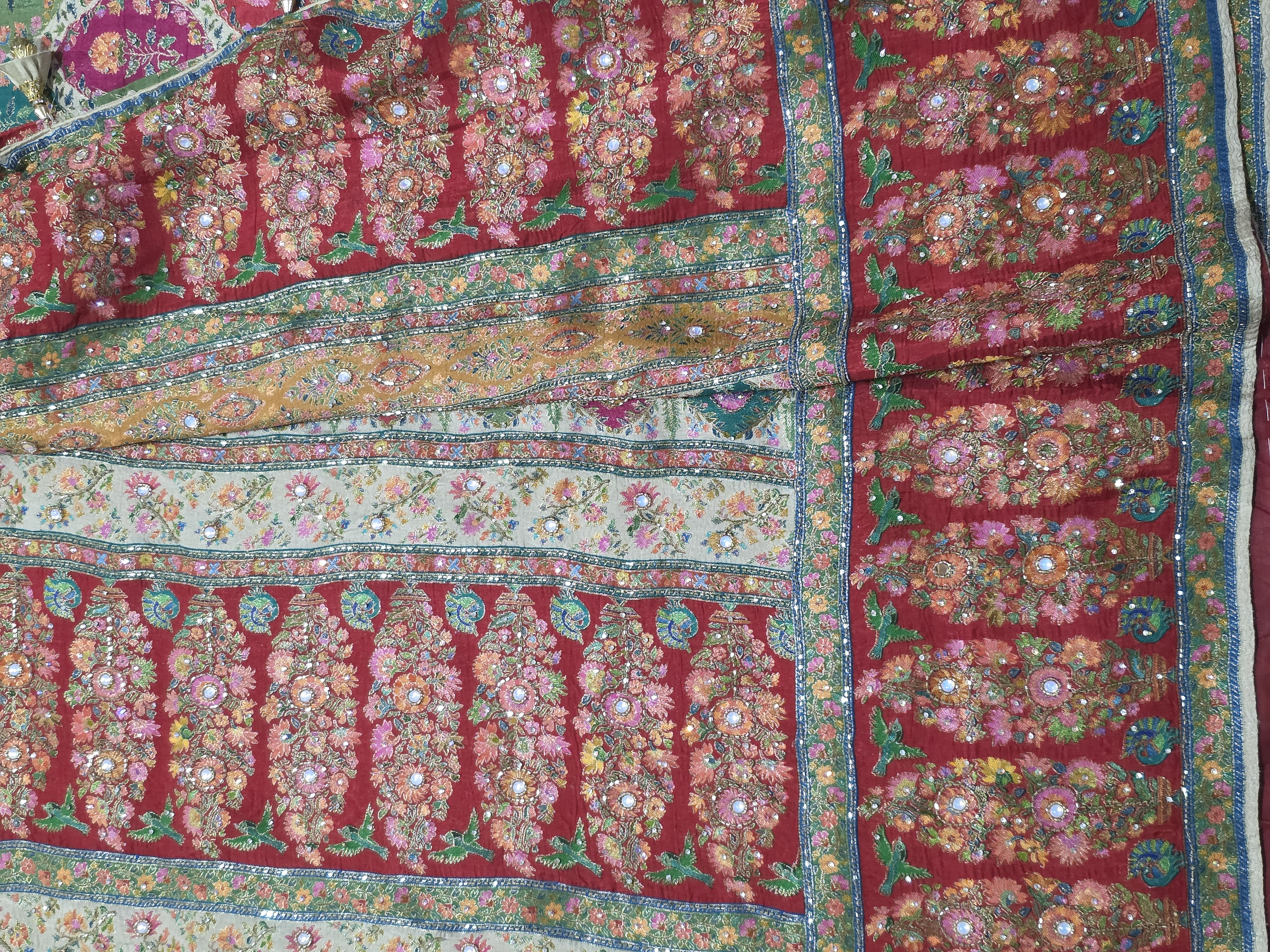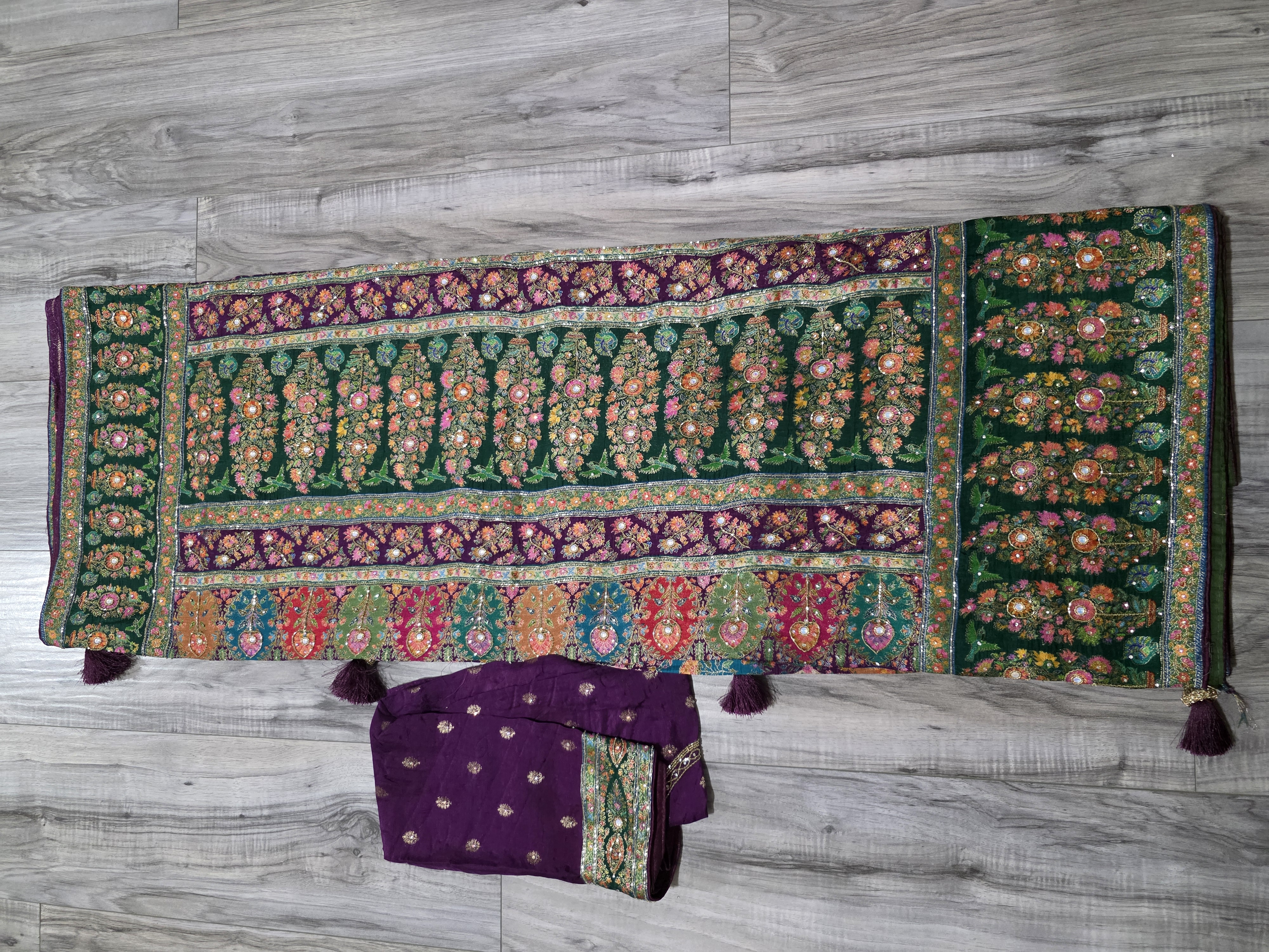 This sari is made in position silk. It is one of the newest and latest material in banarsi silk. Multi color silk thread weaving makes it very vibrant and colorful. Perfect for festive occasions . Whole sari has fine hand work kutdana, and stone highlights all over
