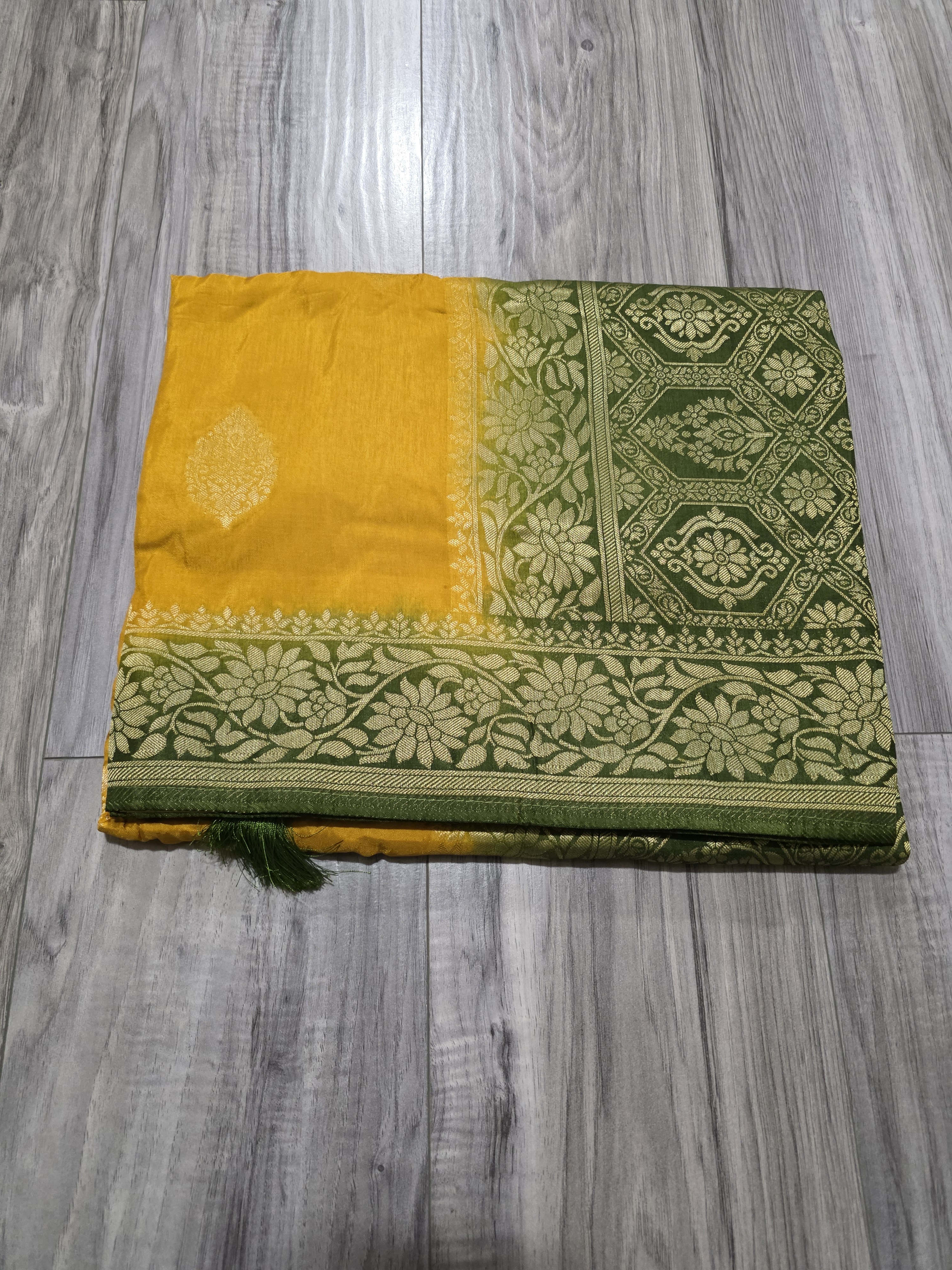 This sari is made of soft banarsi Dola silk fabric. Very light and easy to drape. Dyed in two colors