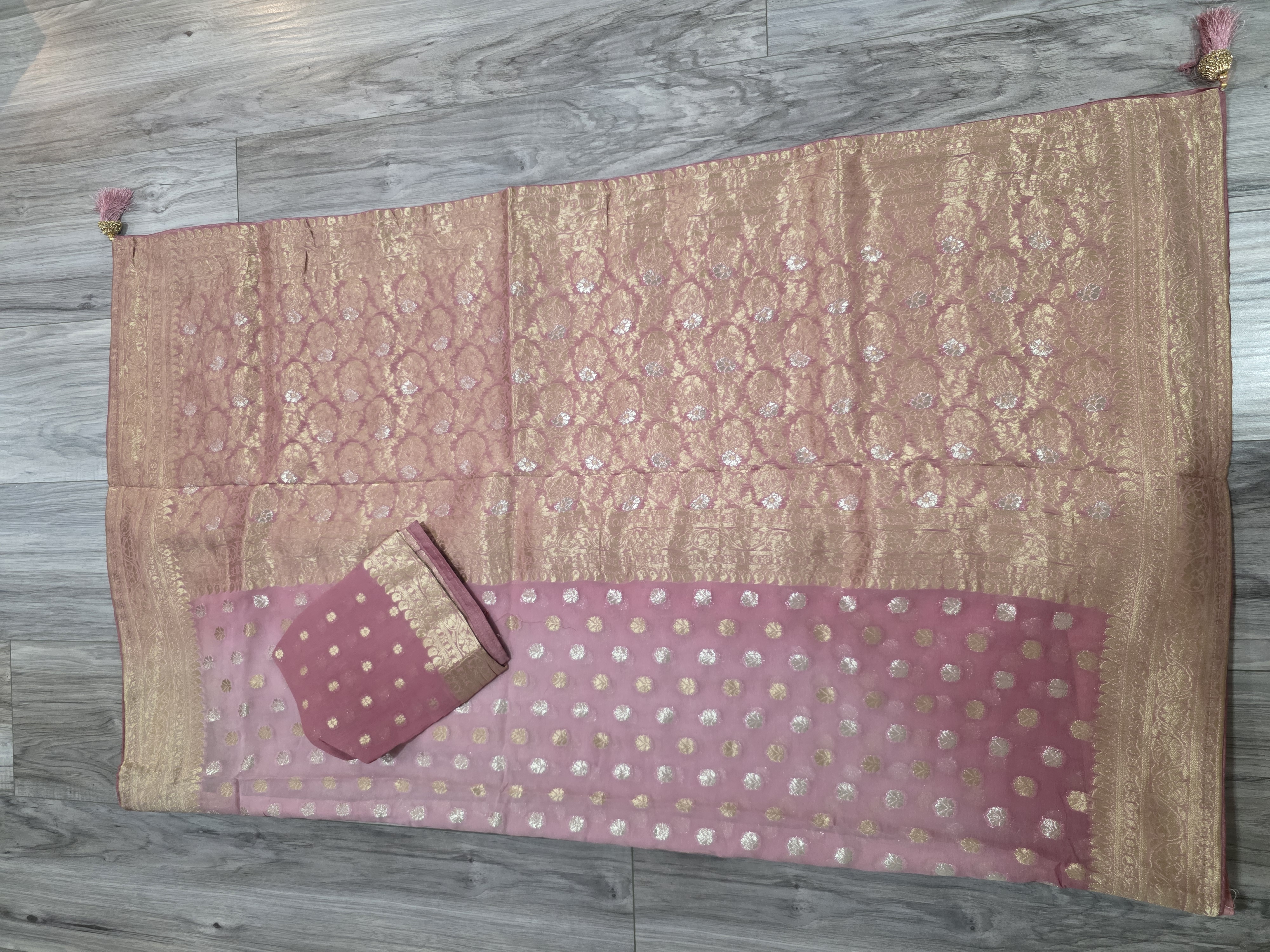 This pastel pink ombre shaded sari is made in gorgett banaras khaddi fabric.