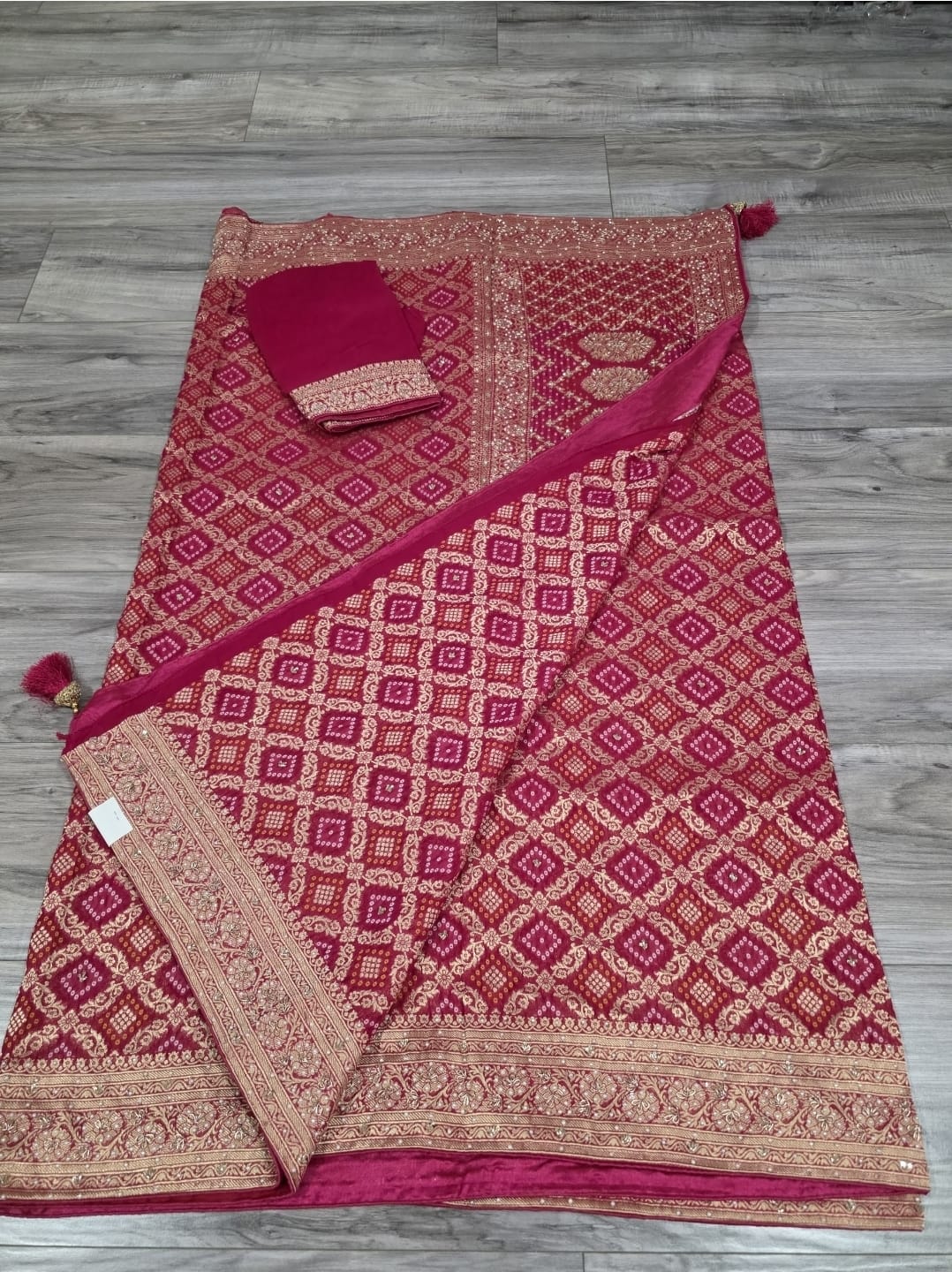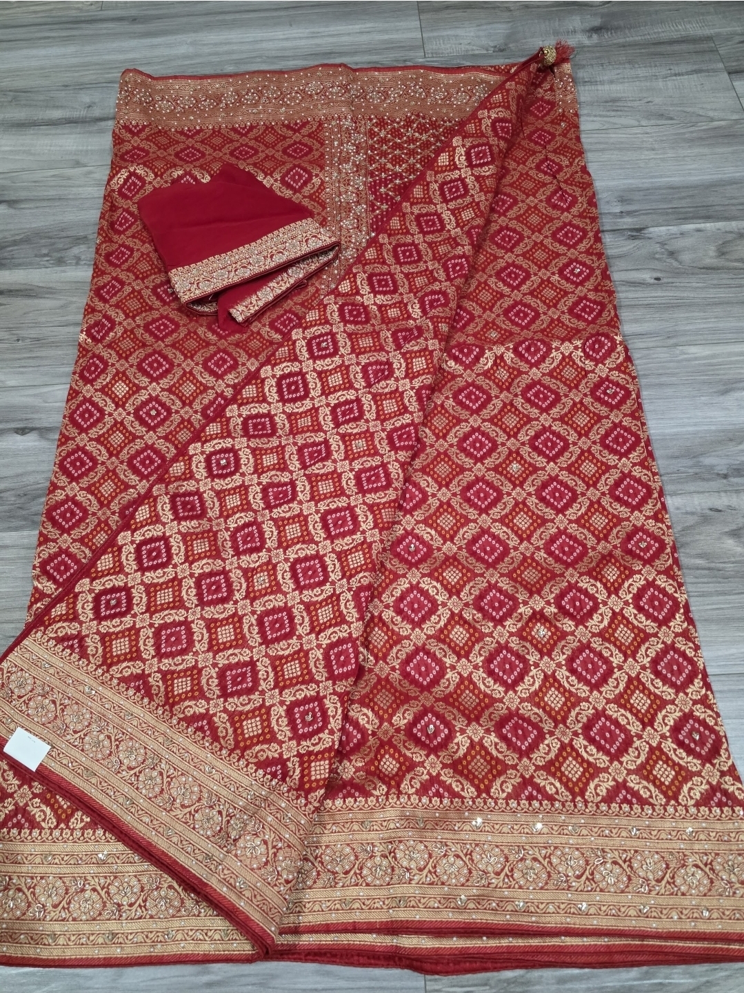 This pure banarsi khaddi gorgett sari has zari weaving and hand tye dye bandhni all over. Border and pallu has moti, kutdana and zardosi hand work done.