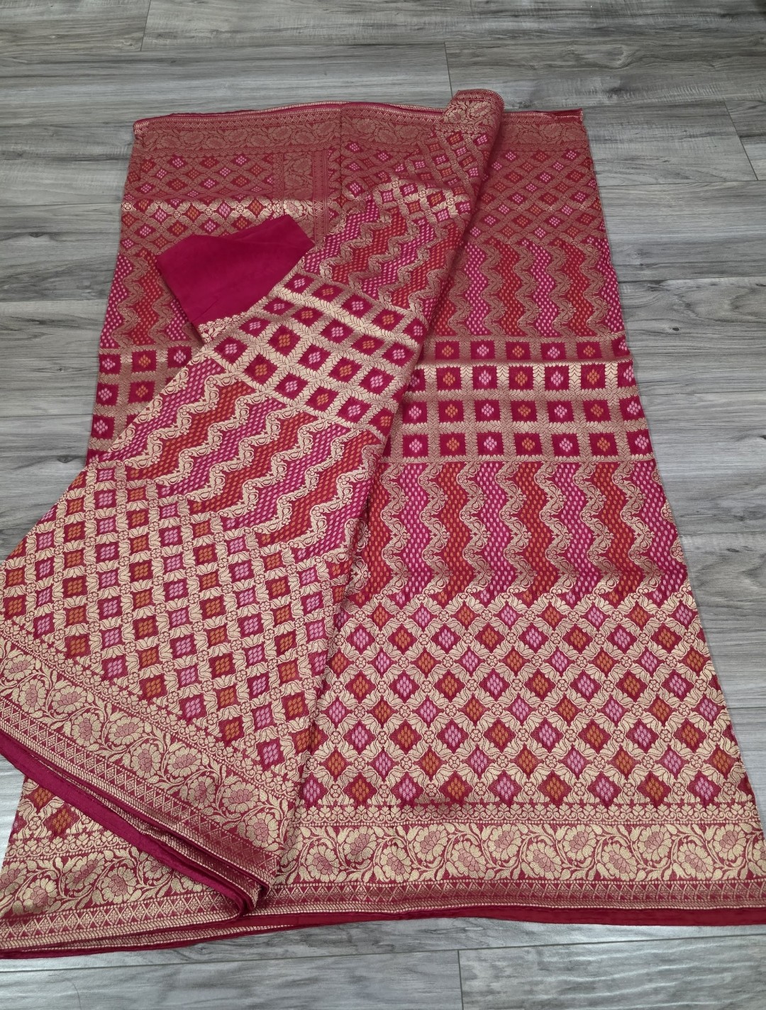 This rani bandhni gorgett khaddi sari is soft and perfect for wedding occasions