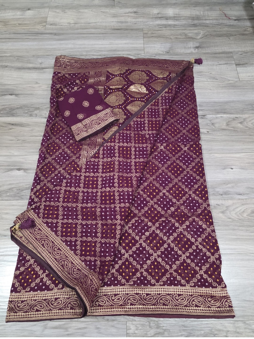 This purple sari is made in gorgett khaddi fabric with bandhni in it