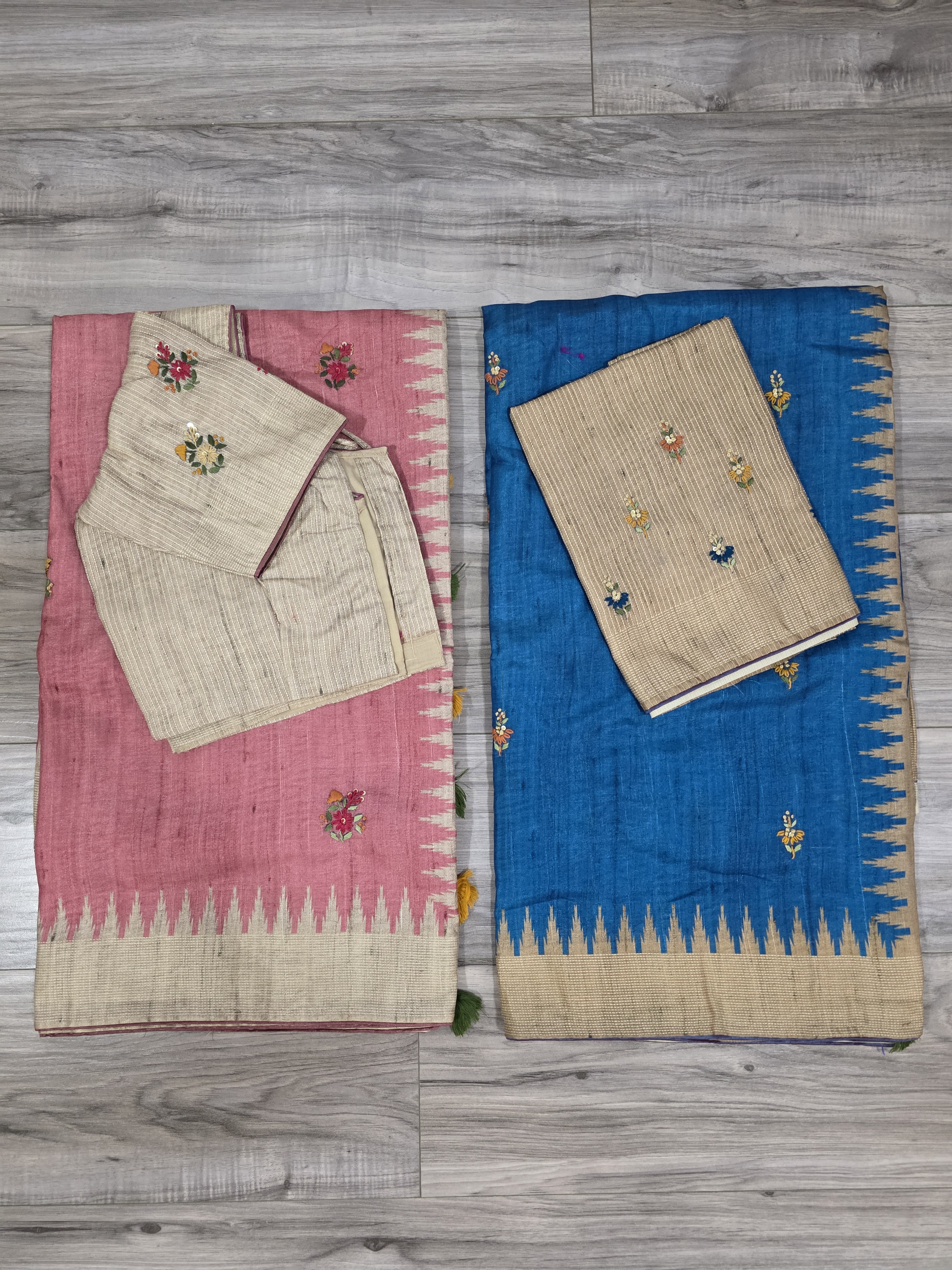 This semi tussar soft silk saris have thread knot work on thd pallu and small motifs all over.