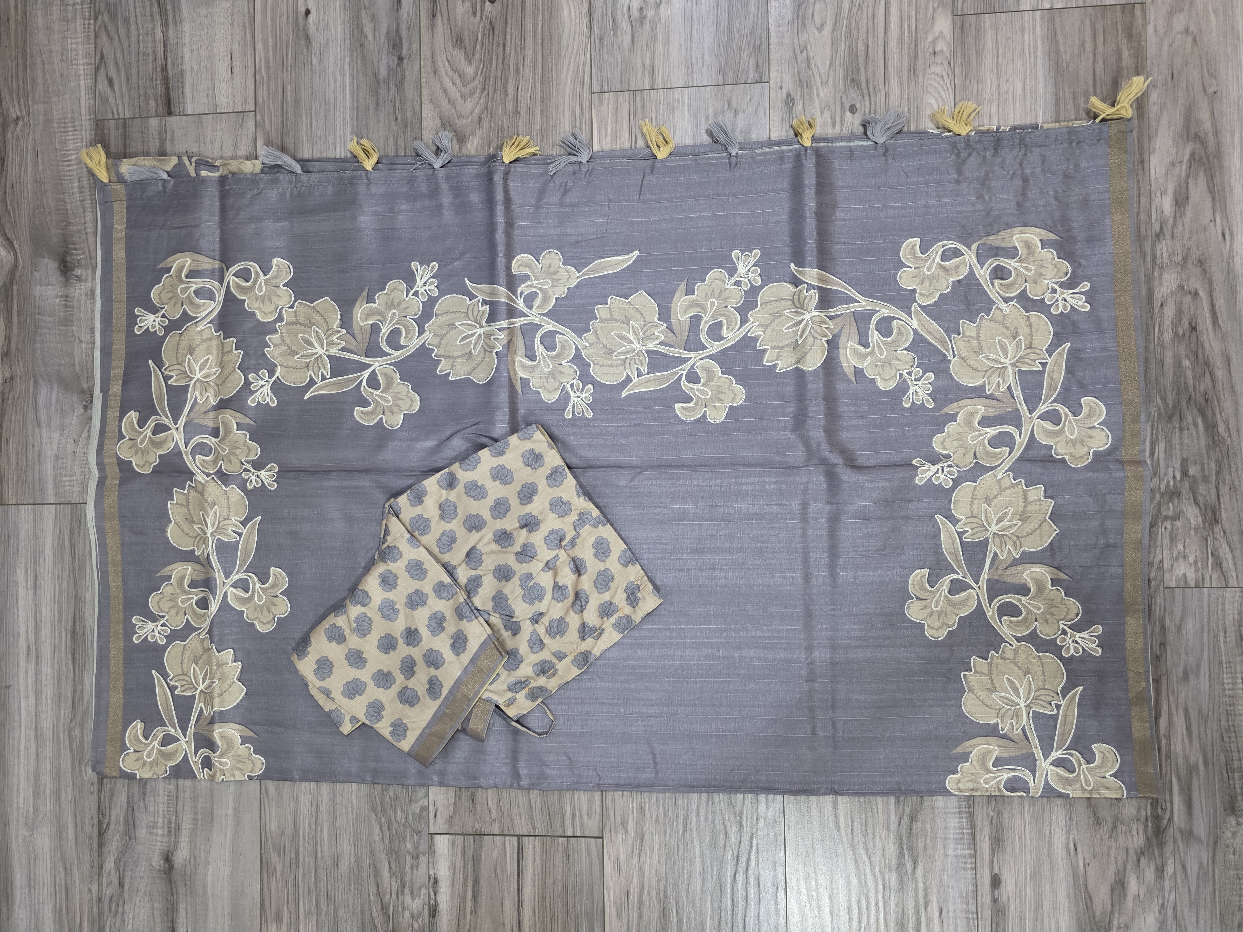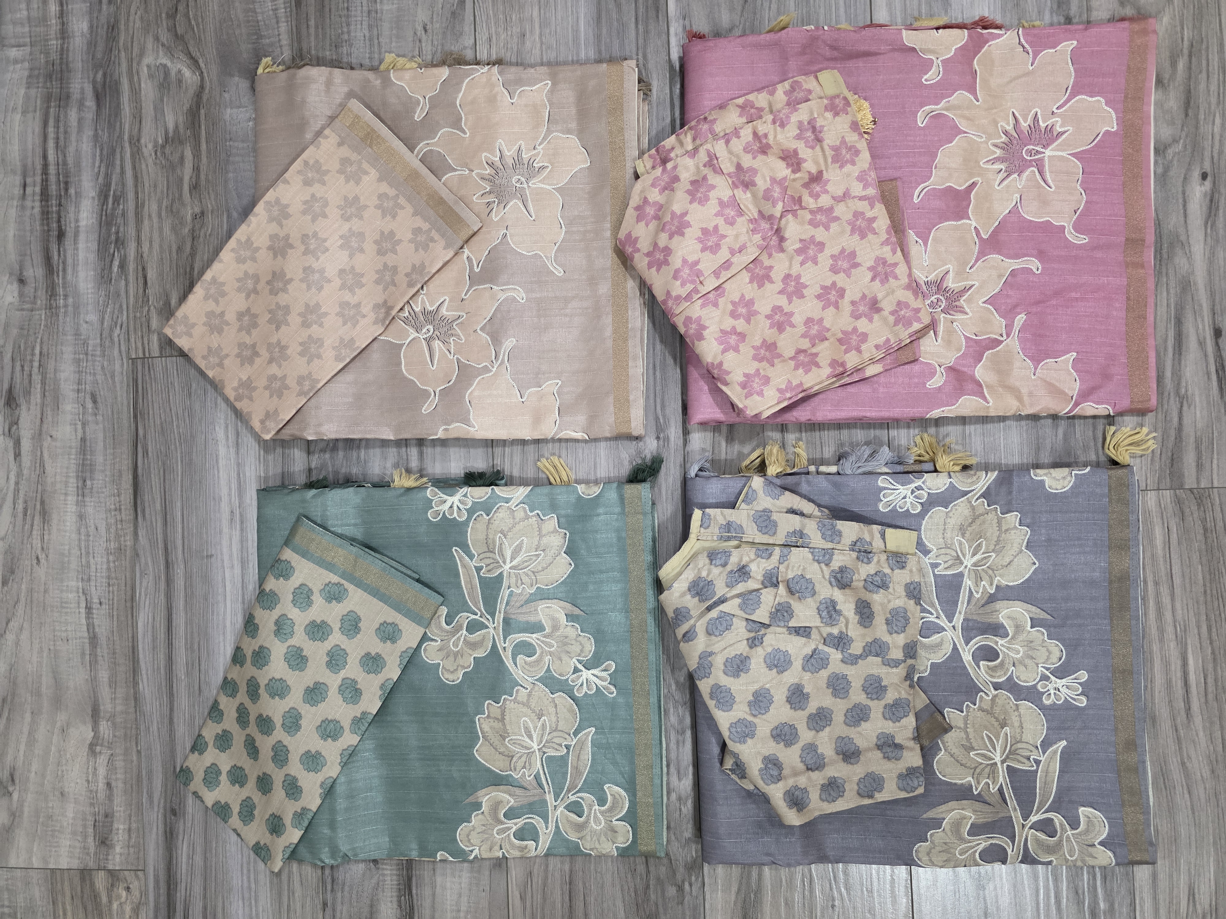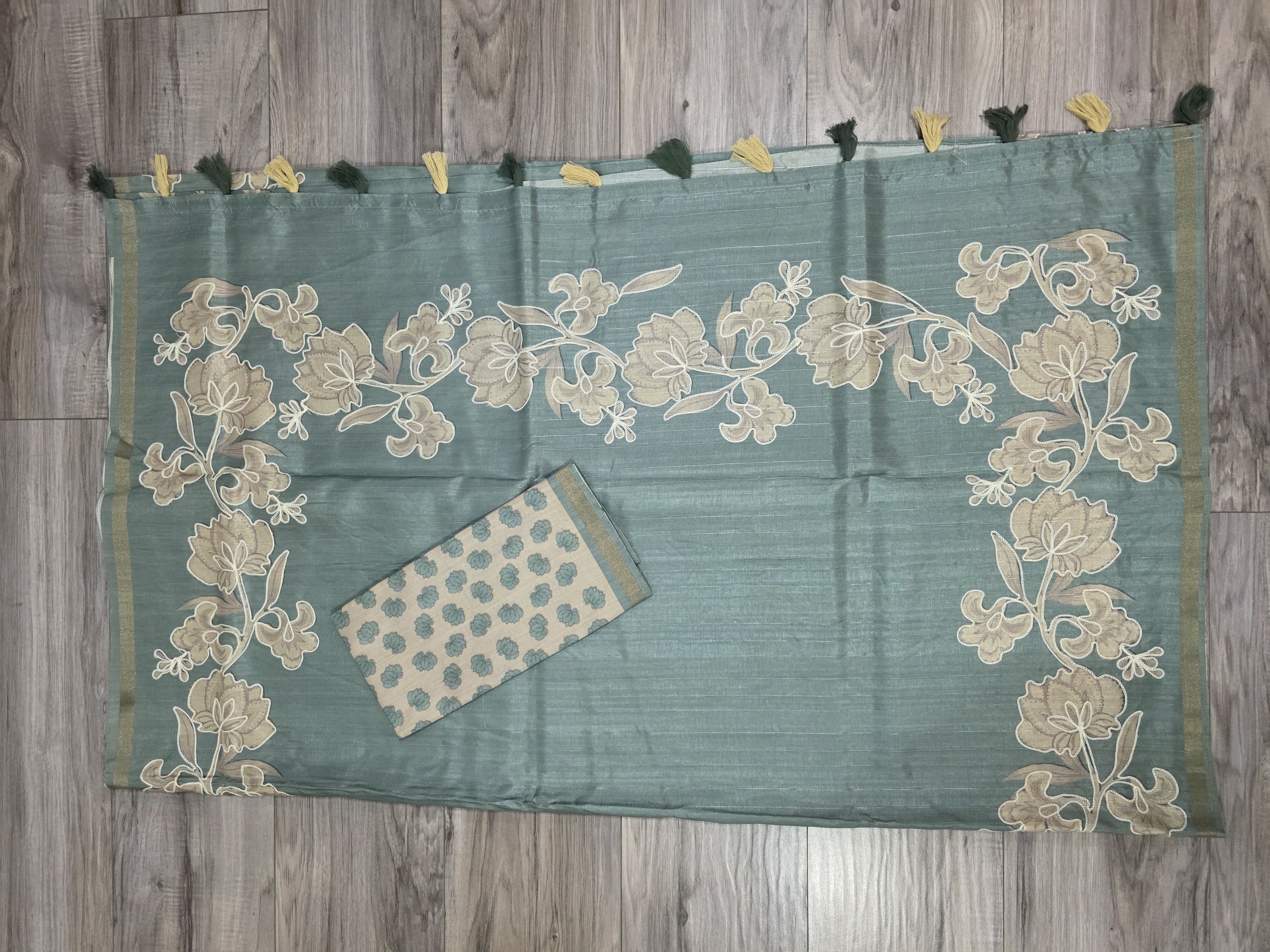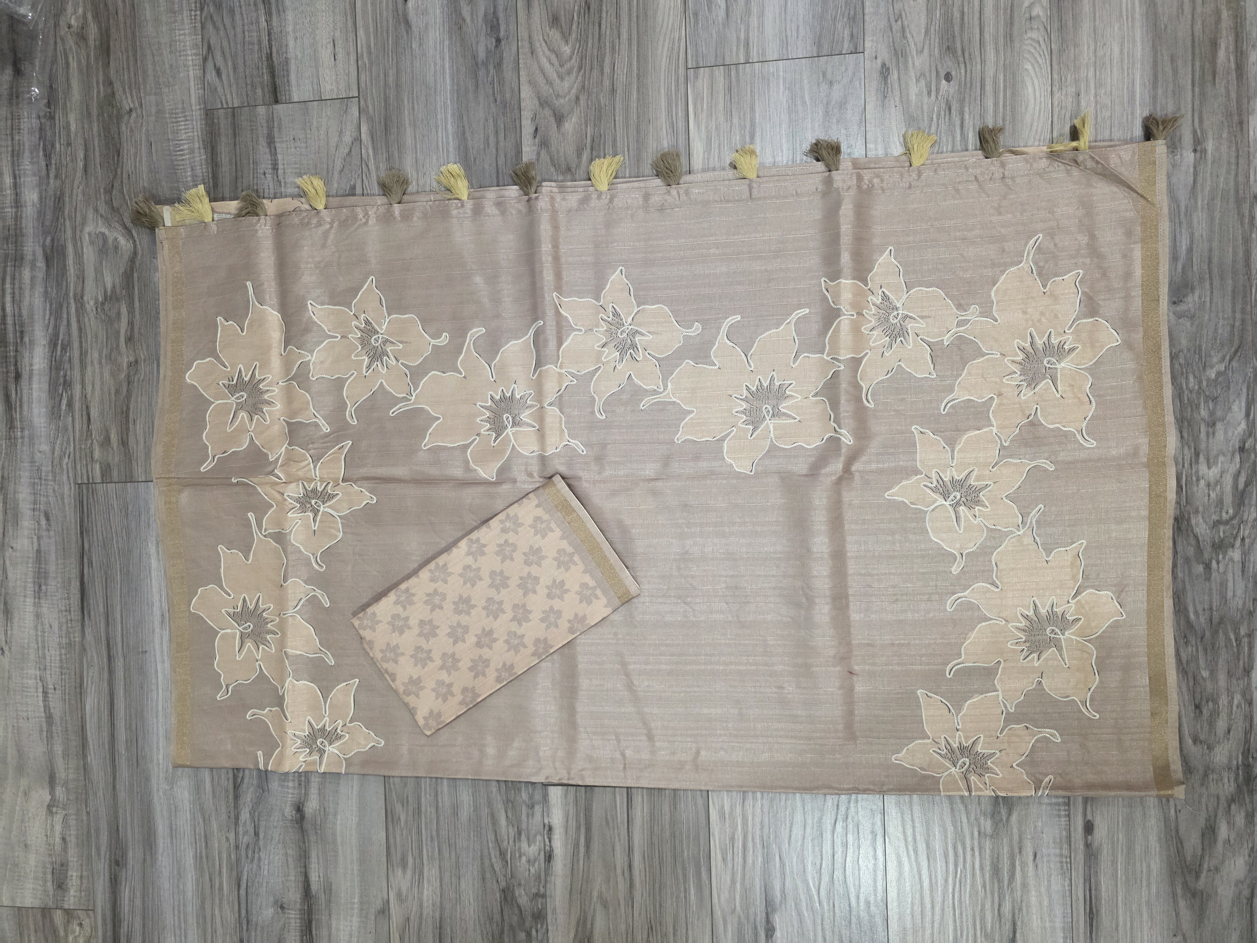 These semi tussar soft silk sari have floral applique work done at the border and pallu. Comes in light pastel color. Soft and easy-to-use