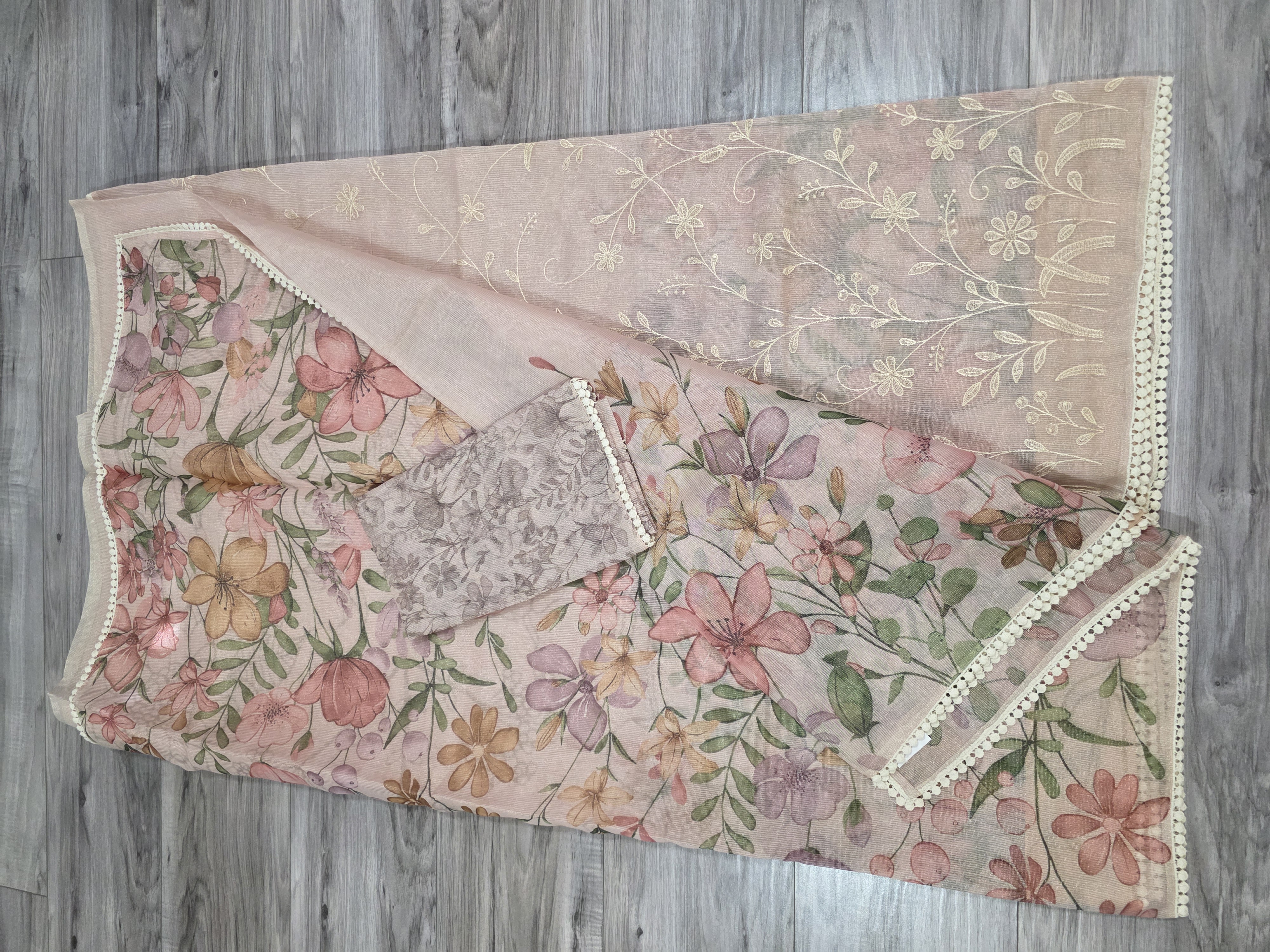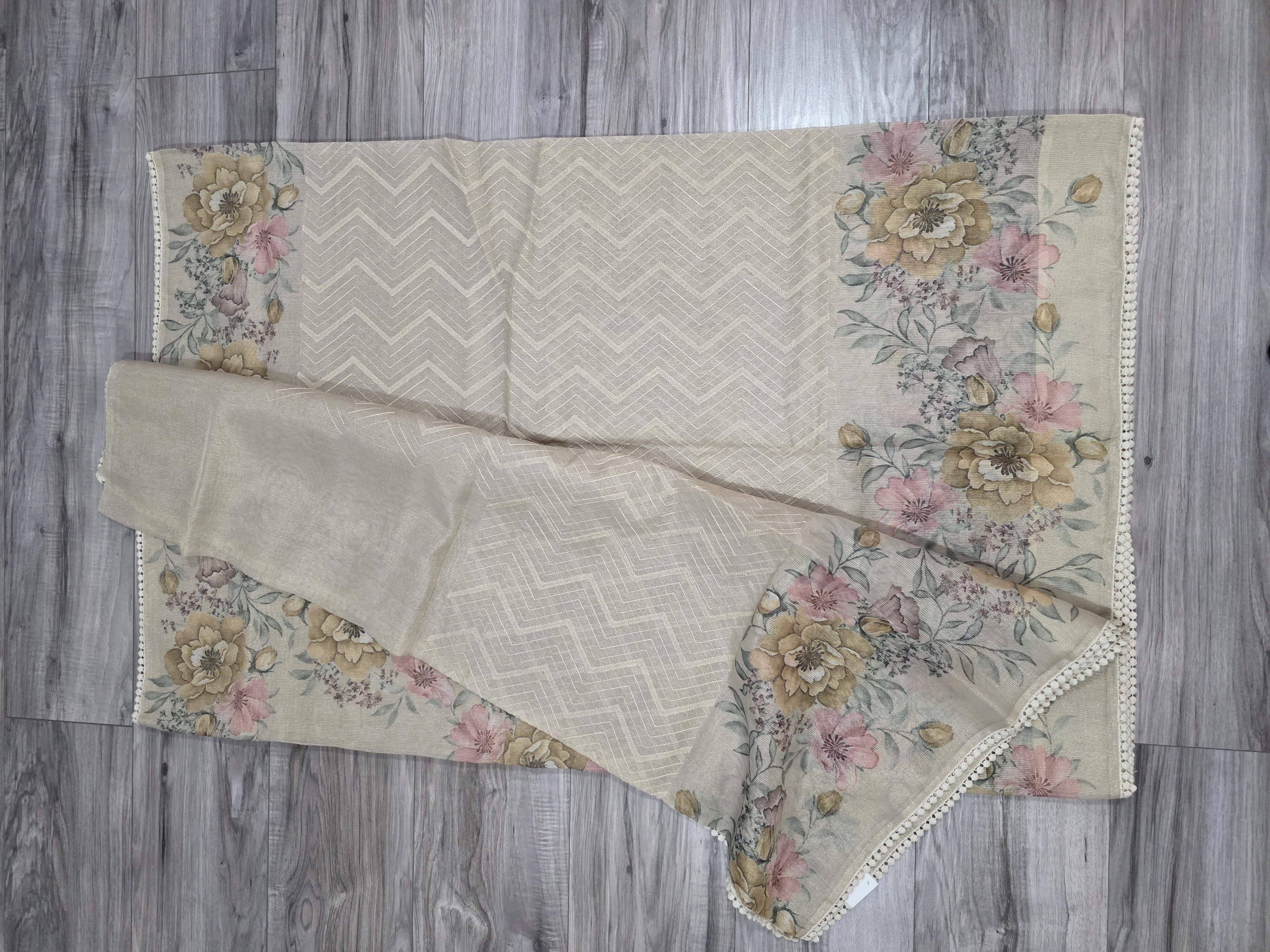 This pure Kota shimmer sari has hand painted floral border and pallu with lucknowi chickenkari embroidery done on the pallu