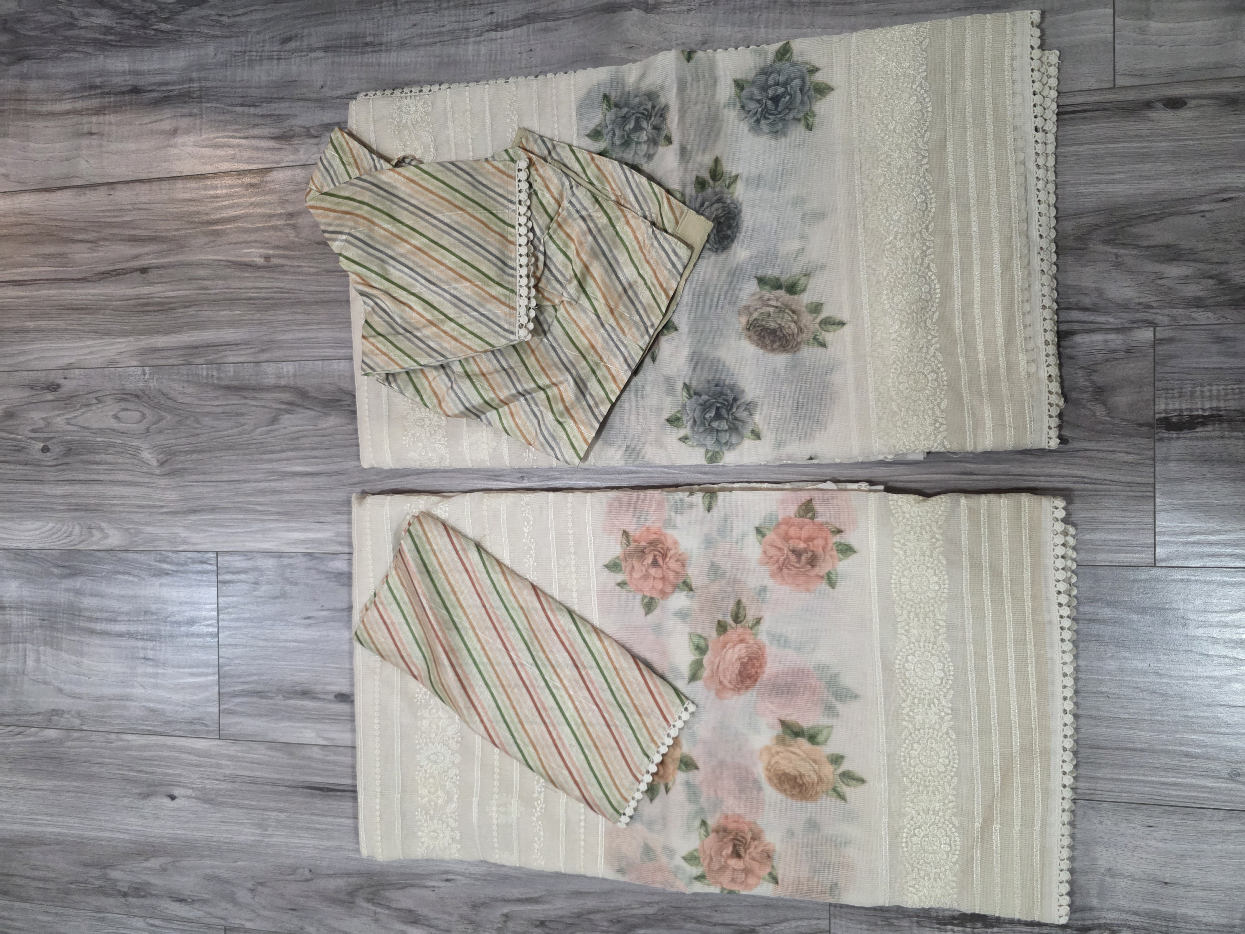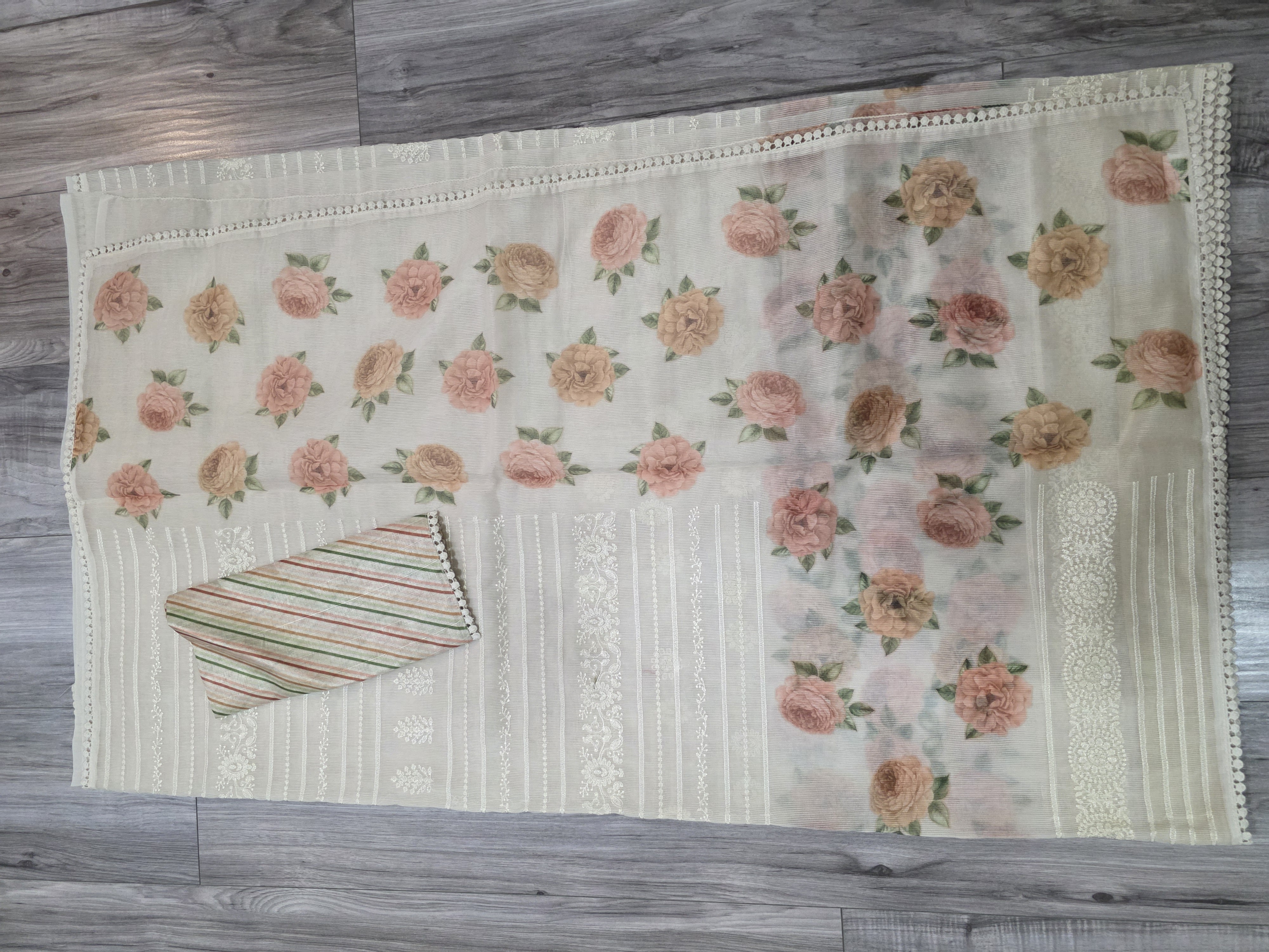 This pure Kota sari in off white color has floral print and lucknowi chickenkari embroidery on the border along with a fine lace edging all around the sari