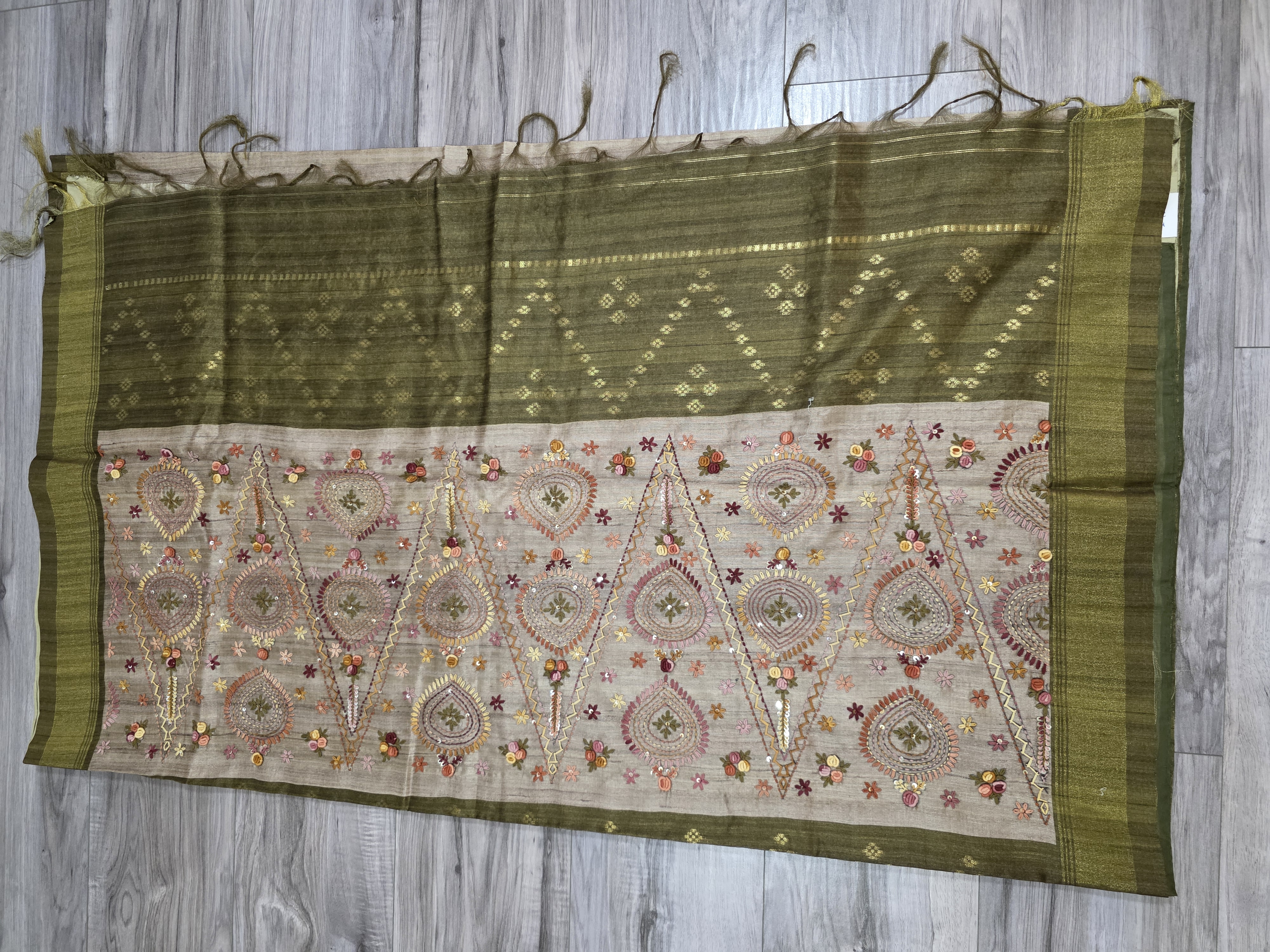 This tussar color with contrast mehndi green border, blouse and zari weaving anchal sari is made in semi tussar soft silk with hand thread knot embroidery done
