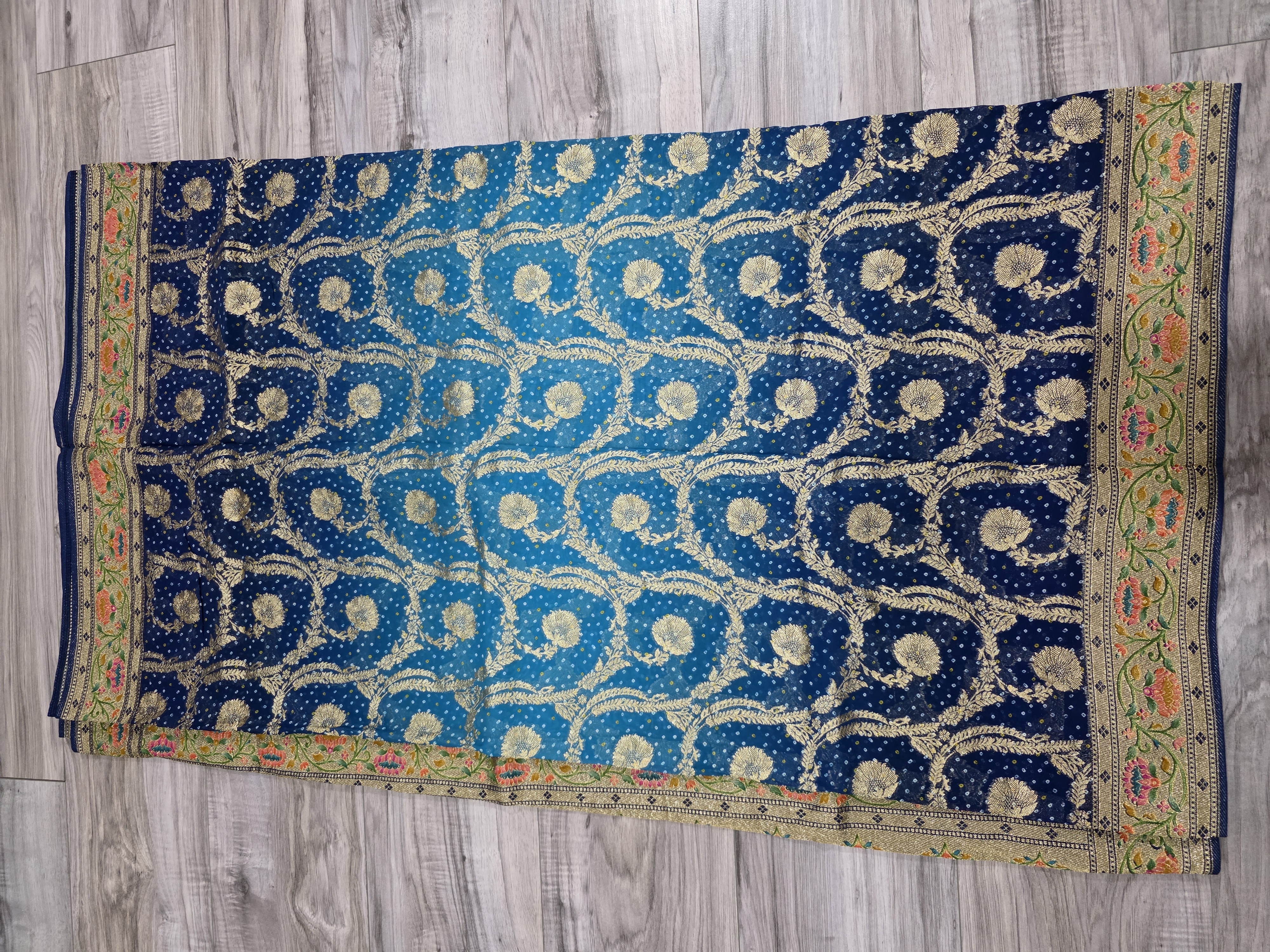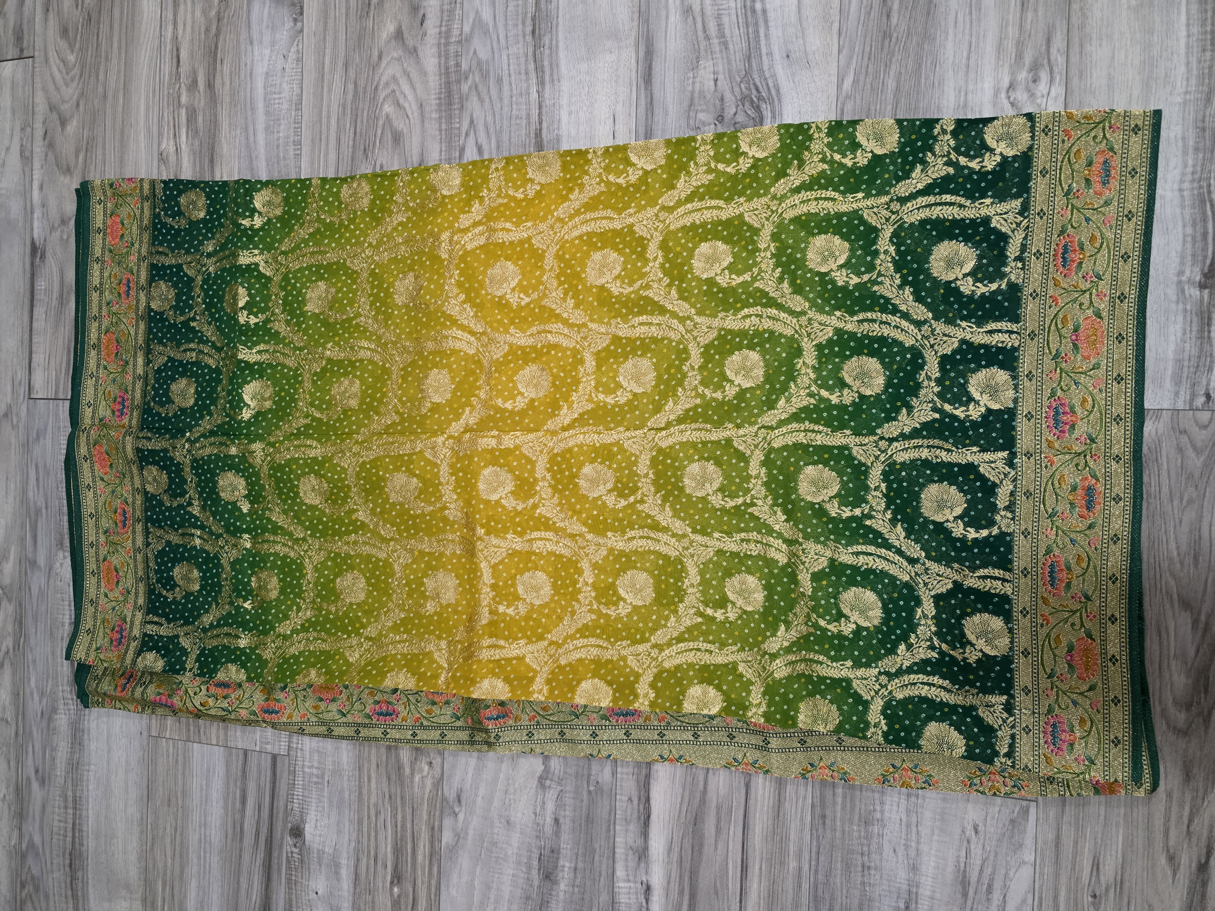 This latest banarsi gorgett position weaving sari has bandhni tye dye work and multi color zari weaving border and pallu. Very rich sari perfect for wedding and festive occasions.