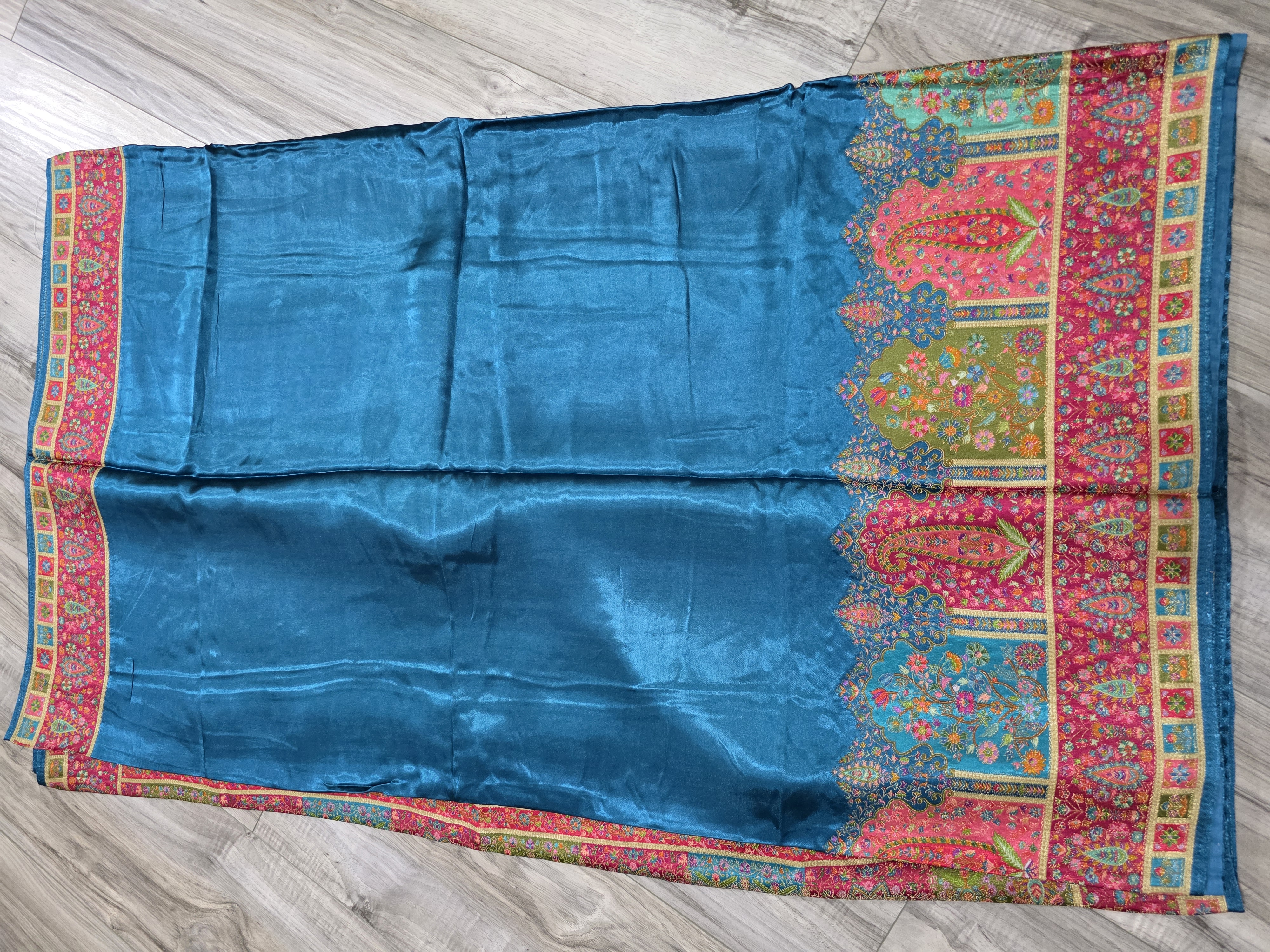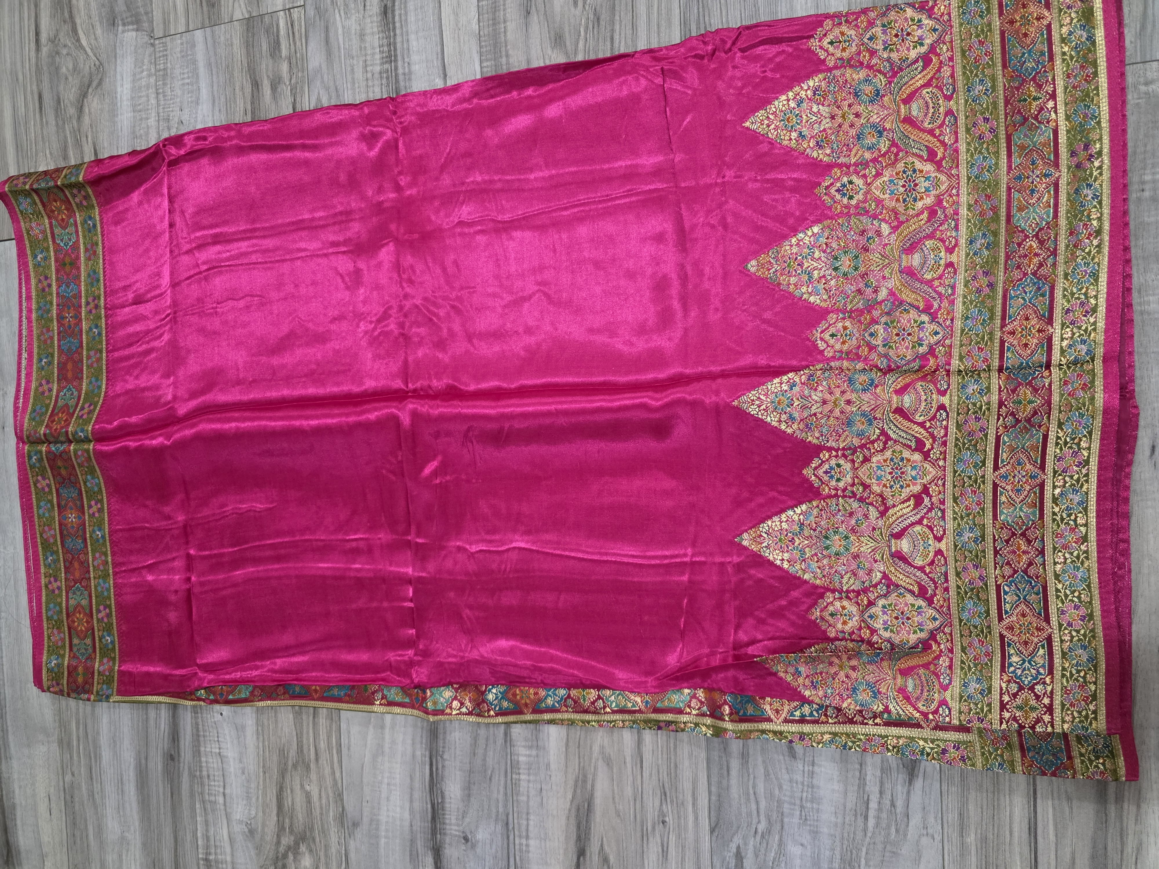 This latest banarsi satin position weaving sari has multi color zari weaving border and pallu. Very rich sari perfect for wedding and festive occasions.