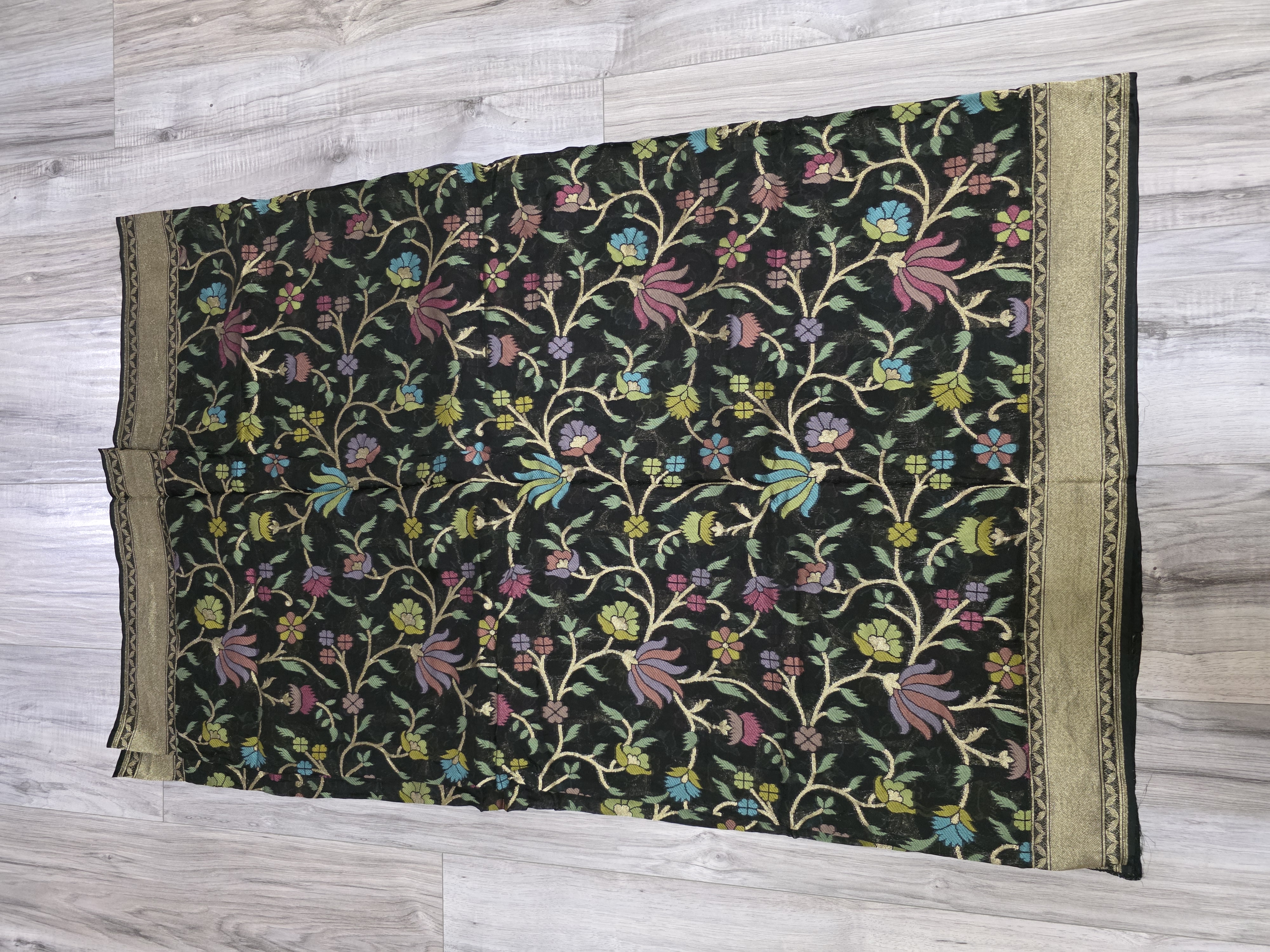 This black sari is made in organza fabric with multi color floral design in the weaving all over along with antique gold zari