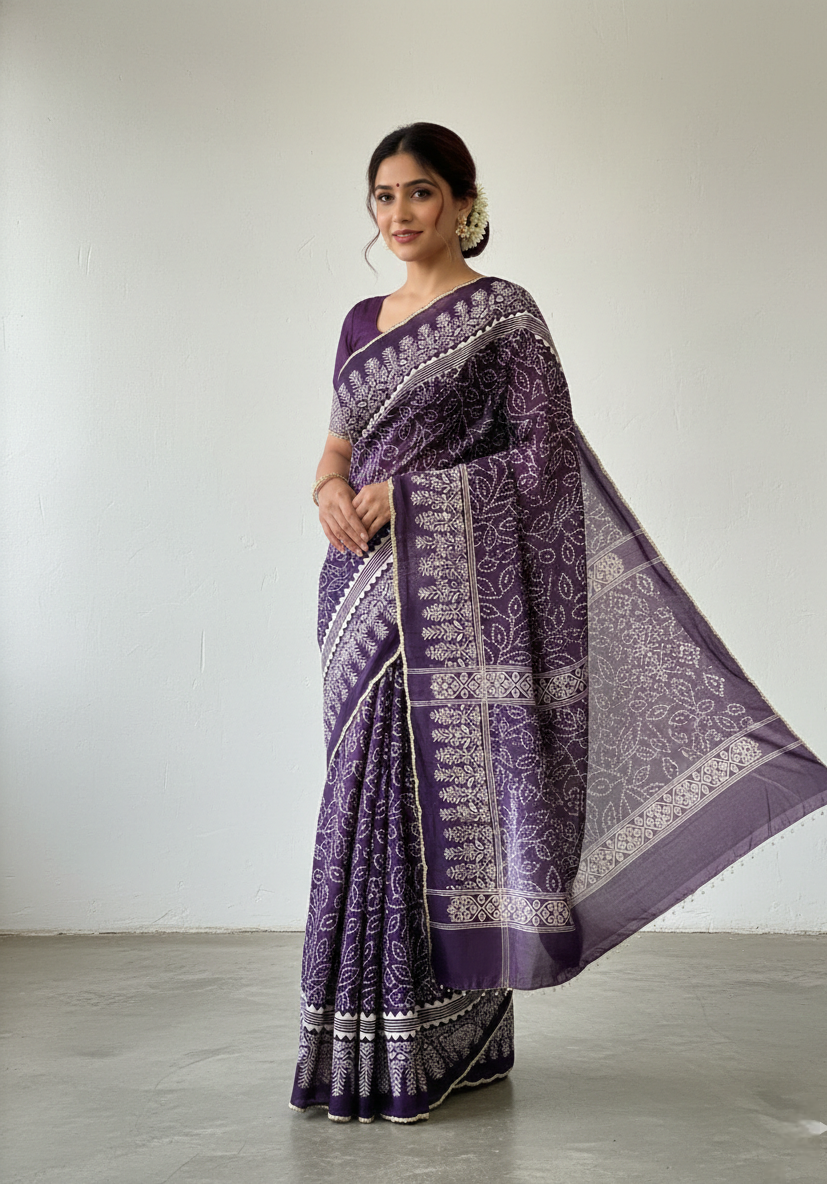 This eggplant purple tissue banarsi silk fabric sari has loral Mina work done all over.