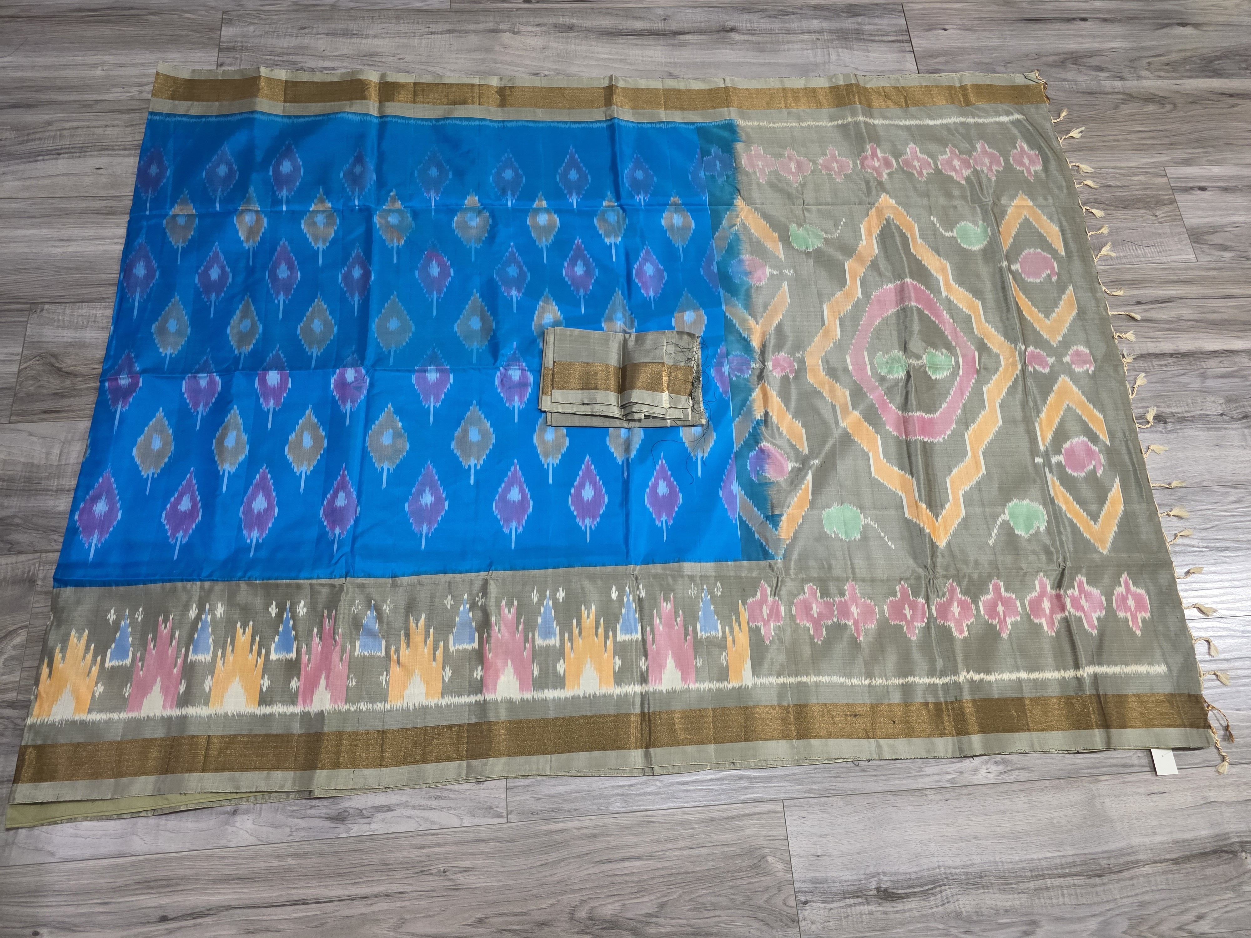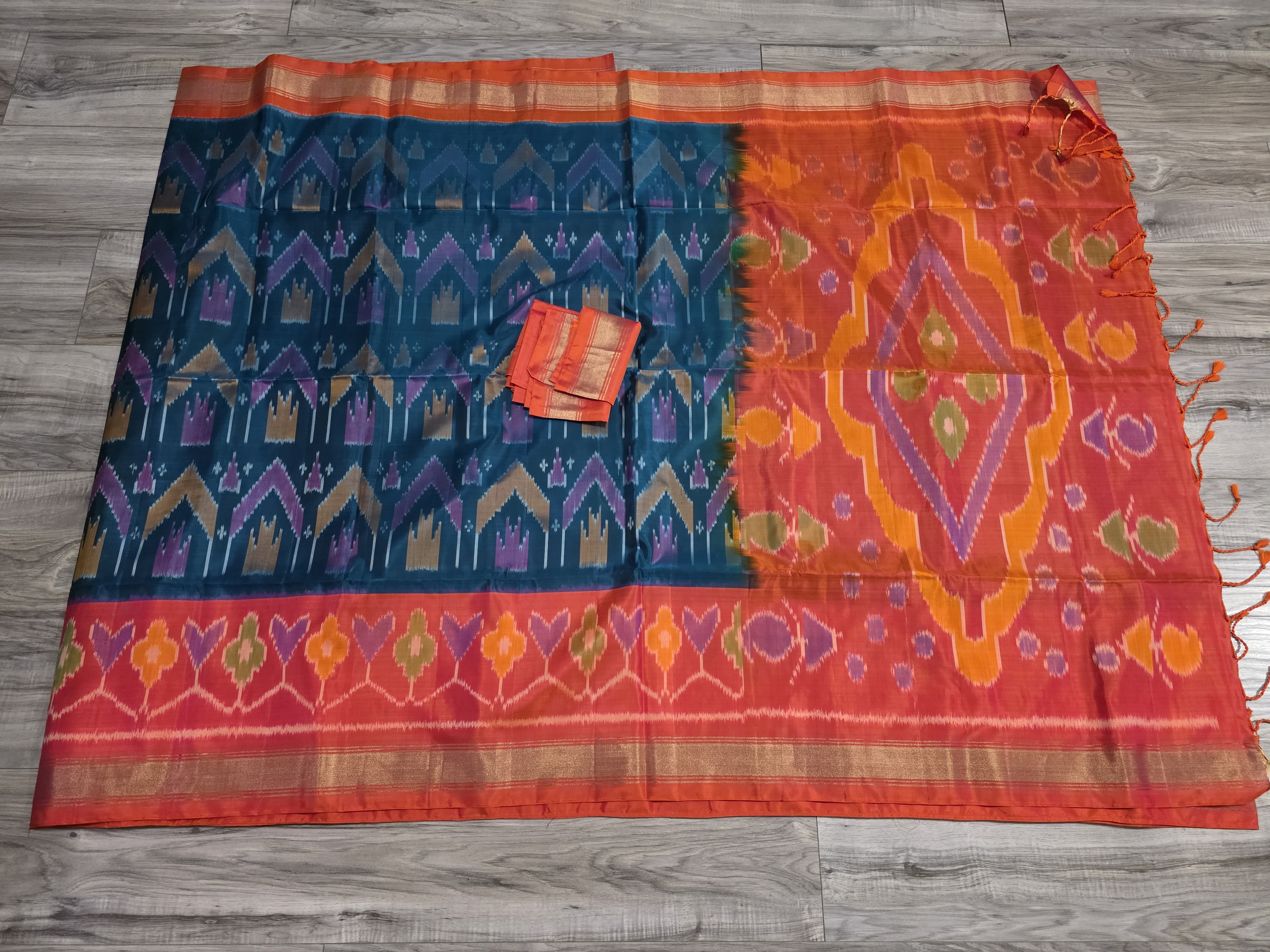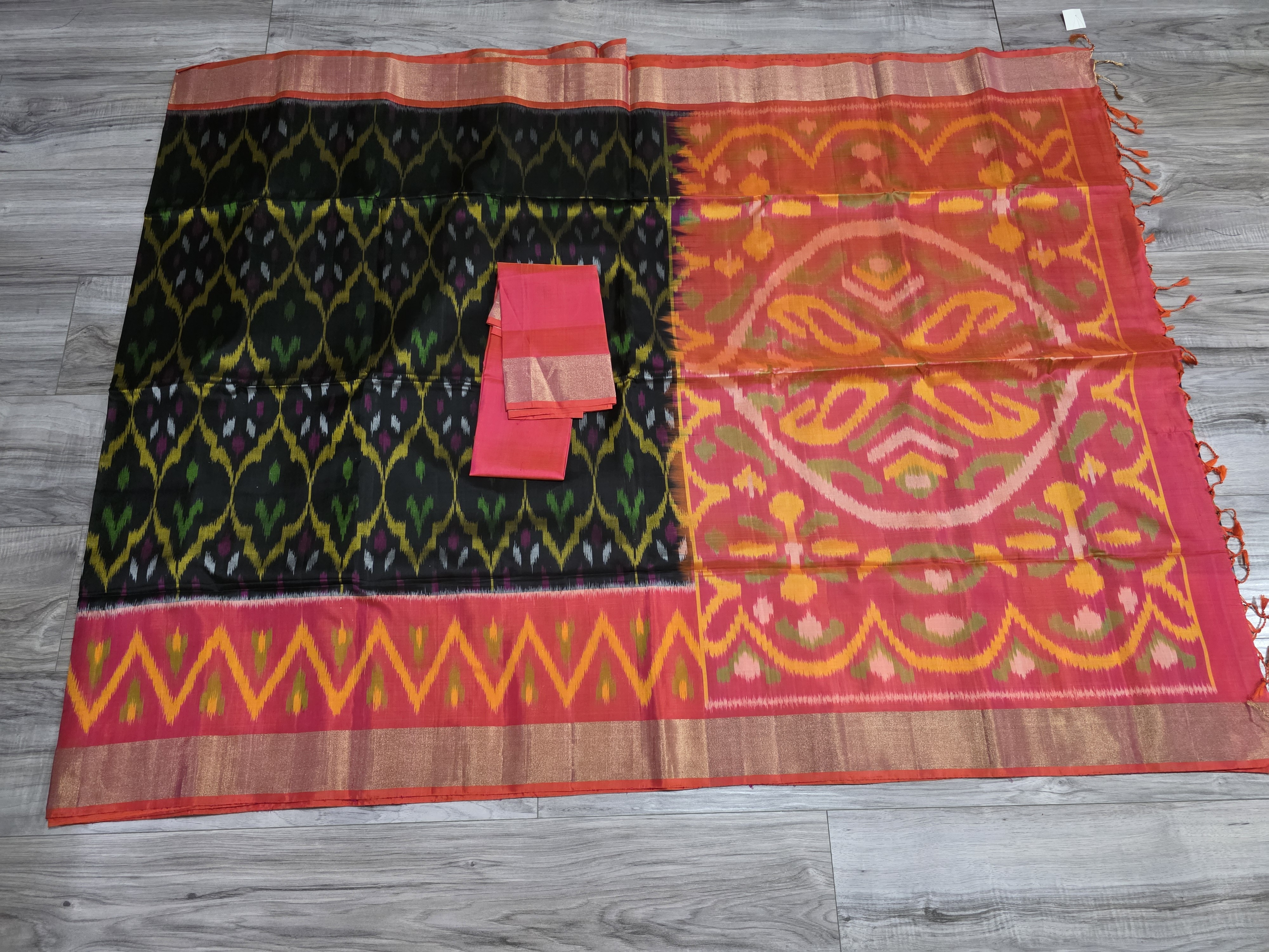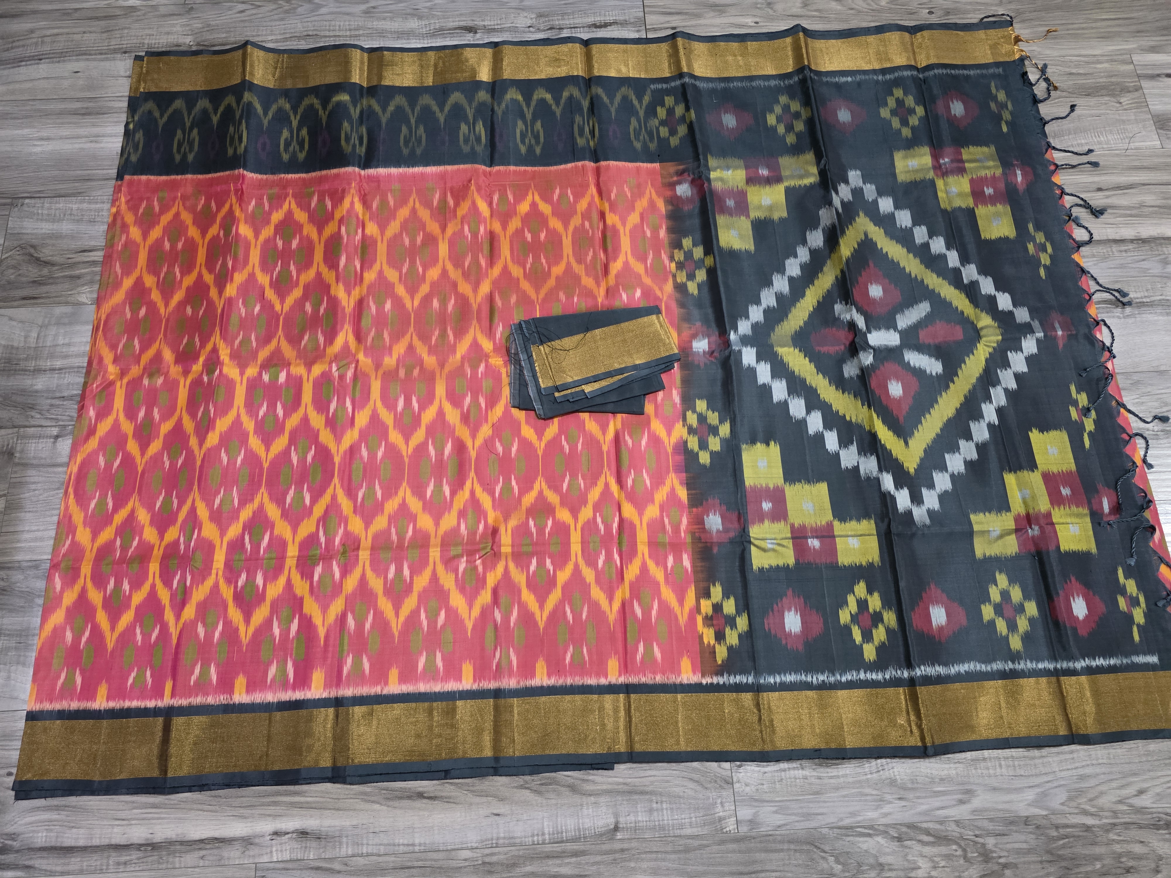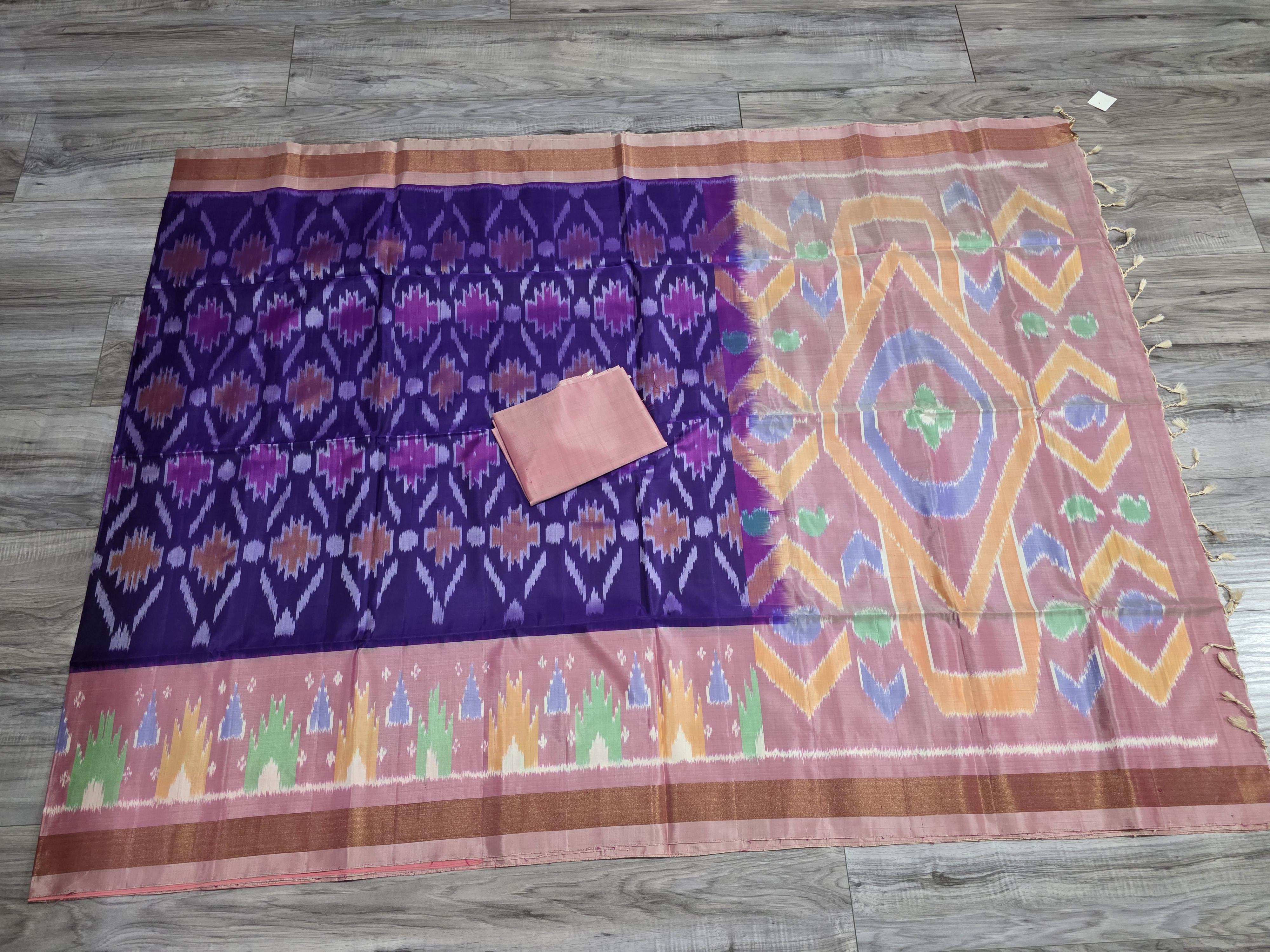 Pochampally sarees are known for their vibrant and contrasting color combinations, often featuring bold hues like magenta, indigo, and emerald green. The designs are typically bold and geometric, with common motifs including diamonds, squares, and abstract forms.