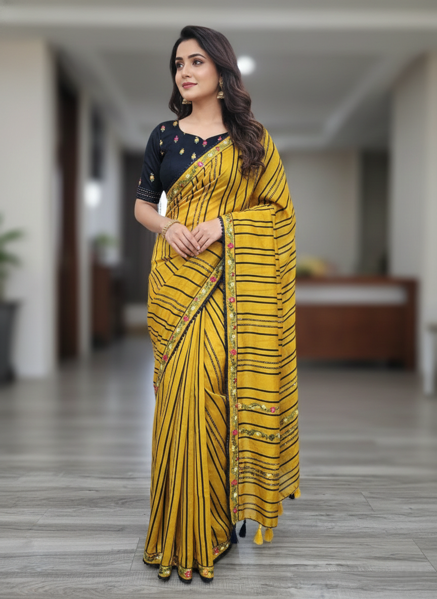 Pochampally sarees are known for their vibrant and contrasting color combinations, often featuring bold hues like magenta, indigo, and emerald green. The designs are typically bold and geometric, with common motifs including diamonds, squares, and abstract forms.