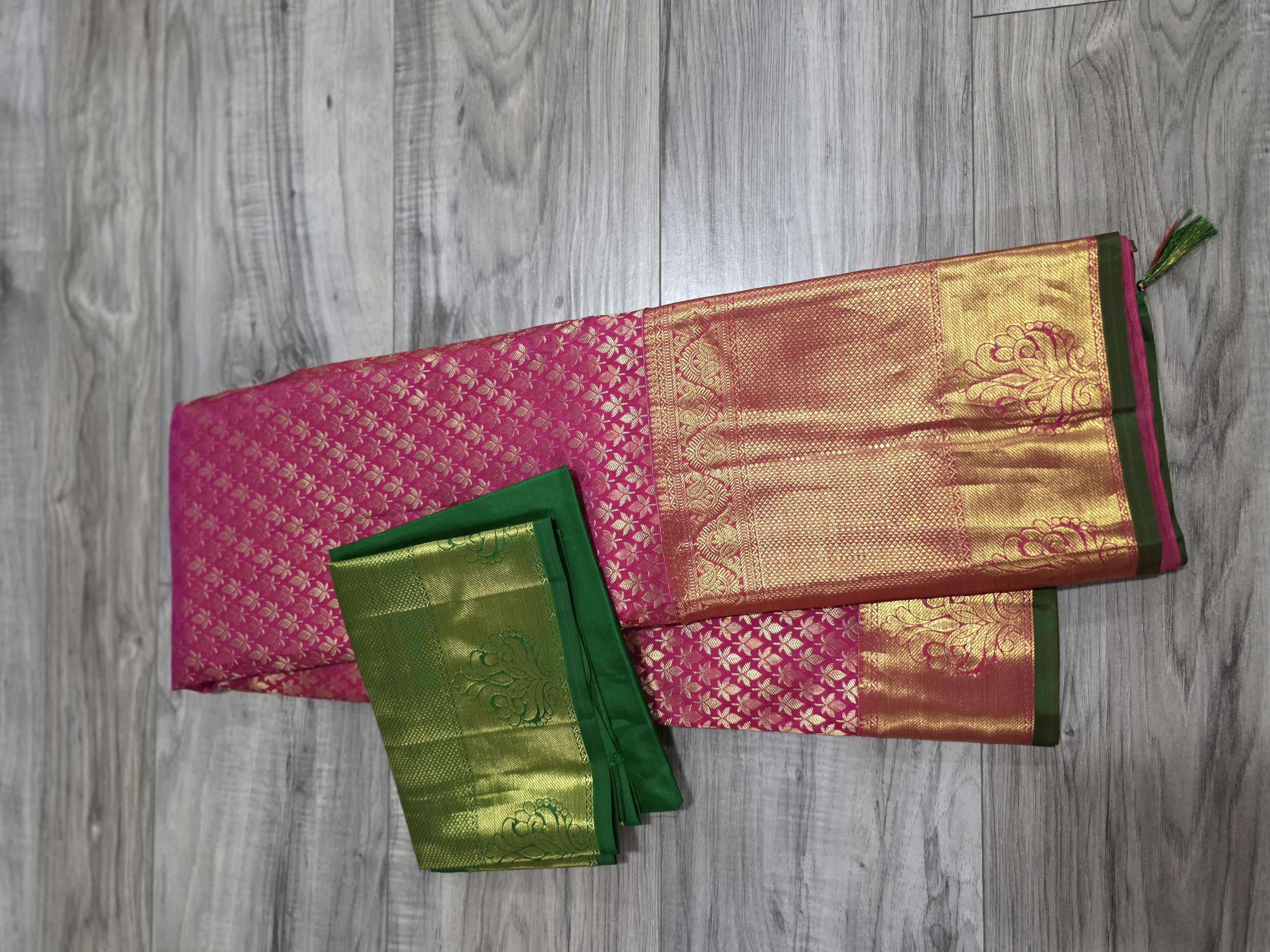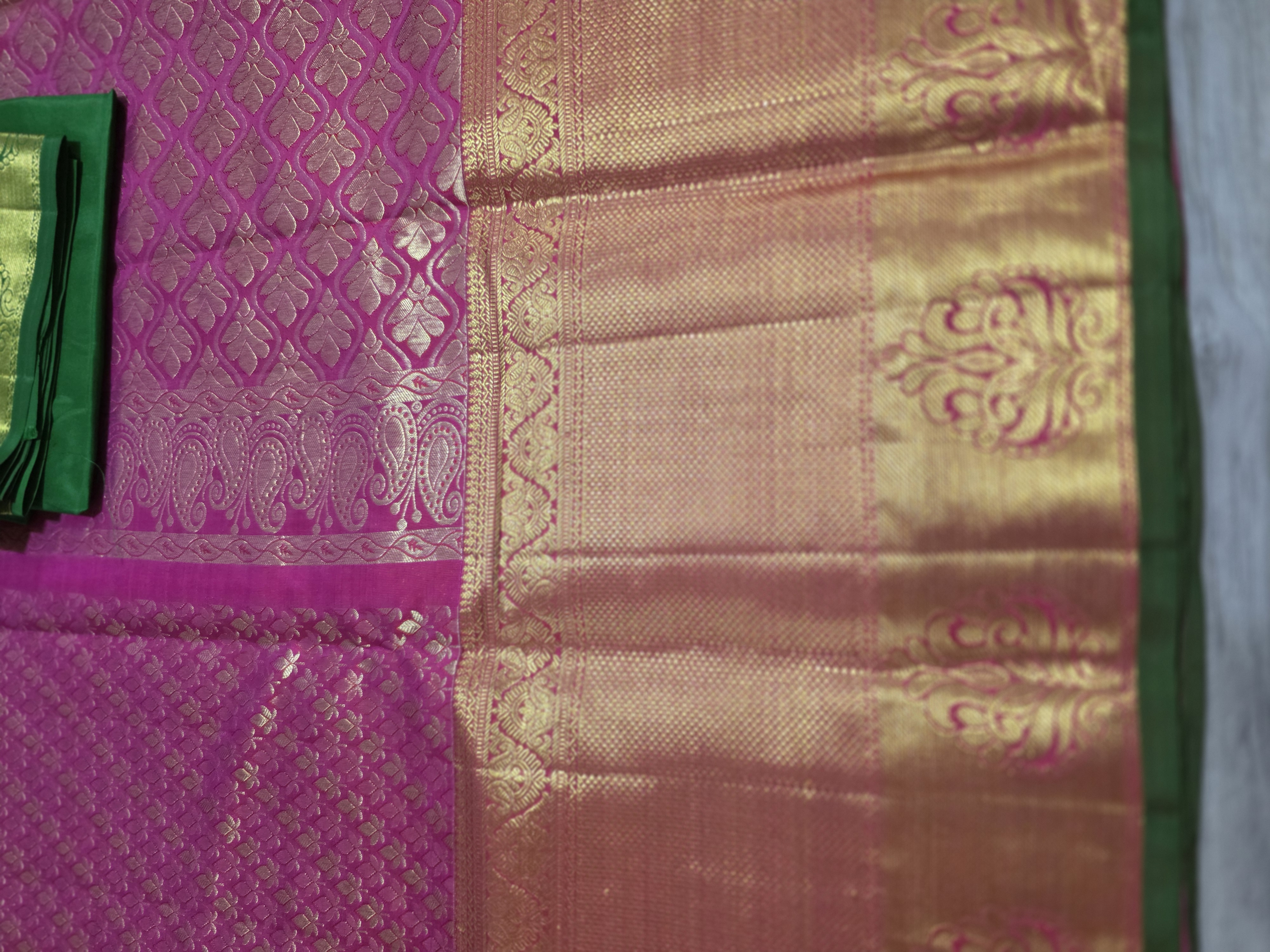 A pure Kanjivaram wedding sari is a symbol of South Indian bridal tradition, woven from rich mulberry silk with intricate gold or silver Zari work. Its hallmark is the distinct contrast border and pallu, often woven separately and seamlessly attached. Valued for its luxurious weight and heirloom quality, each sari is a masterpiece of handloom artistry with motifs inspired by temples and nature.