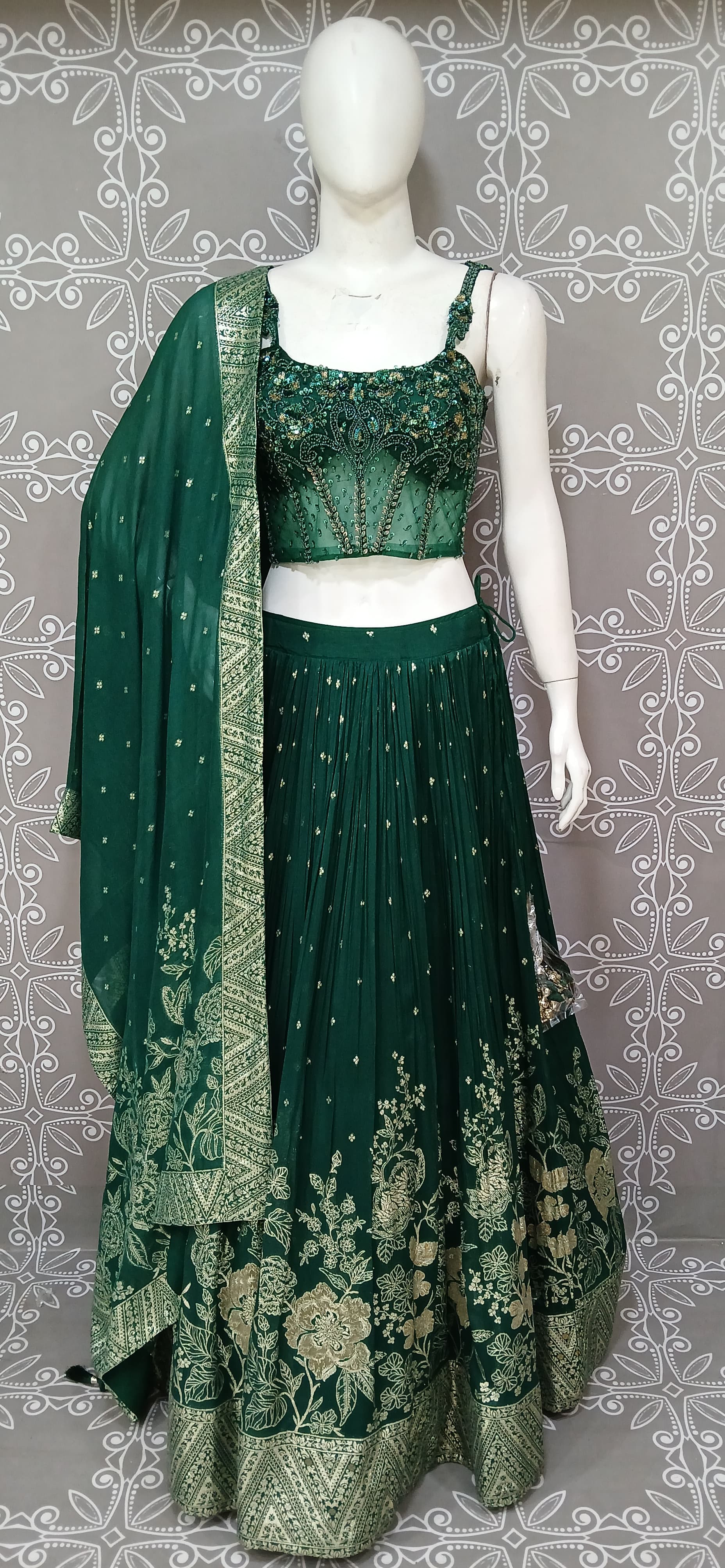 The first outfit is a vibrant emerald green. The crop top features a sheer, boned bodice with intricate beadwork. The pleated skirt has a gold floral pattern on the hem, and the set includes a matching sheer dupatta with a gold border. The second outfit is a deep magenta lehenga. The crop top has a structured, corset-style bodice with detailed gold beading. The skirt has gold, printed motifs and a wide, matching border, and the sheer dupatta is edged with a thick gold border.