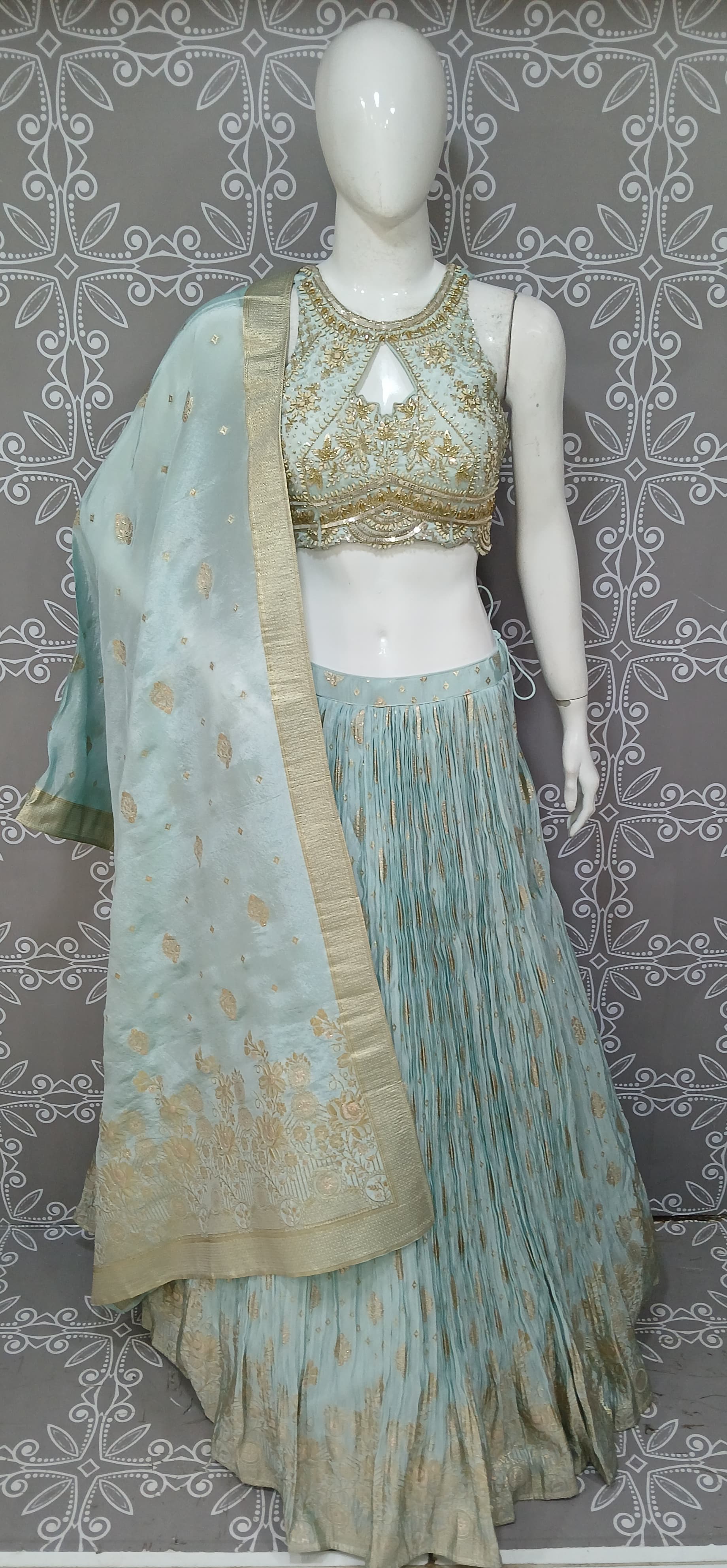 Both images display a similar style of lehenga set, featuring a heavily embellished gold crop top and a pleated, textured skirt with gold accents. The first outfit is a mint green lehenga. The sleeveless crop top has a high neckline with a cutout detail, gold zari weaving skirt A sheer dupatta with a wide gold border floral designs completes the ensemble The second outfit is a soft blush pink. It has a low-cut, V-neck crop top and a pleated skirt with small gold dots and a heavy gold embroidered hemline. The sheer blush dupatta is finished with a detailed gold border, mirroring the design on the skirt.
