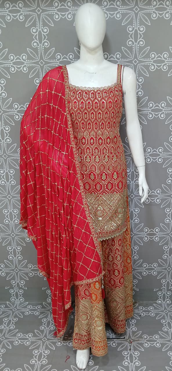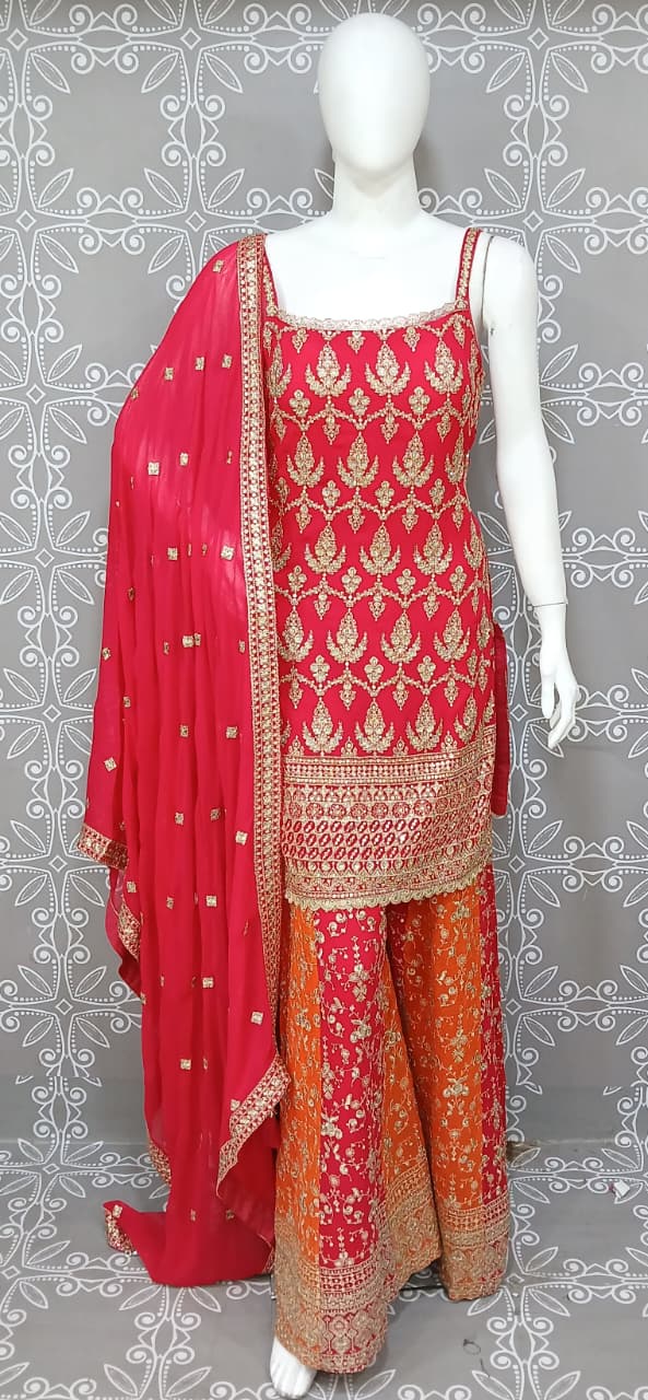 The outfit features a strappy, short-style kurta (tunic) in a vibrant rani pink or magenta hue, with intricate gold embroidery. The kurta is paired with wide-legged sharara pants that have an ombre effect, transitioning from orange to red. The entire set is detailed with heavy gold work, and a matching red dupatta with a gold embroidered border is draped over the shoulder.