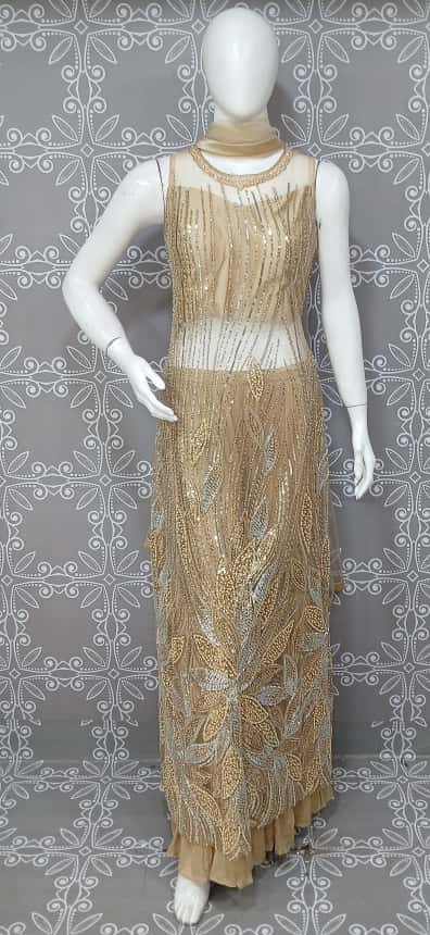 This is a sophisticated Indo-Western ensemble,featuring a heavily embellished, sleeveless, long-line top with a sheer midriff section. The garment is adorned with a detailed, intricate pattern of beading and embroidery, resembling vines or leaves, which extends down the entire length of the top. The outfit is shown in two different colors: a gold-toned beige and a cool-toned grey. The overall style is elegant and modern, with a focus on detailed surface embellishment.