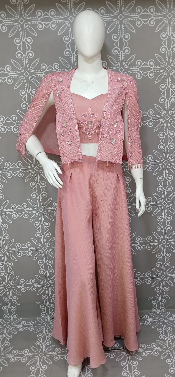 This is a three-piece Indo-Western fusion outfit. It consists of a cropped, sleeveless bustier or top with a sweetheart neckline and intricate embroidery. This is paired with wide-legged, flowing palazzo-style pants. The ensemble is completed with a short, open jacket with cape-style sleeves, which is heavily embellished with beading and embroidery. The outfit is presented in two different colors: a soft, light pink and a pale, creamy beige. The look is modern, stylish, and suitable for a semi-formal or festive event.