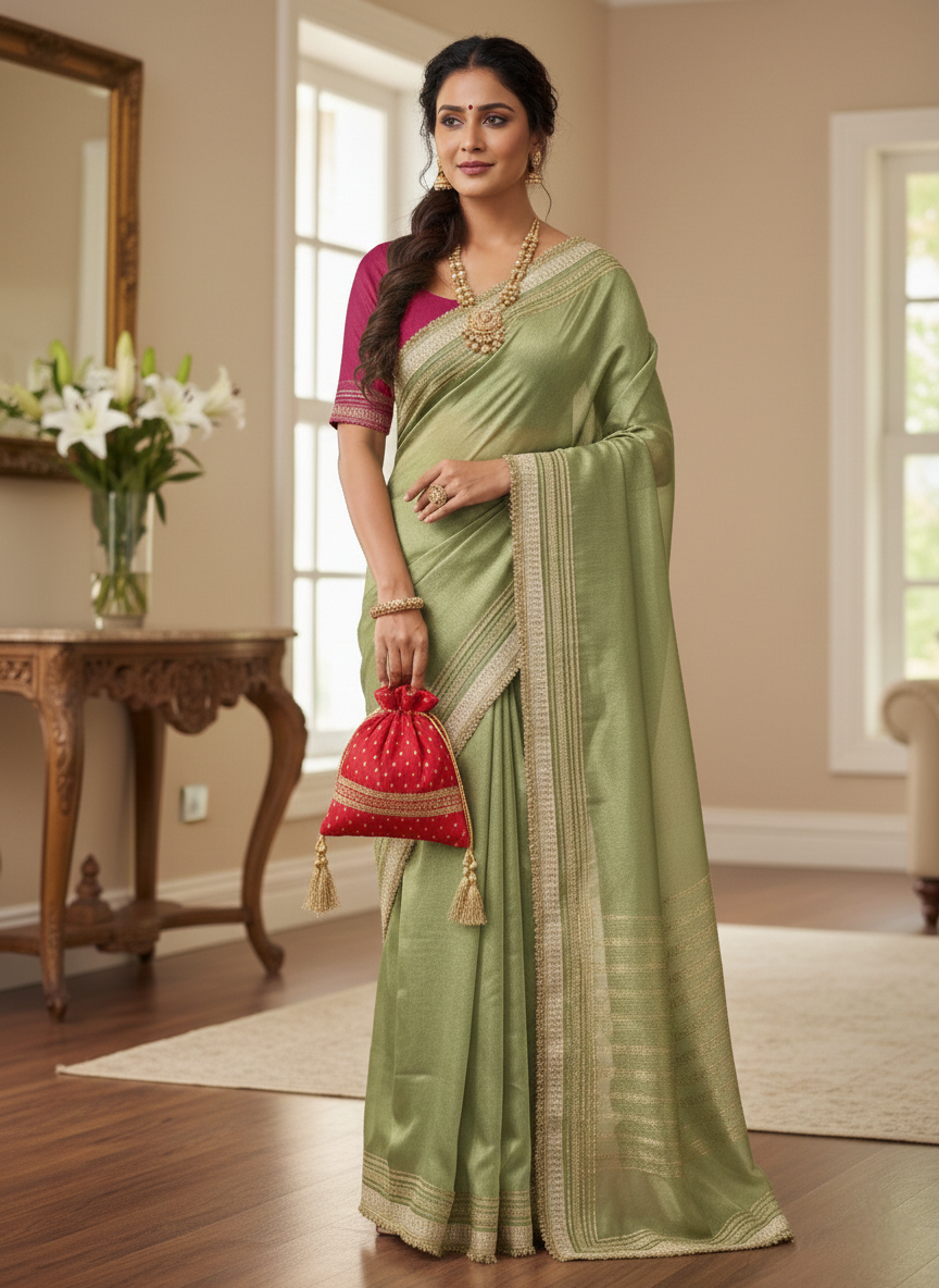 This is a beautiful three-piece outfit in a rich orange color, featuring a long tunic with a textured pattern. The v-neckline is heavily embroidered and adorned with tassels, while the tunic itself has a subtle, repeated geometric pattern. It is paired with matching trousers and a flowing dupatta with a gold border.