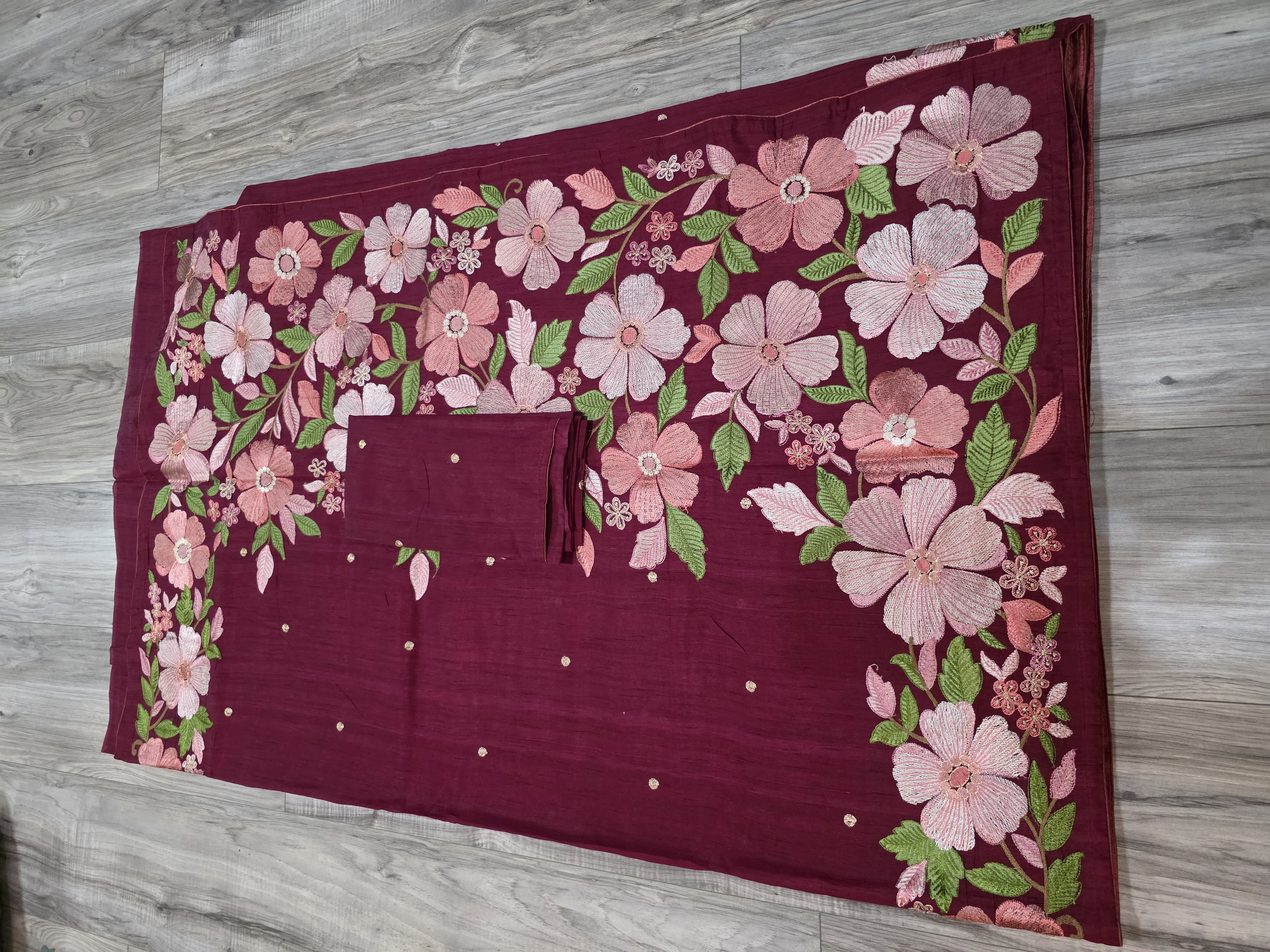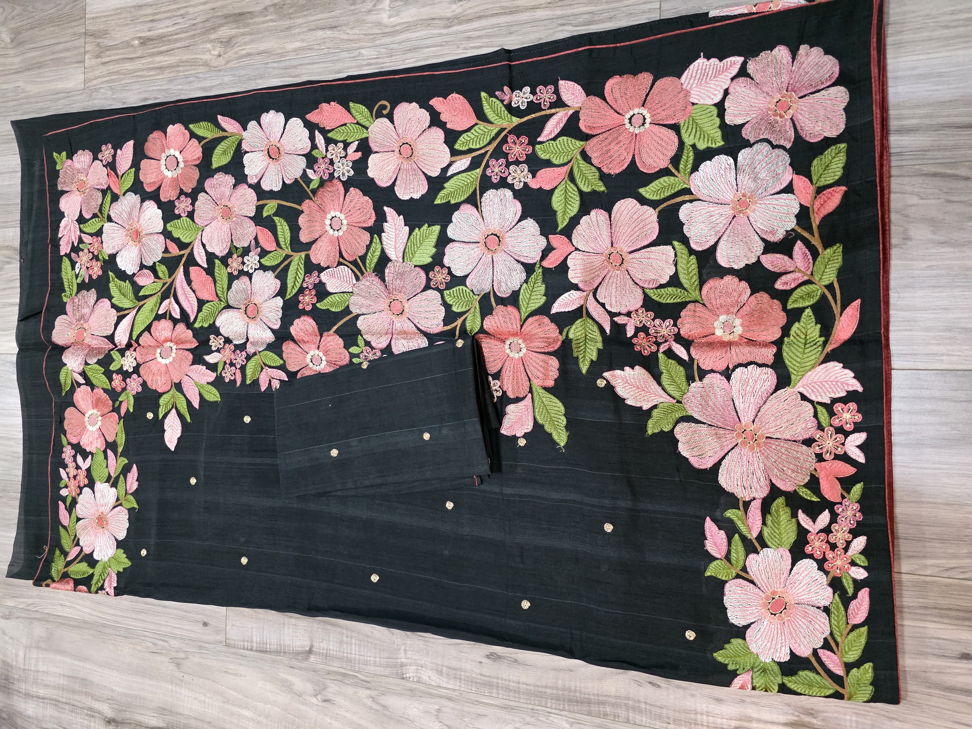 The top sari is a dramatic deep black fabric, semi tussar-silk, embellished with a prominent border of pink and pale blush flowers accented by green leaves. The bottom set is a rich maroon or deep wine fabric, complementing the black with slightly wider border of light pink, coral, and pastel green floral embroidery. Both sari fabric are subtle self-woven texture and are dotted with small, discrete metallic embellishments (likely bootis or small dots) scattered across the body, offering a lovely contrast between the dark, textured base and the delicate, colorful threadwork.