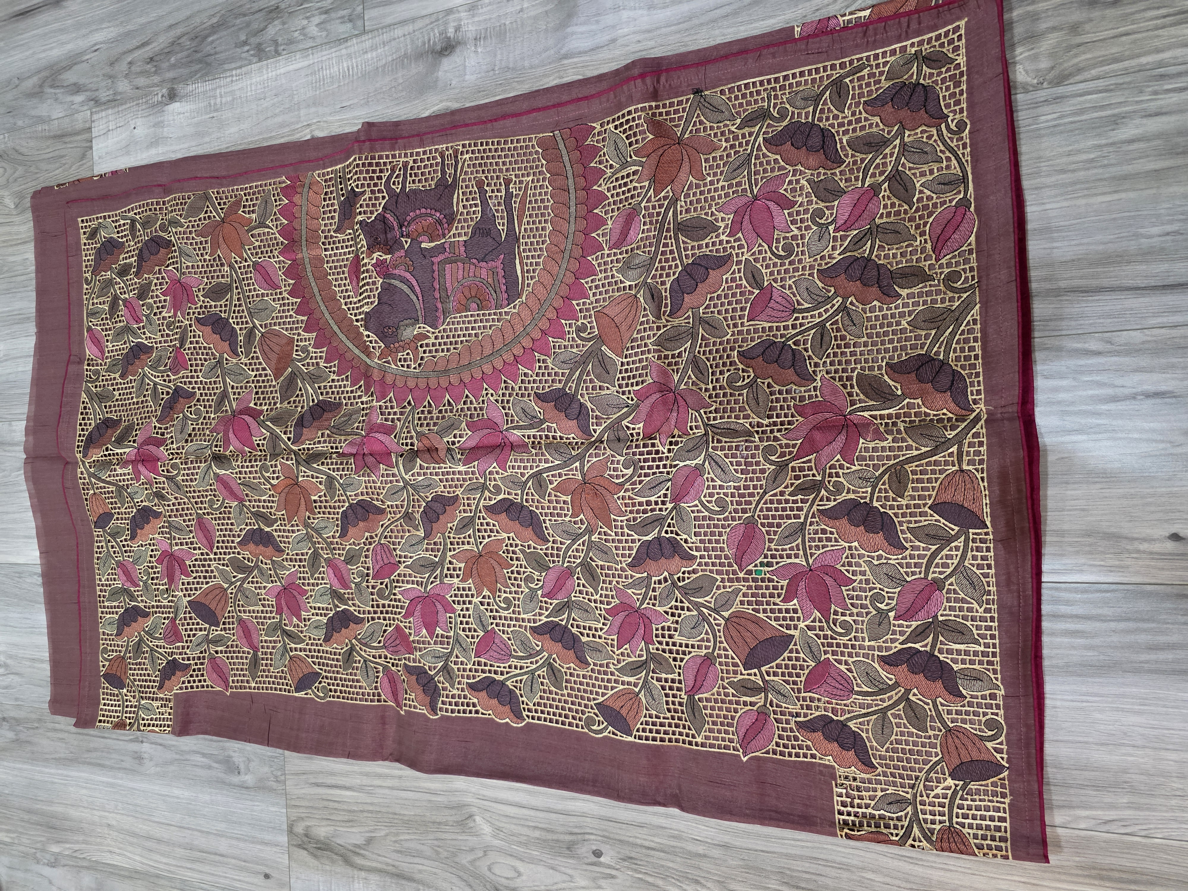 This striking piece is a machine embroidered madhubani style sari , known for its traditional and intricate artistry. The fabric itself is a deep mauve or earthy rose tone, which is completely covered by a dense, beautiful design. A focal point is a large, semicircular medallion on the pallu (decorative end), —framed by concentric pink and brown circles. The entire design is contained within a solid mauve border, making this a rich, statement piece that celebrates traditional Indian textile arts.