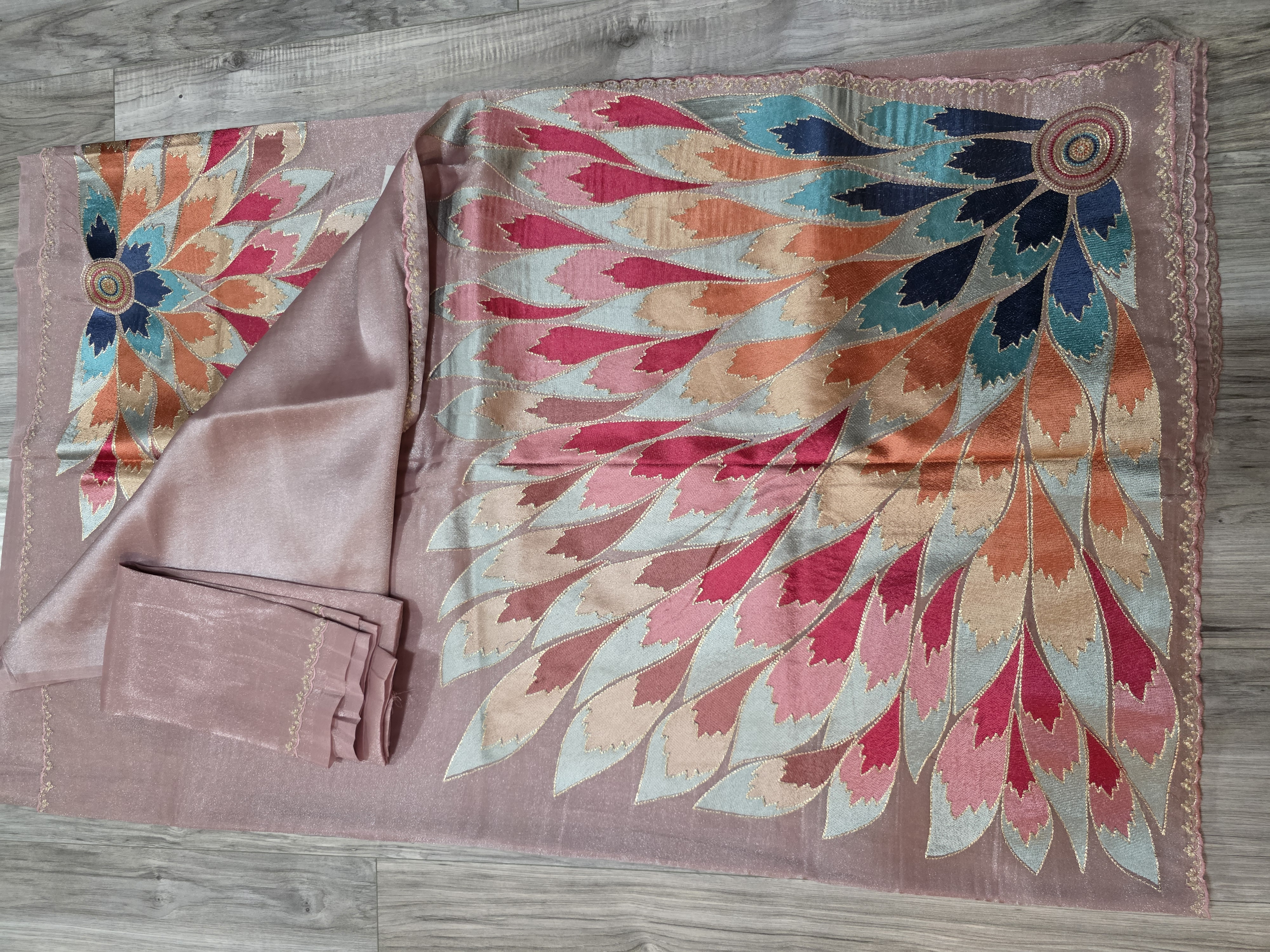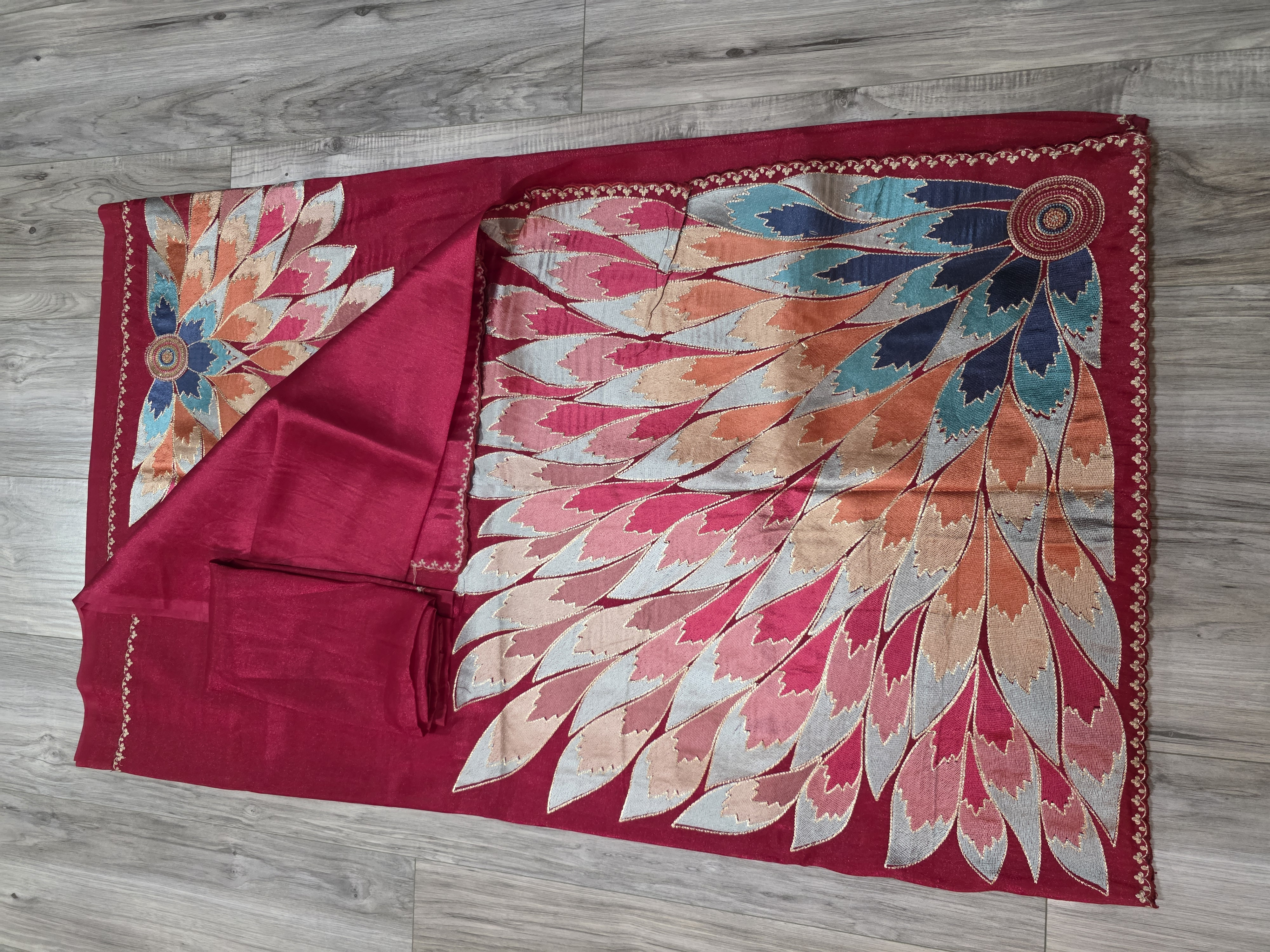 This photograph displays a pair of incredibly vibrant and ornate saris seemingly featuring a bold, contemporary design woven or embroidered onto a rich fabric. Each sari showcases a massive fan or peacock feather motif composed of large, overlapping tear-drop shapes in striking colors like ruby red, deep blue, coral, mustard, and pink, giving it a shimmering, metallic finish.