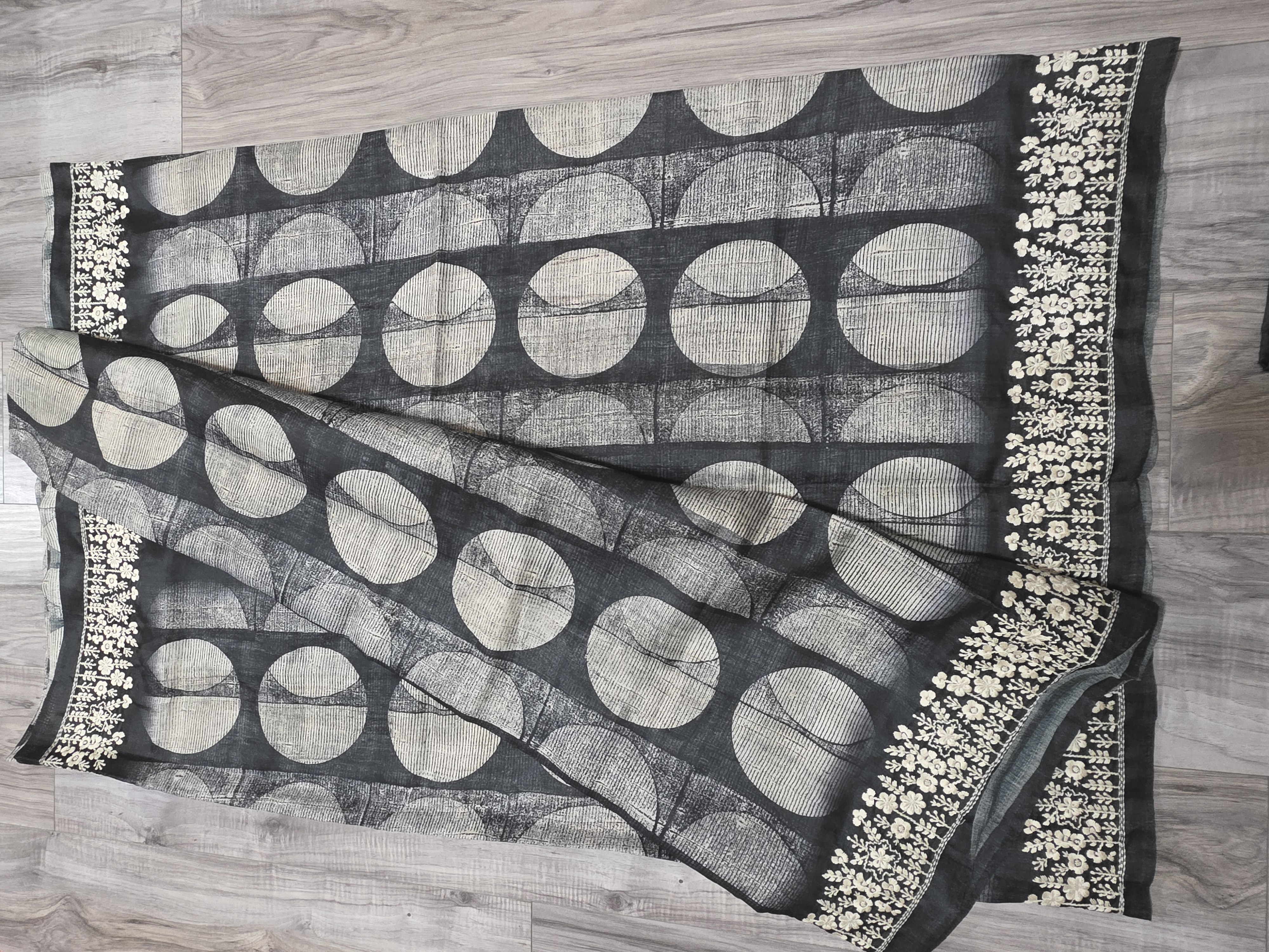 This sophisticated sari set contrasts modern and traditional elements in a striking black and white palette. The body of the fabric, possibly the pallu or center panel, features fine white embroidery with scattered floral clusters, framed by a deep, ornate border of continuous floral motifs. The main sari portion is a bold, contemporary digital or block print of large, overlapping white and grey circles, giving the piece a dramatic, graphic appeal.