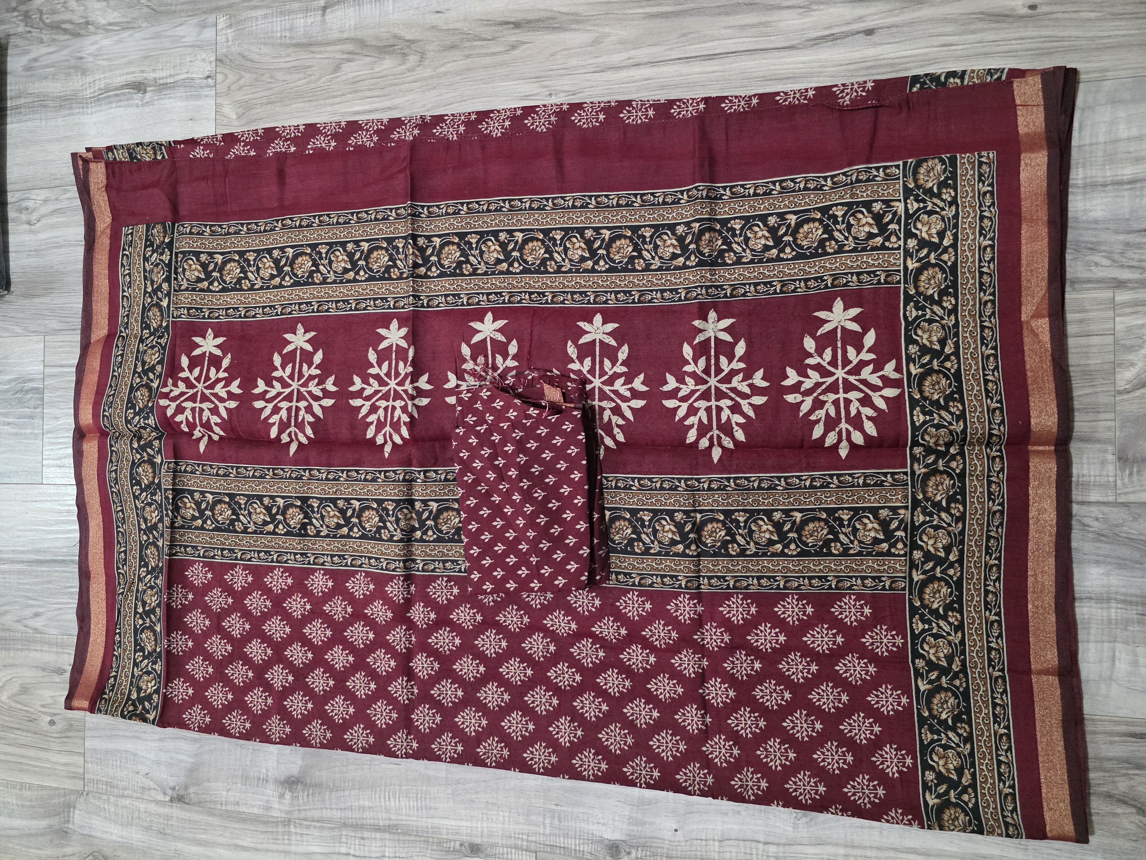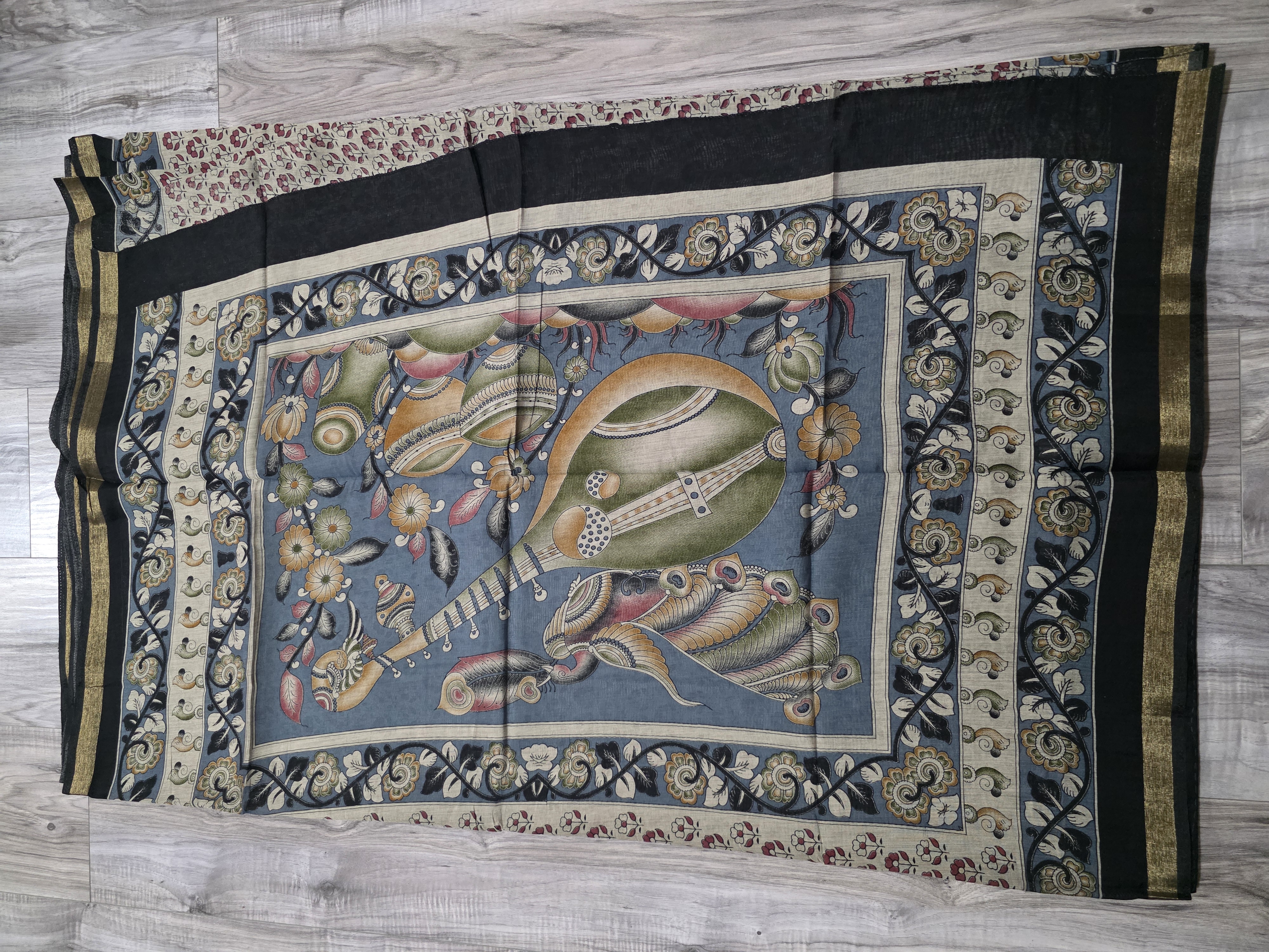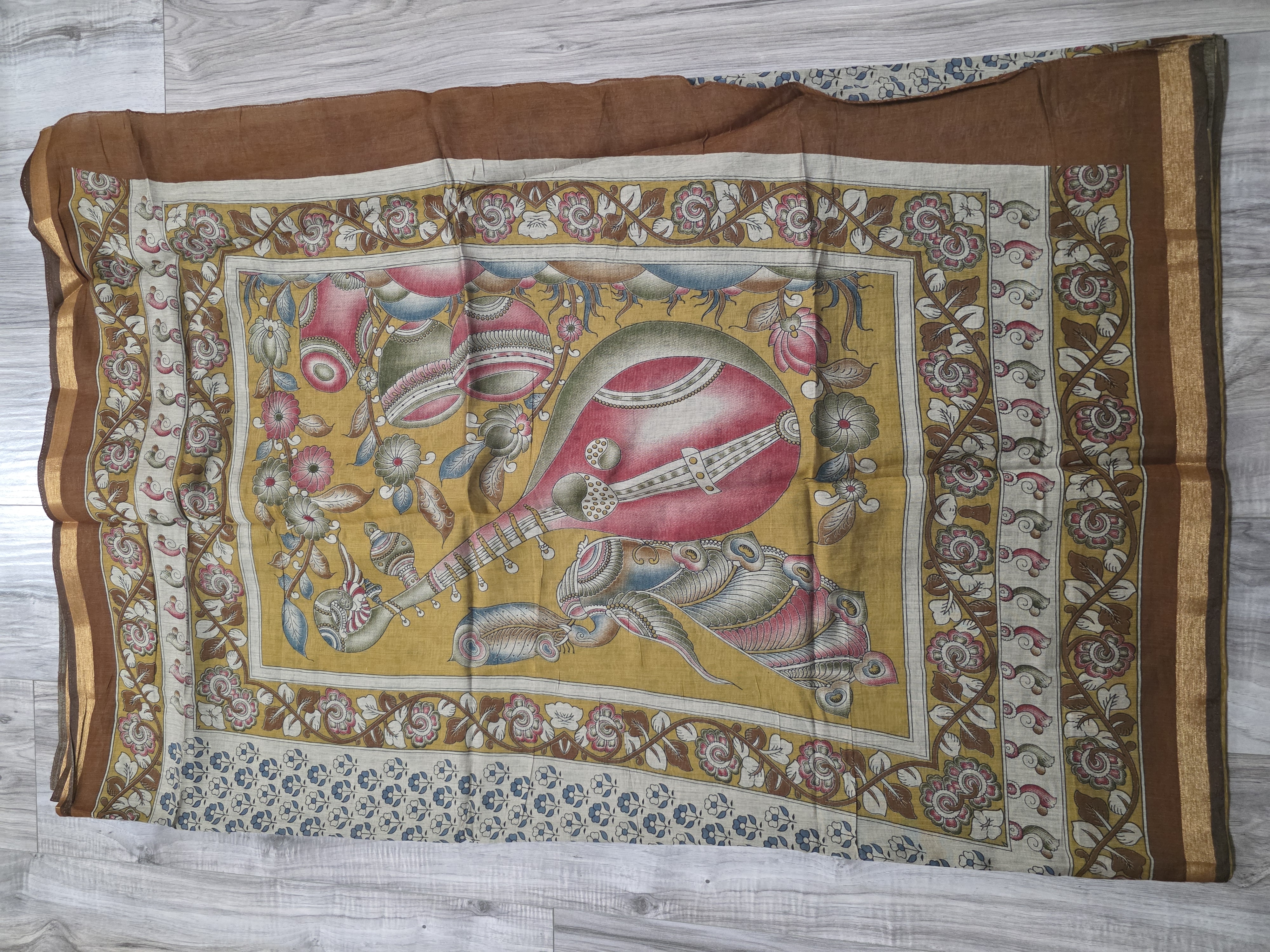 This is a beautiful collection of printed saris, likely in the traditional Kalamkari or block print style, characterized by earthy and traditional motifs. The designs feature a variety of patterns, including small, repeating all-over buta (motifs) and large, ornate border panels. Two standout pieces showcase large Kalamkari-style central panels depicting musical instruments and foliage in warm colors, framed by detailed vine borders. The color palettes are rich, dominated by maroon, beige, deep brown, and black, often accented with gold trim for a classic and elegant ethnic aesthetic.