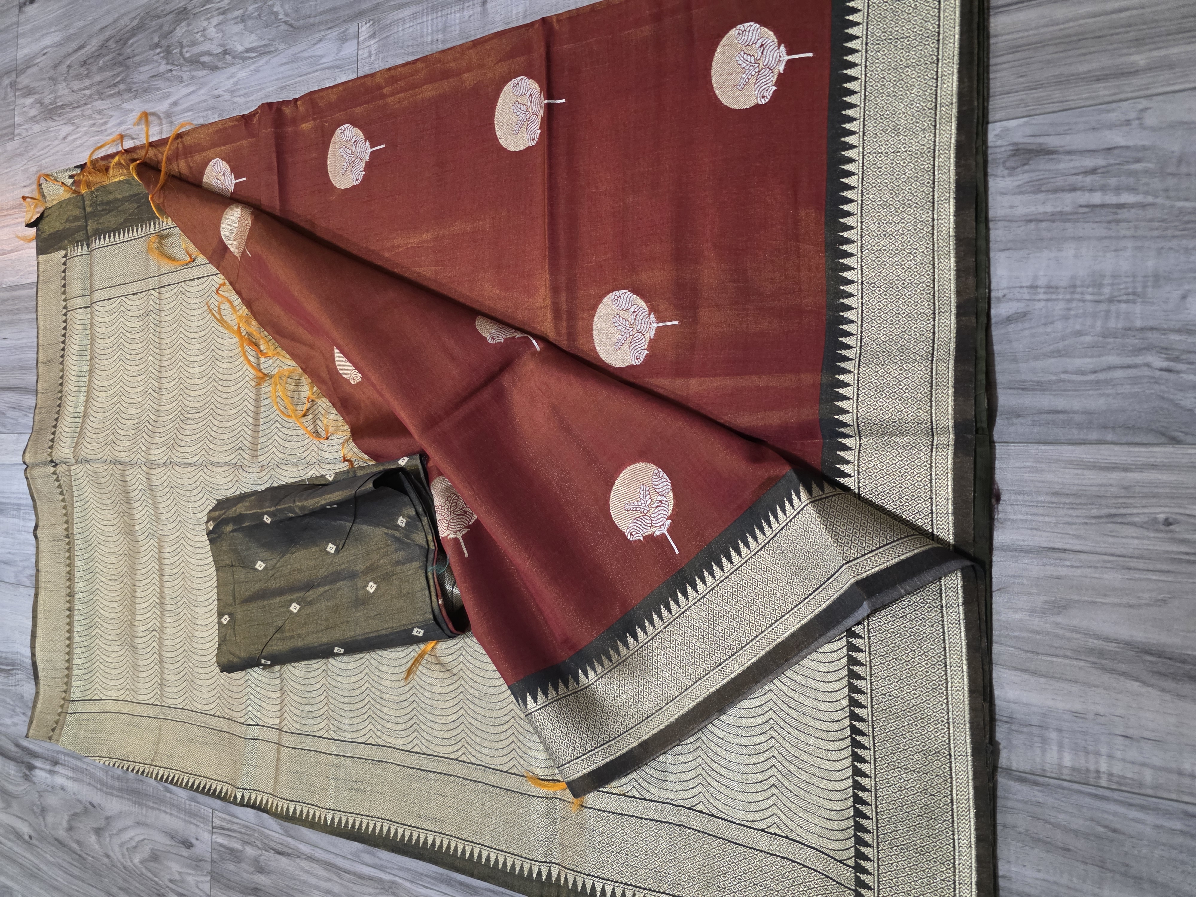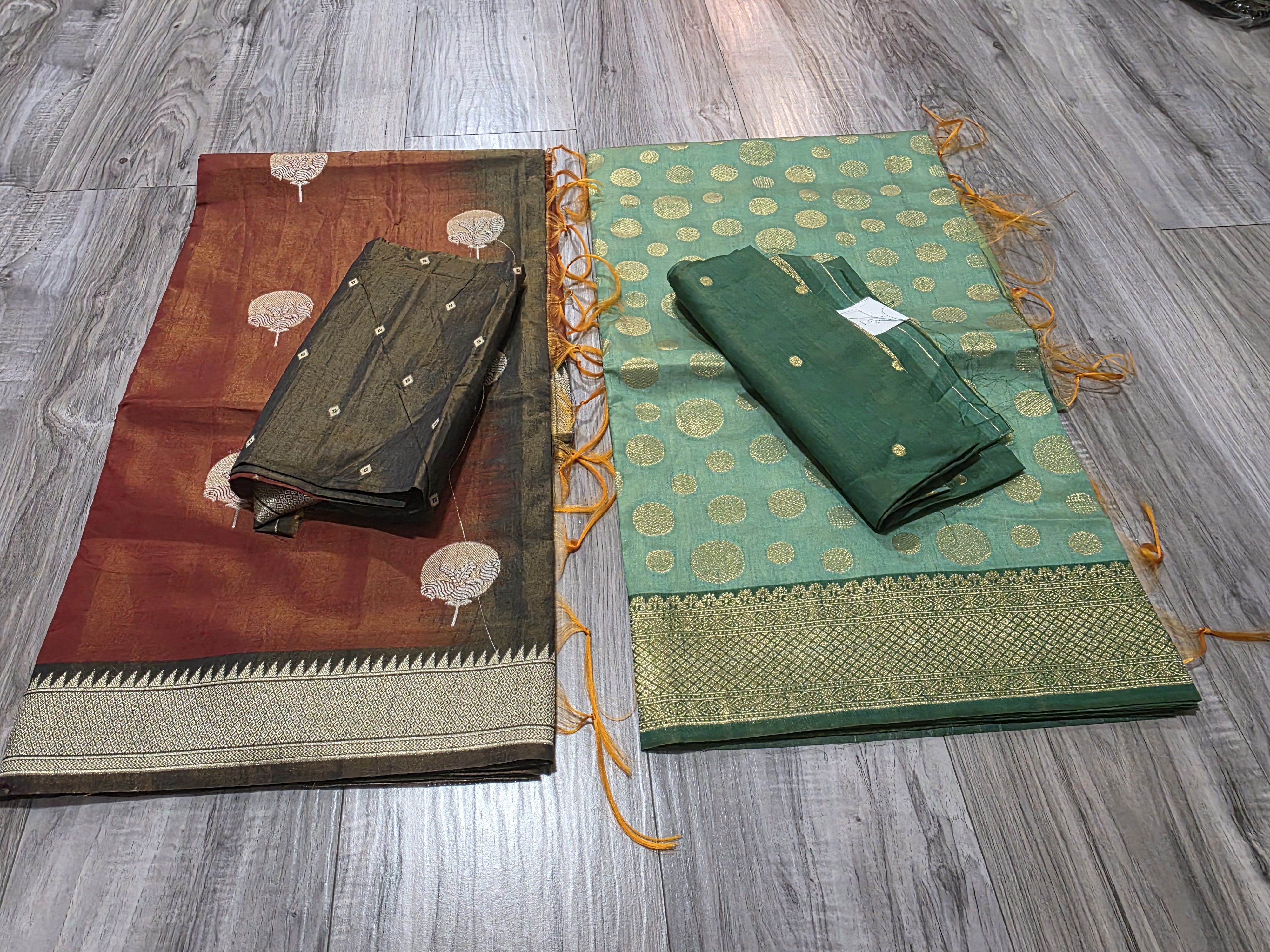 This image features a pair of elegant saris, blending classic motifs with rich color contrasts. The left sari is a striking combination of deep reddish-brown or rust with a textured sheen, decorated with large, woven white circular tree motifs and a traditional gold geometric border. The right sari is a beautiful mint green or light seafoam color, embellished with scattered gold circular motifs (butas) and anchored by a wide, heavy gold woven brocade border. Both saris are finished with colorful tassels and include a contrasting blouse piece, suggesting a sophisticated, festive style.