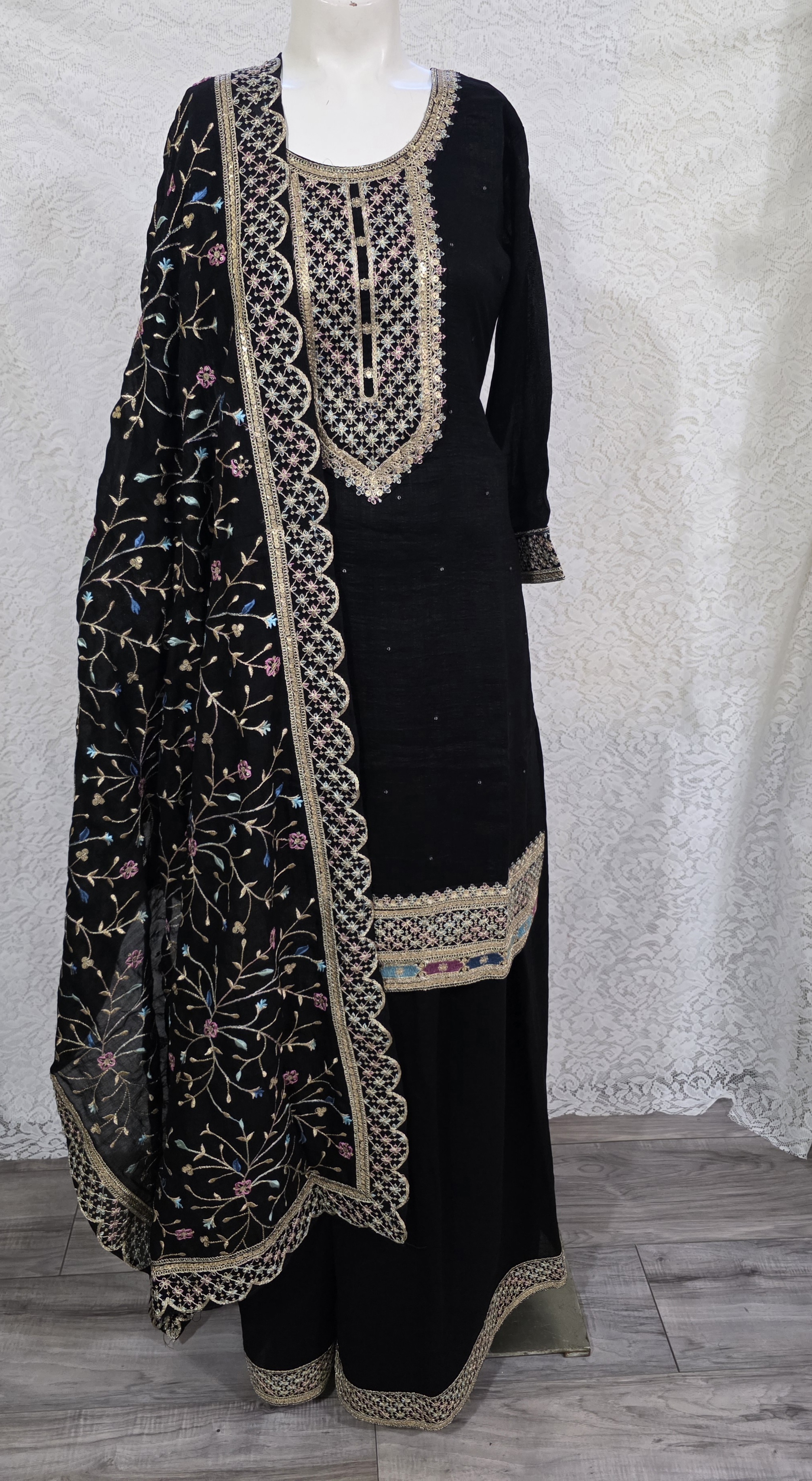 This black kurta with sharara and dupatta are made in very soft silk blend fabric with zari, thread embroidery and sequin work all over the dupatta, kurta and sharara