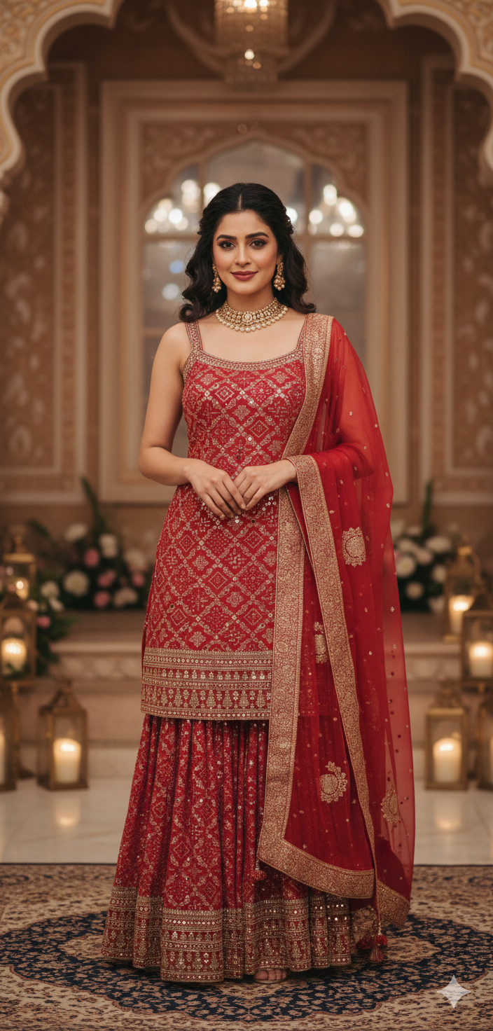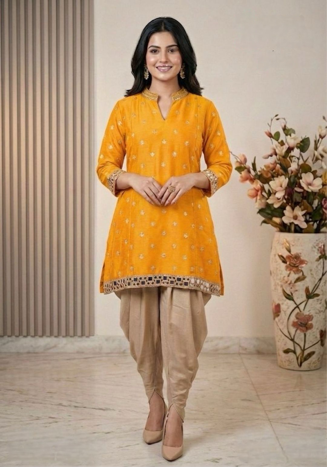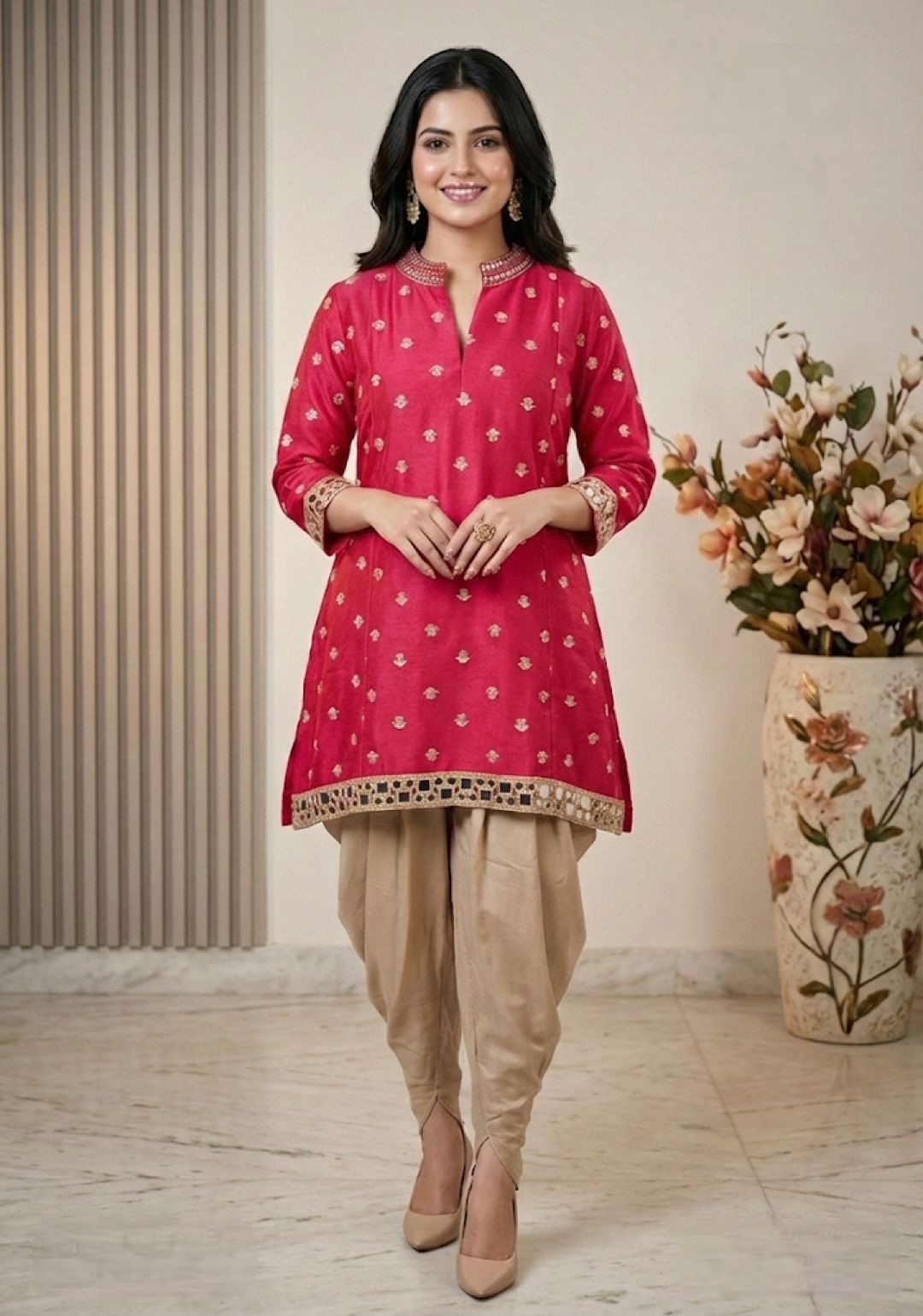 A vibrant silk kurti featuring intricate gold border work paired with elegant beige dhoti pants.