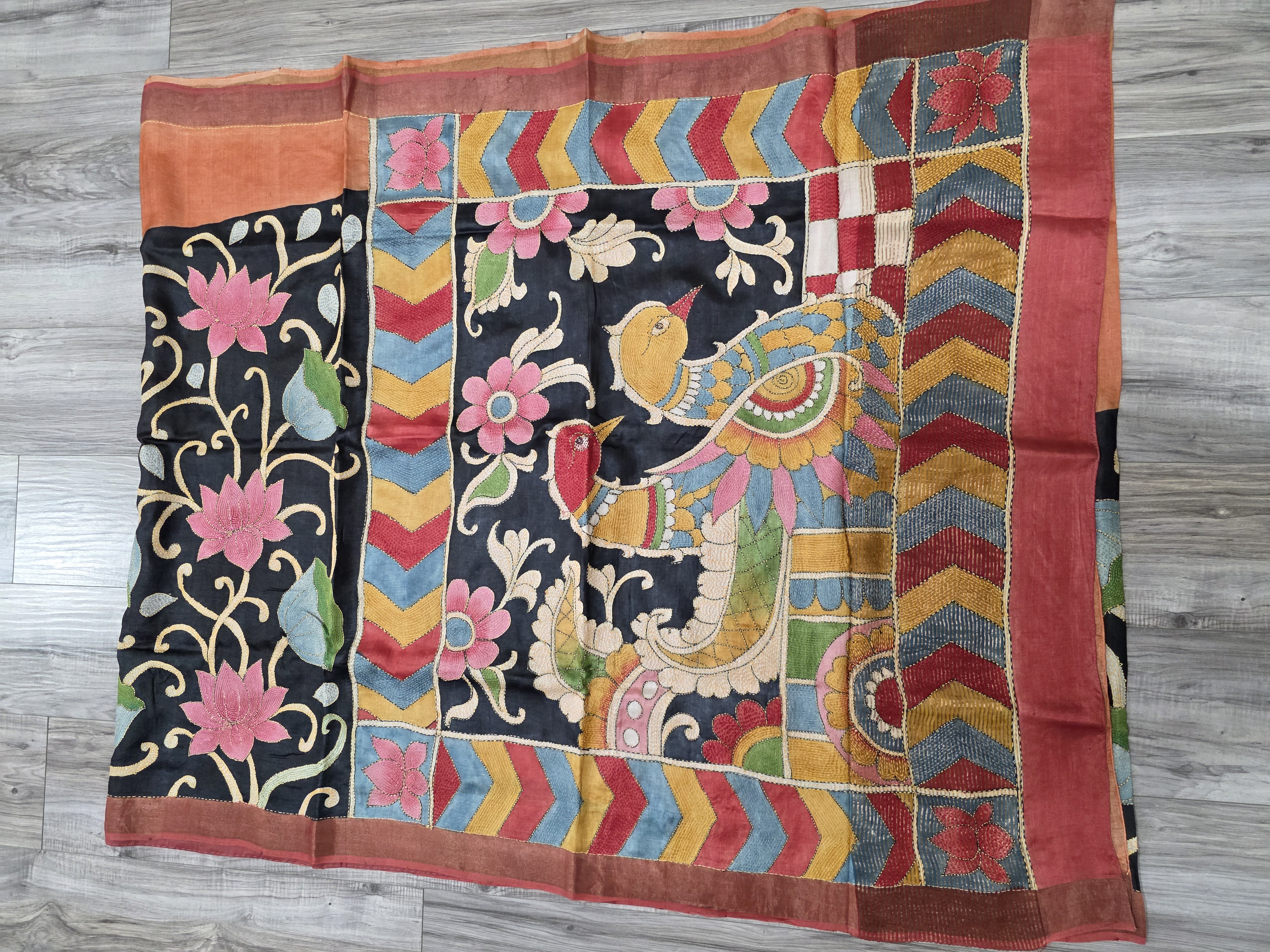 This sophisticated beige silk-blend kurta set features colorful geometric embroidery on the yoke and side slit, paired with matching straight trousers and a delicate scalloped-edge dupatta.