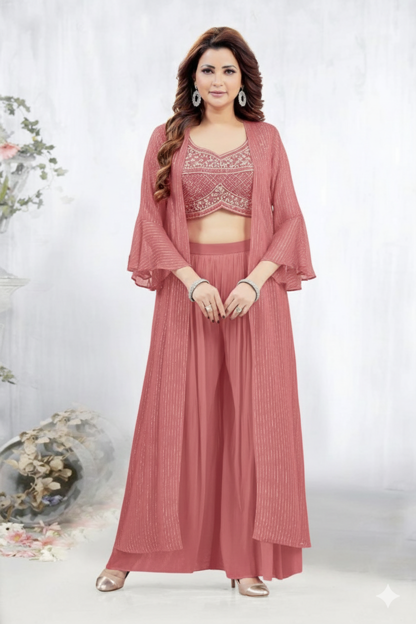 This is a sophisticated dusty rose Indo-western ensemble featuring a shimmering floor-length jacket with bell sleeves, an intricately embroidered sweetheart crop top, and matching high-waisted wide-leg trousers
