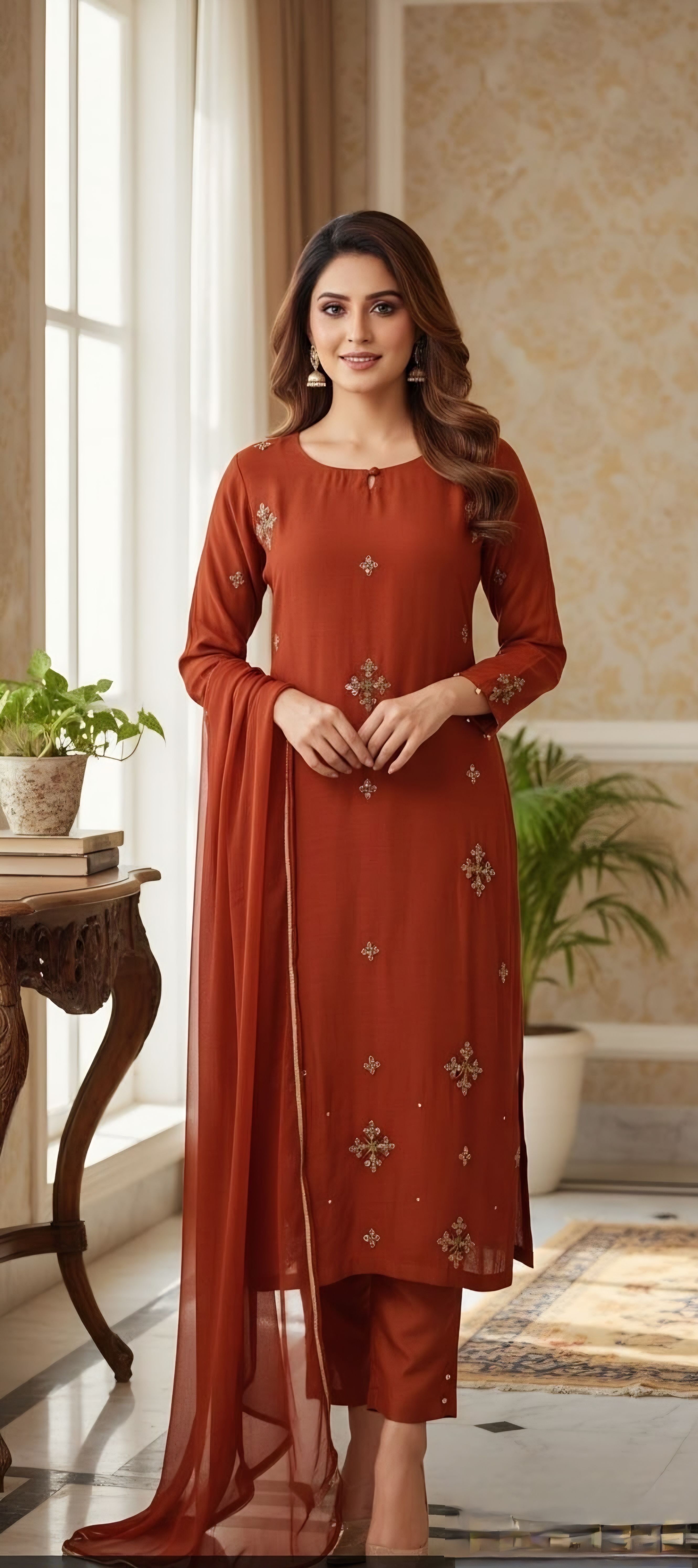 An elegant burnt-orange Indo-western ensemble featuring a heavily gold-embroidered sleeveless peplum tunic with a front slit, paired with matching wide-leg flowy palazzo pants.