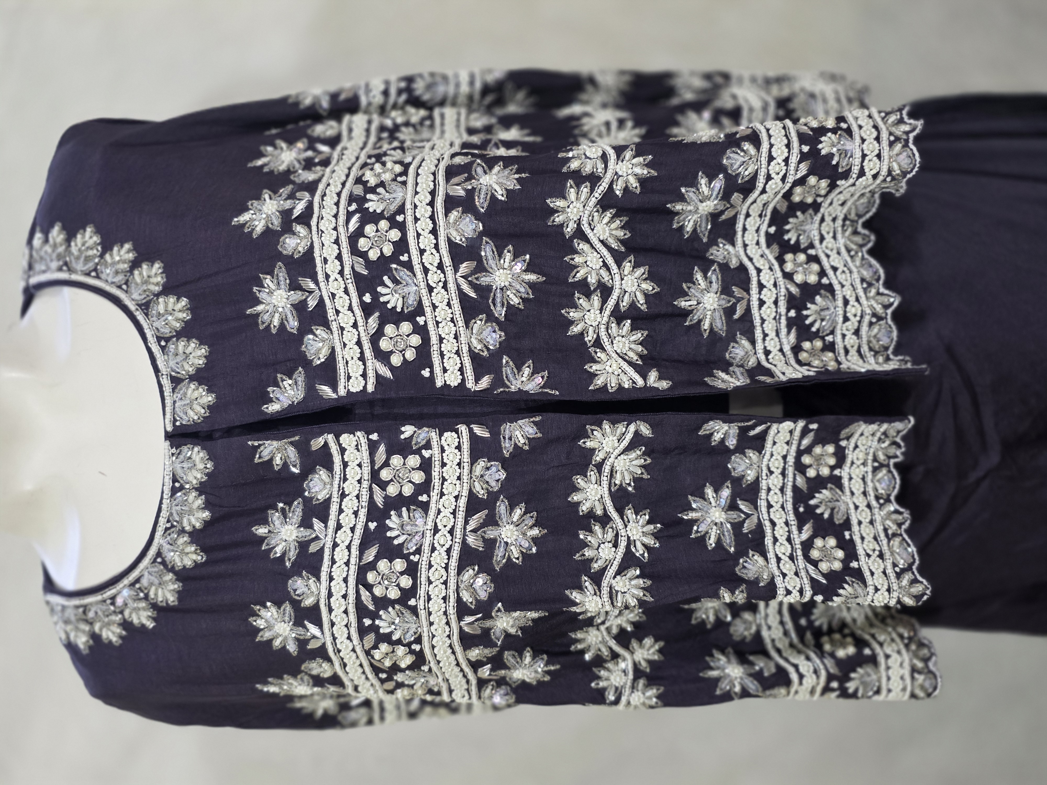 This outfit is an elegant, floor-length dusty lilac lehenga-style gown featuring a sleeveless cape style top intricately adorned with sequins and a skirt . Hand work done using pearls, kutdana and zardosi.